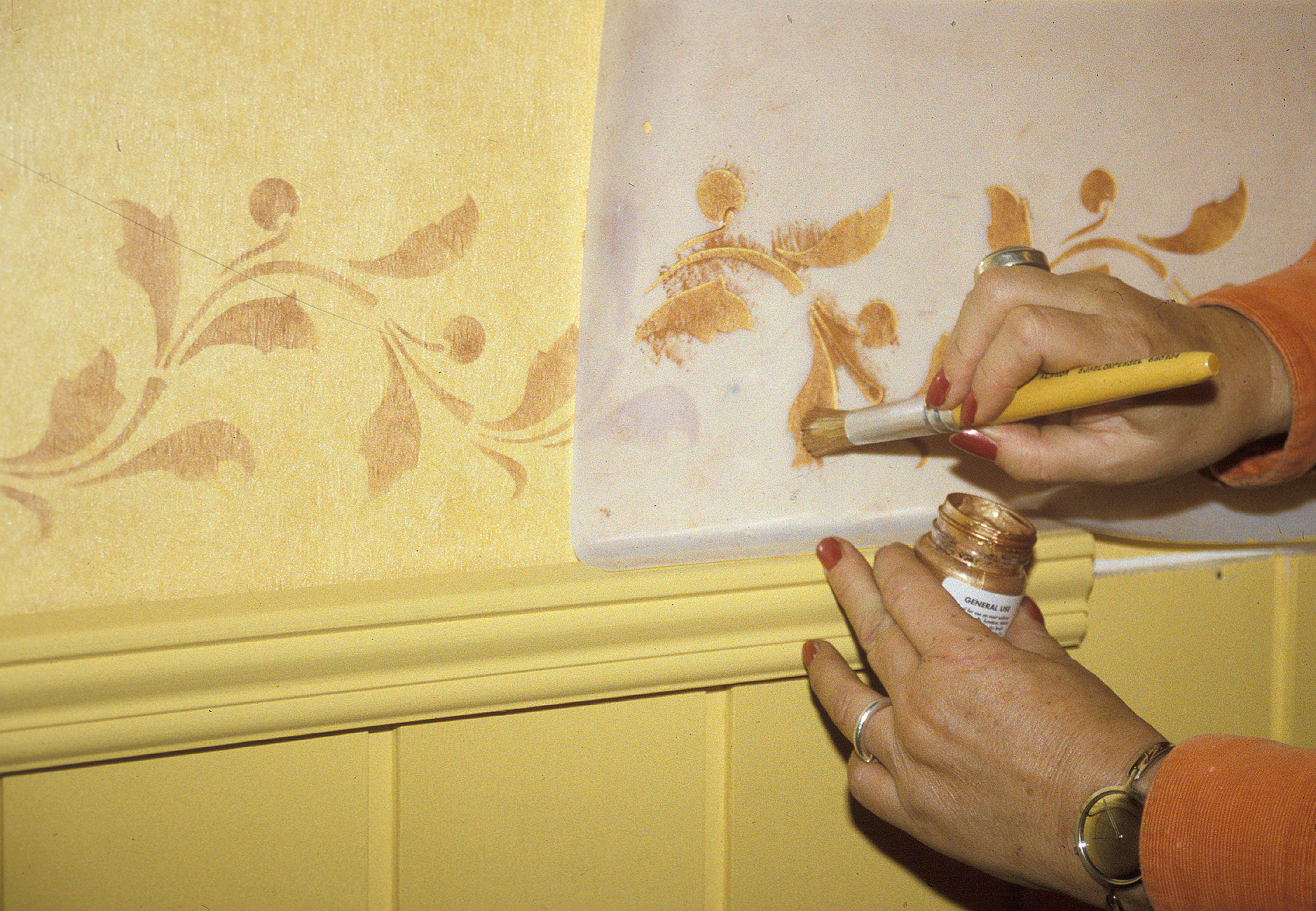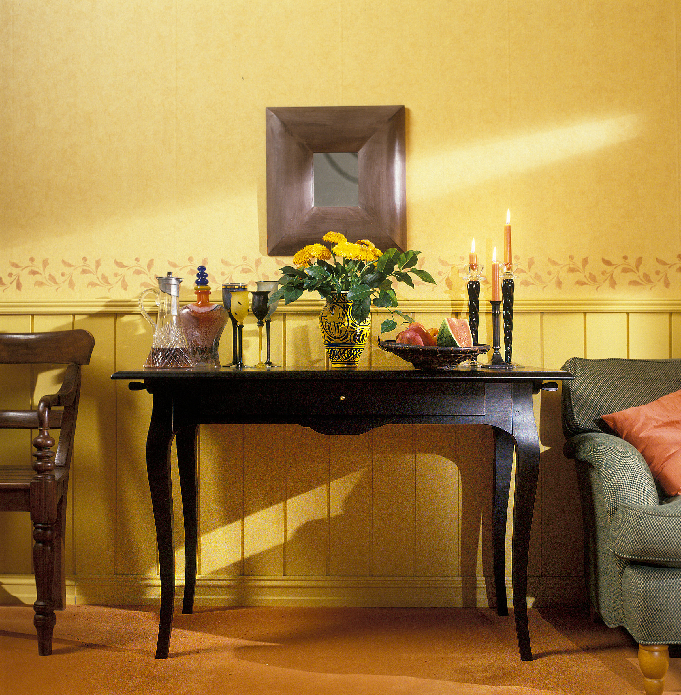 Heldekkende velurteppe gjør gulvet og rommet varmt og mykt. Brystpanel og fibertapet er holdt i samme grønntone, mens panelet er litt dypere. Dør og lister er i samme farge som brystningen. Tapetet er et fibertapet som vi her har malt med sjablonmønster. De tunge gardinene samler vegg- og gulvfargene og har et frodig mønster. Bronsestengene som avslutter med smilene solfjes understreker den gylne stilen.