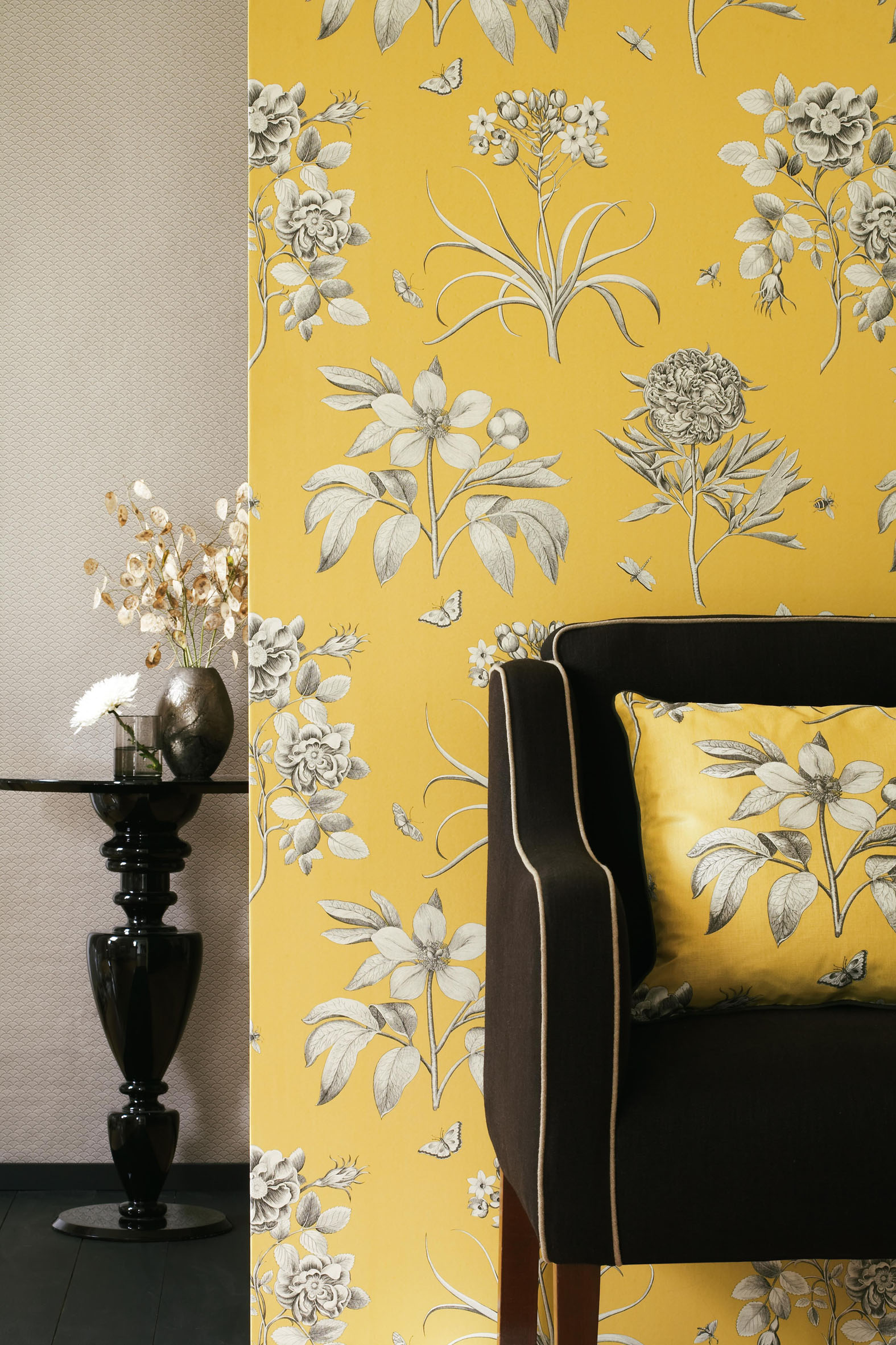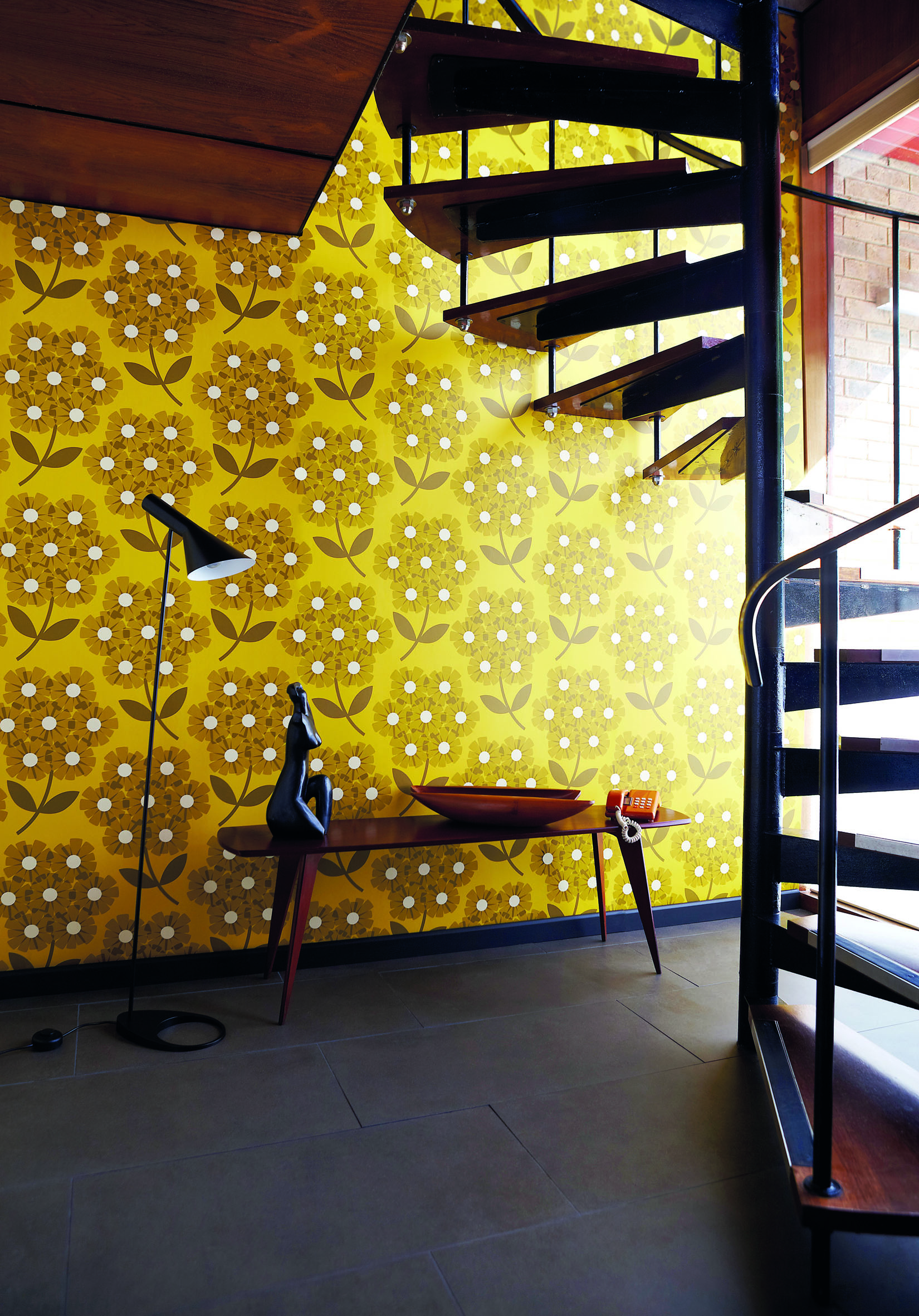 På tapet og tekstiler er det gjerne mer dempede og lunere toner som er aktuelle. En vintage sennepsgul er vår favoritt! Den mettede, sennepsgule fargen sender tankene til de solide 1950-tallsmøblene i kraftig ullstoff.