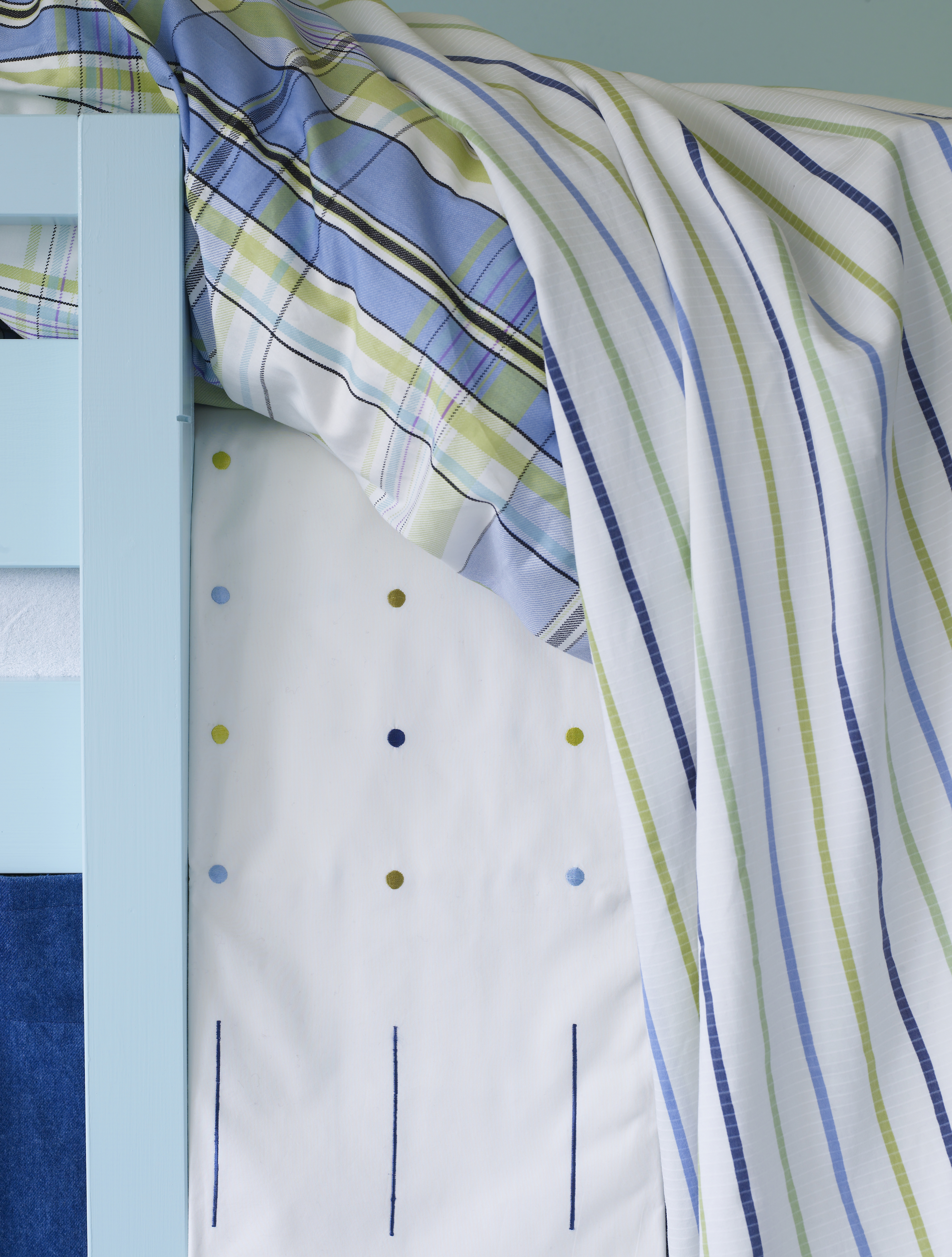Jobben ble ikke akkurat lettere ved at Sigurd insisterte på svart gummigulv og bildekk som sitteplasser. Han fikk det svarte gummigulvet mot å gå med på å male furuveggene lyse og at furutaket skulle males helt hvitt. - Ellers hadde rommet blitt altfor mørkt og tungt med de små vinduene, mener Ellen S. Lønnestad. Hun insisterte på en kjølig blåfarge på veggene, og Sigurd gikk inn for skjært turkis. For at rommet ikke skulle tippe over til å bli for søtt med de lyse veggene - det søte var Sigurds skrekk - valgte interiørarkitekten kraftig deminstoff på sofa og garderobeforhenget under sengen. Svartmalte hyller understreker at her bor det en gutt i tenårene. - Nå mangler jeg bare en liten hylle til vannglasset ved senga, konstaterer han fornøyd.