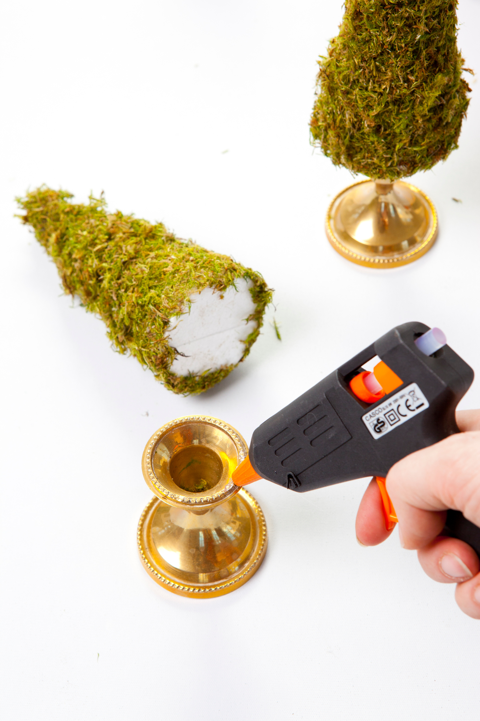 Lysestaker i valgfritt materiale (våre er av messing), isoporkjegler, mose, limpistol og Casco Smeltelim. En saks kan også komme godt med.