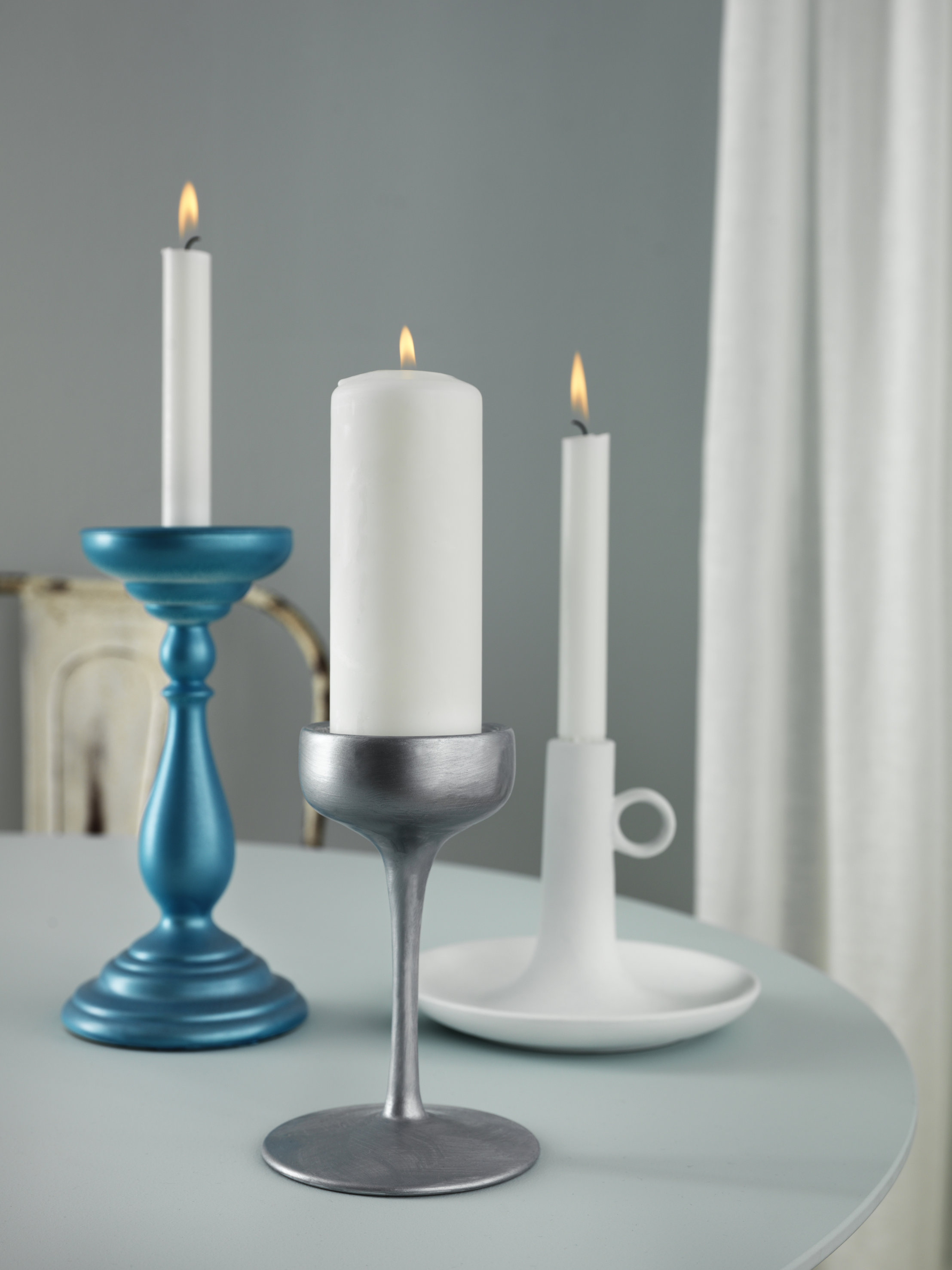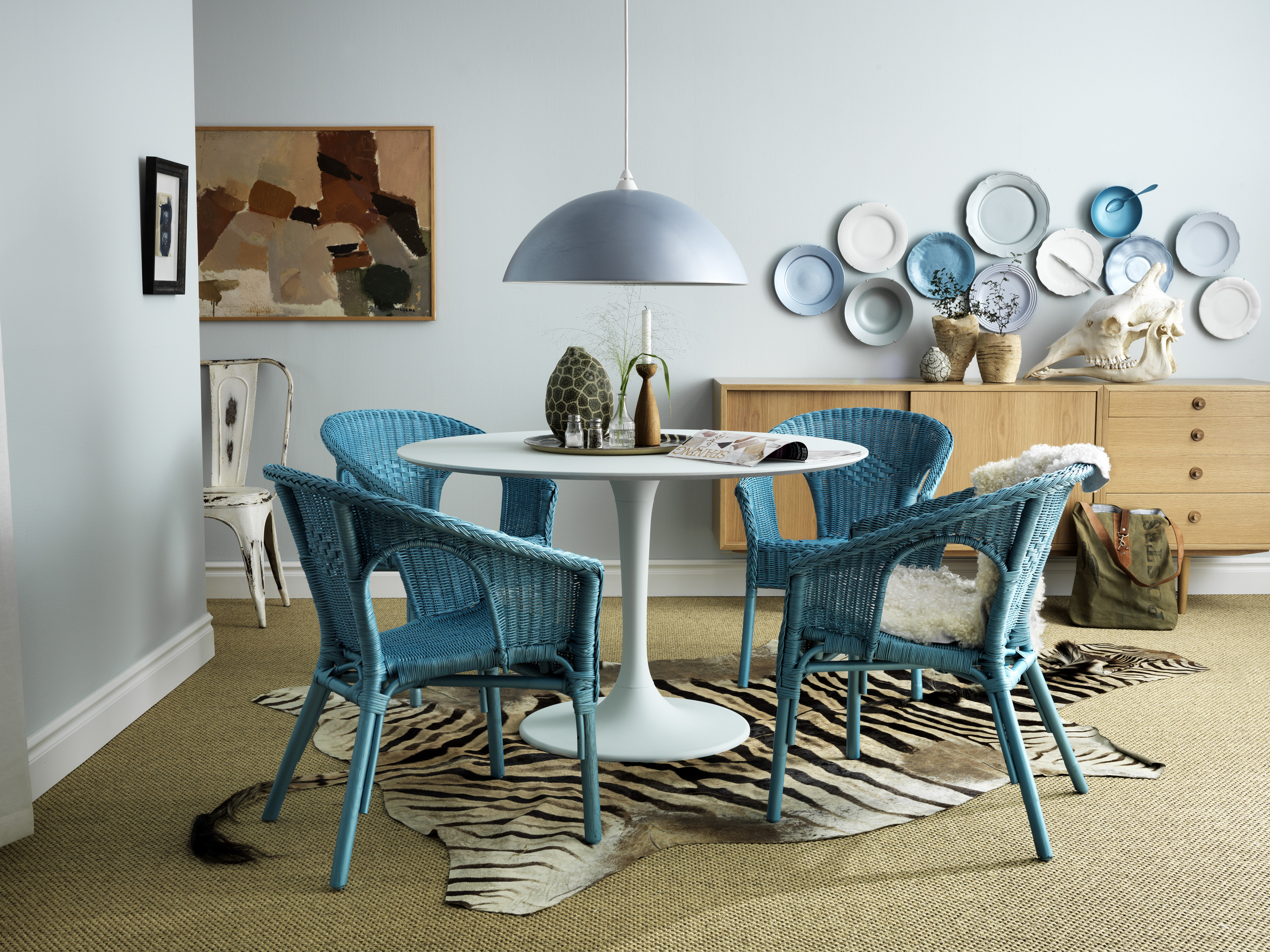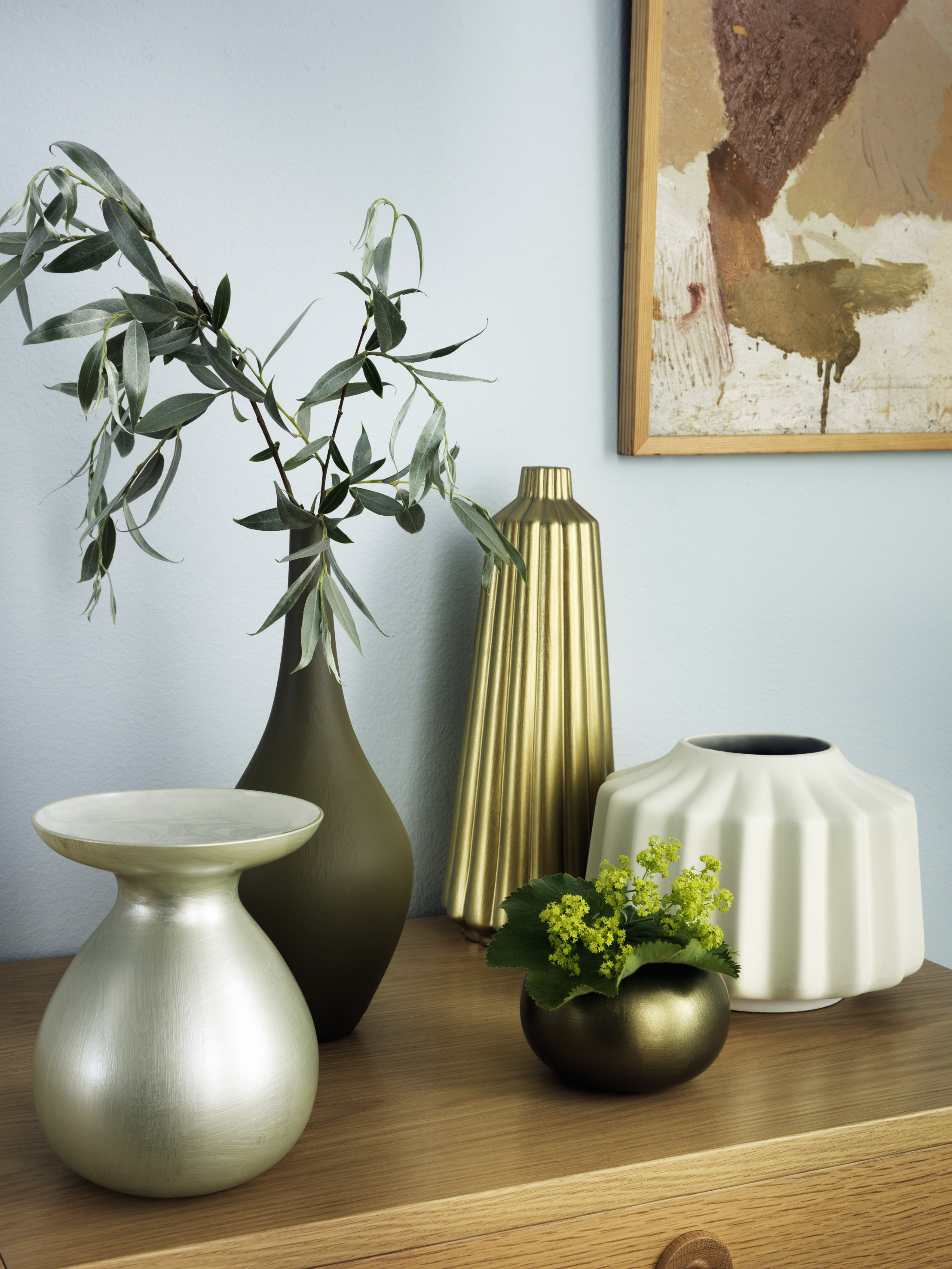 Med nye, avstemte farger og skiftende finish, kan vi bruke også de vanlige tingene vi har hjemme som designelementer. En samling gamle tallerkener med ulikt utseende, odde lysestaker, eller ulike småvaser kan få nytt liv og karakter ved bruk av maling. Miks og match med maling som gir ulike effekter: metallisk glans, matt eller helblank overflate.