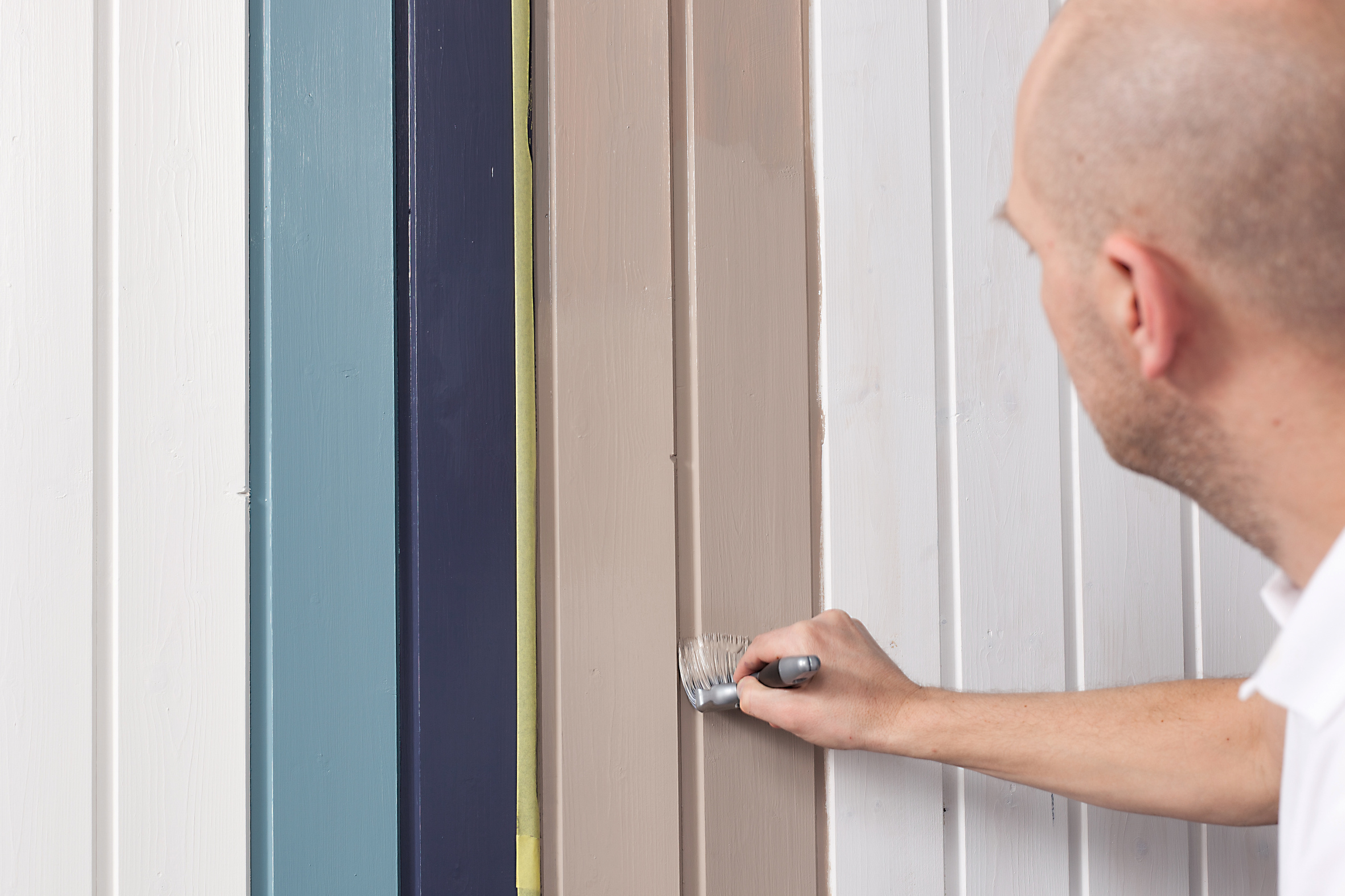 1. Bruk maskeringstape og tape fra øverst til nederst på det panelbordet der du skal begynne å male striper. Ikke mal stripene ytterst på utvendig hjørne på den brede panelplanken, men nede i den smale mellomrommet mellom panelene. Unngå å legge skillet akkurat der hvor bordene er skjøtet sammen.