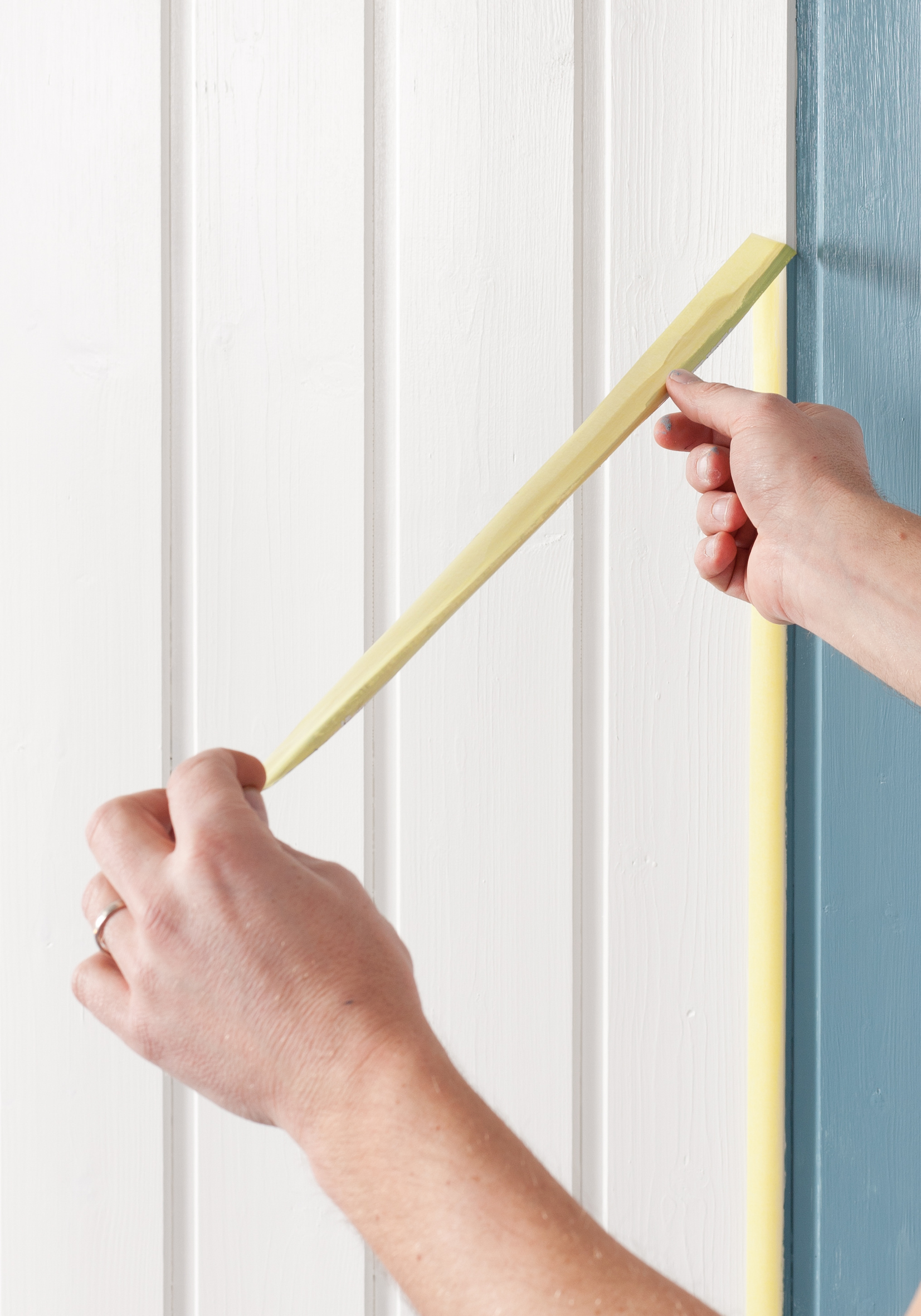 Så kommer selve trikset for å skape en fin, ren kant: mal tapekanten med bakgrunnsfargen inne i det området der det skal males en stripe med en annen farge. På den måten forsegler du tapen. Det vil si at det ikke kommer stripemaling inn under tapen, og du unngår ruglete kant.