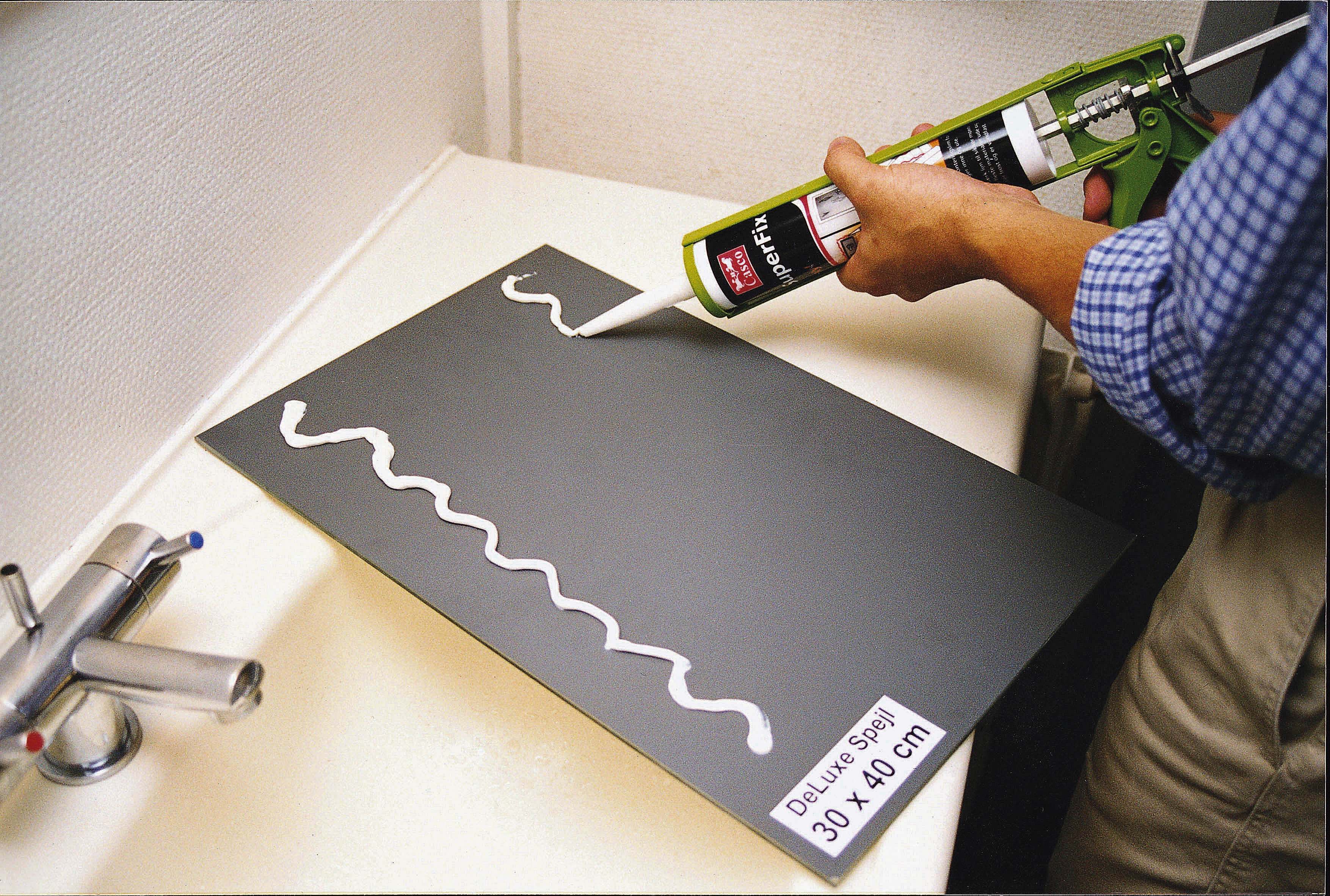 Dropp oppmåling og borring når speilet skal opp på baderomsveggen. Bruk lim som er utviklet spesielt for fuktige flater. Dette limet kan brukes både på fliser og tapet. Limer også paneler, lister, beslag og trappeforkanter. Fås både i patron (bildet) og på tube. Husk at flatene må være tørre og rene der limet brukes.