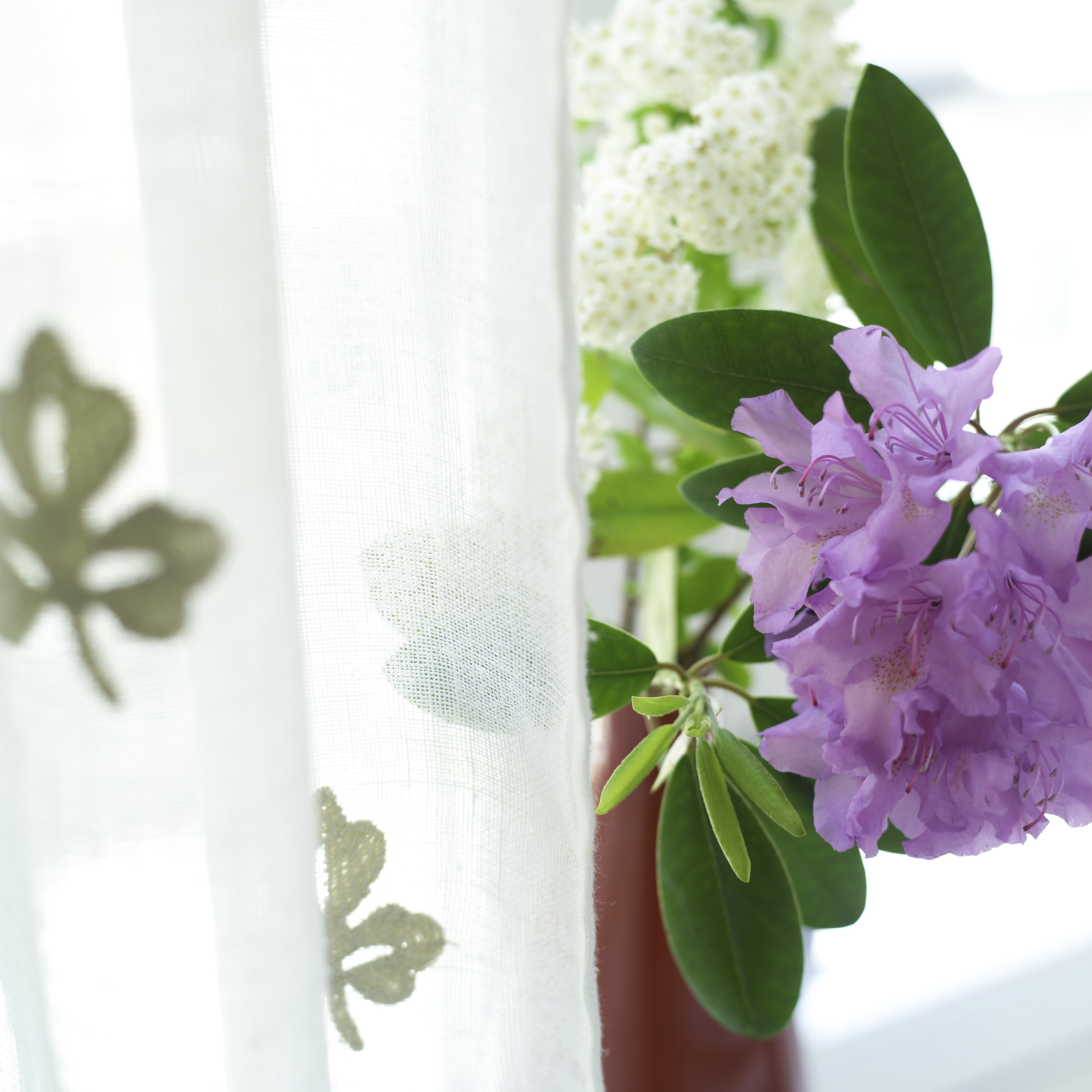 Gardinene i grov lin har liljemønster som tar opp muldvarpfargen. I motsatt