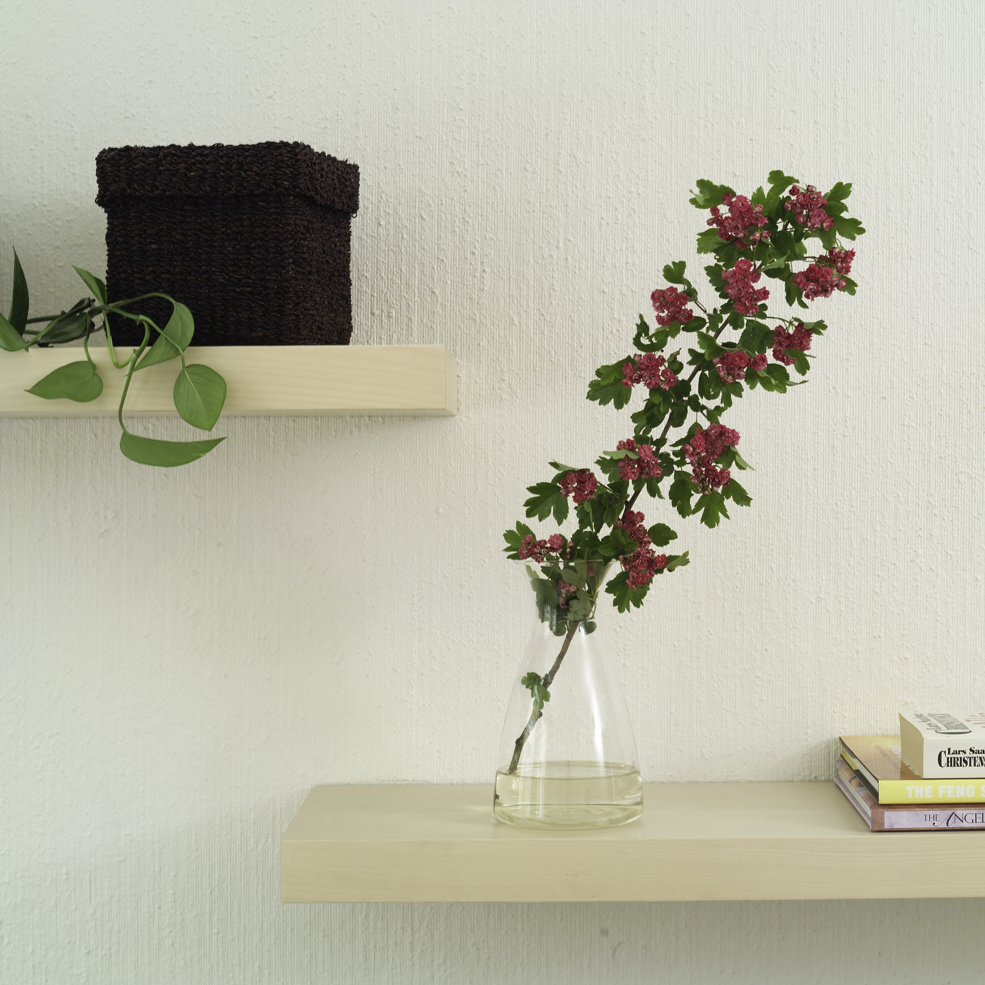 på veggen er det montert løse hyller i ulik høyde. Disse er praktiske samtidig