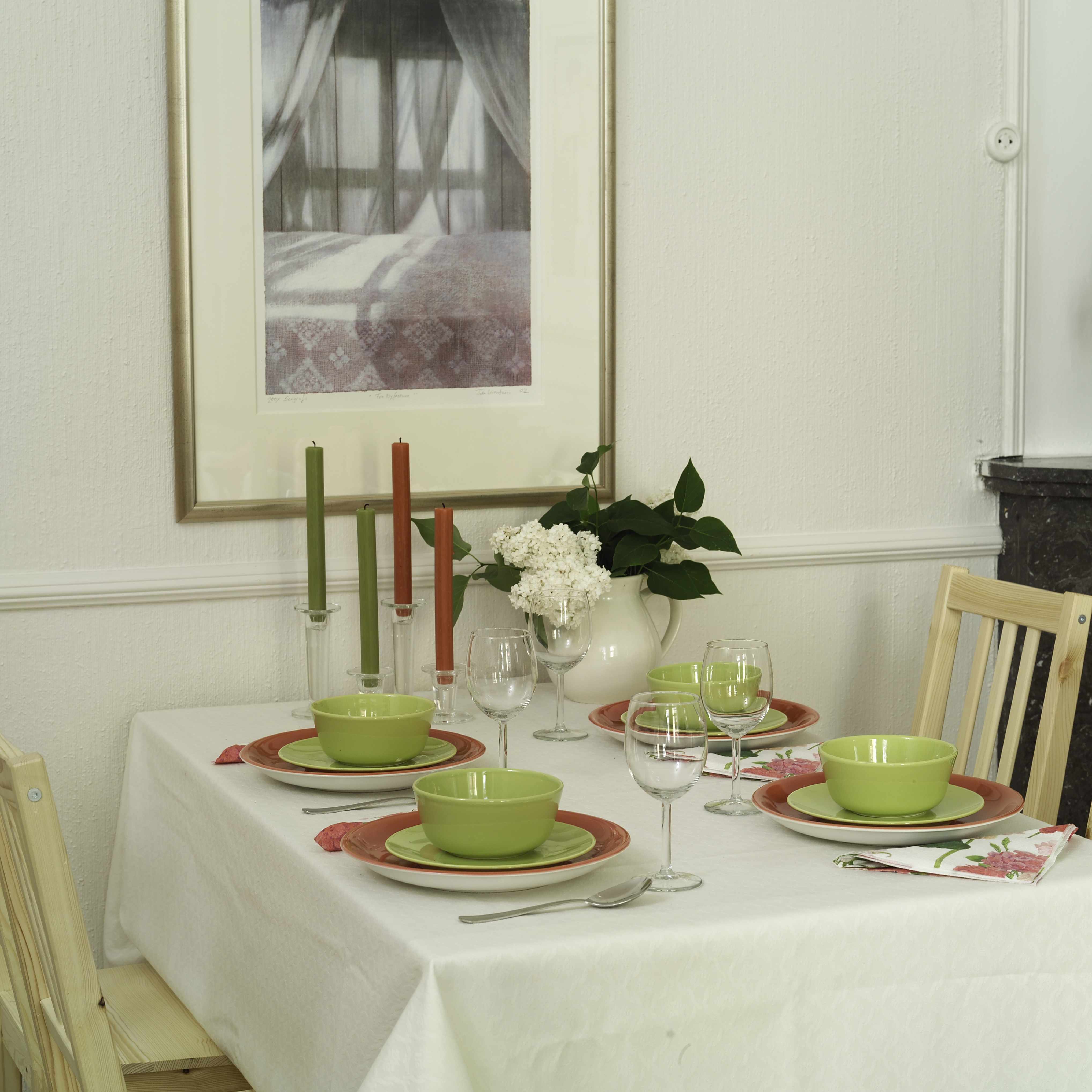 dekket med tallerkener i korallrødt og boller i ertegrønt. Dette gir dybde og