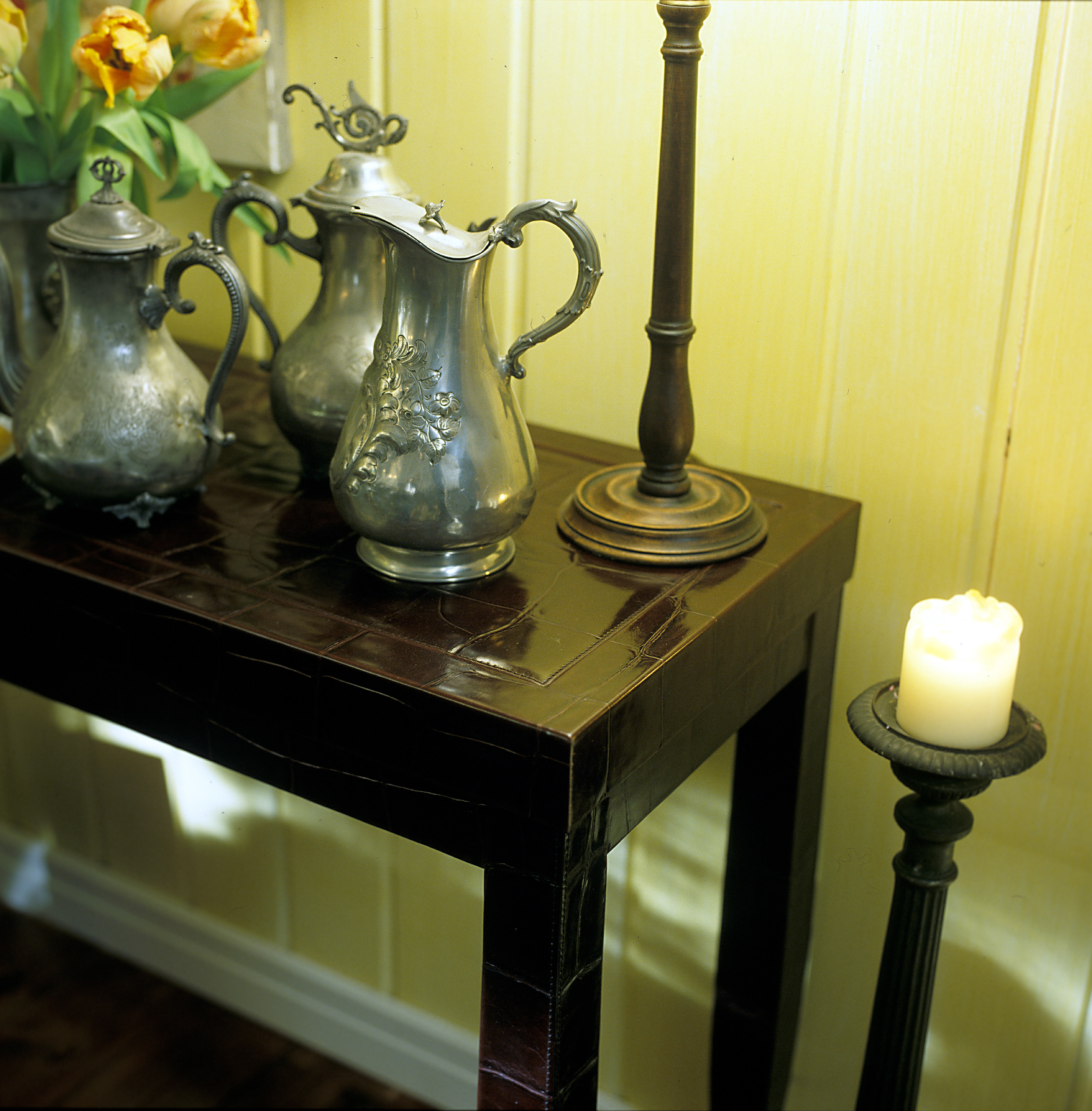 Som en kontrast og for å understreke det rause er det tatt inn stramme elementer som høyryggede skinnstoler og konsoll i skinn. Dette er satt sammen med gjenstander i antikt tinn. Ellers kunne de stramme linjer virket litt high-tec og skapt uønsket distanse.