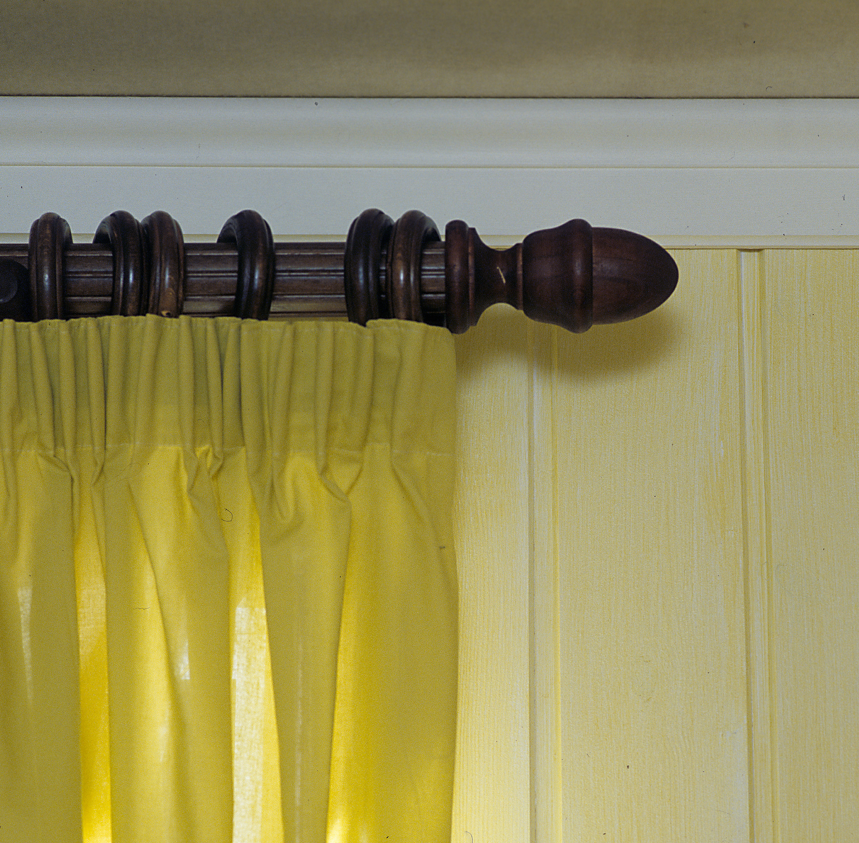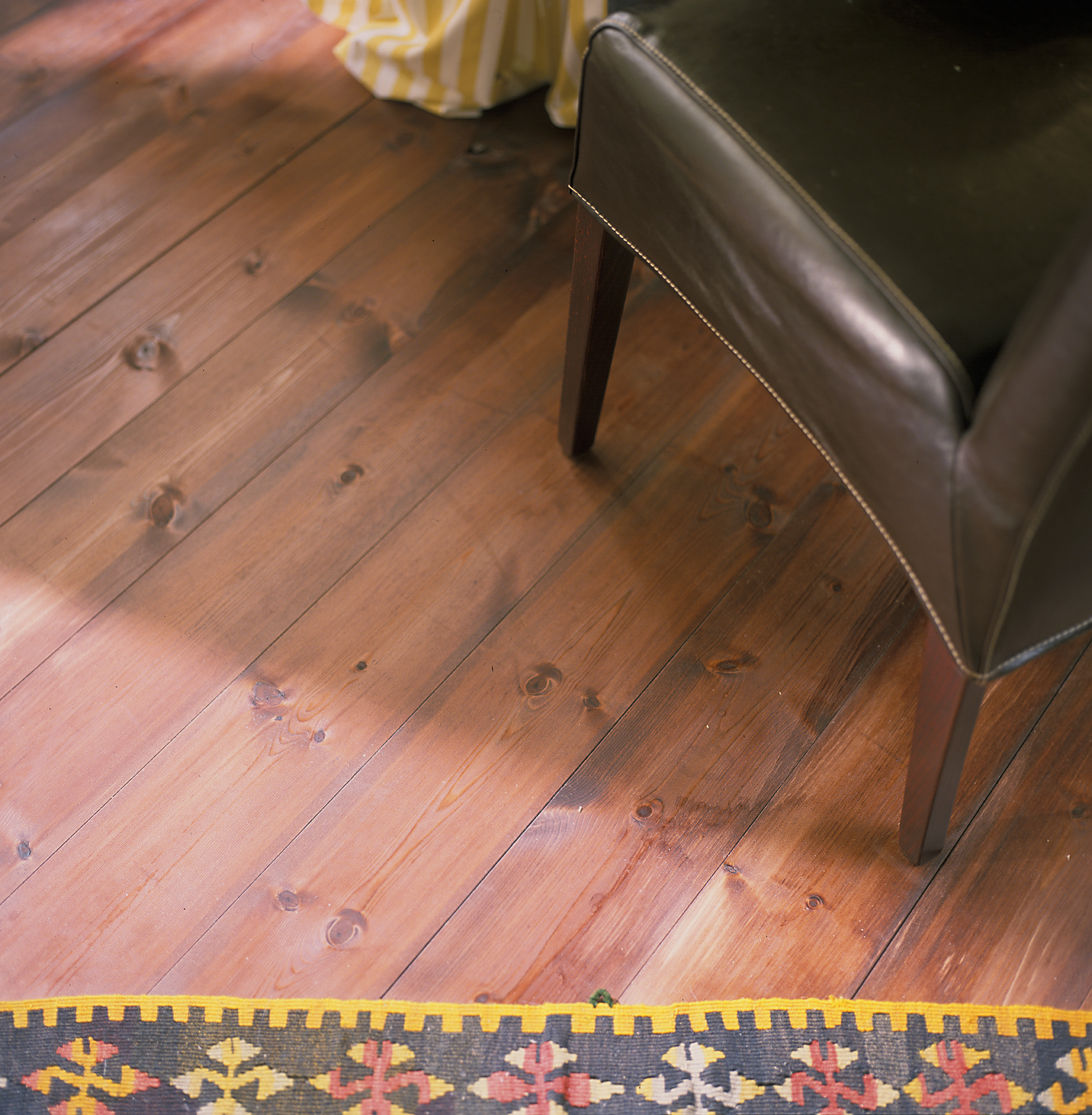 Veggene er malt gylne gule og virker innbydende. Et tynt strøk med lasur gir panelet karakter. Gulvet er furu og beiset i mørk nøttefarge. De malte veggene og gulvet gir rommet et rustikt og hjemmekoselig preg, en spennende kontrast til alle tekstilene. Atmosfæren blir godslig, men samtidig nobel.
