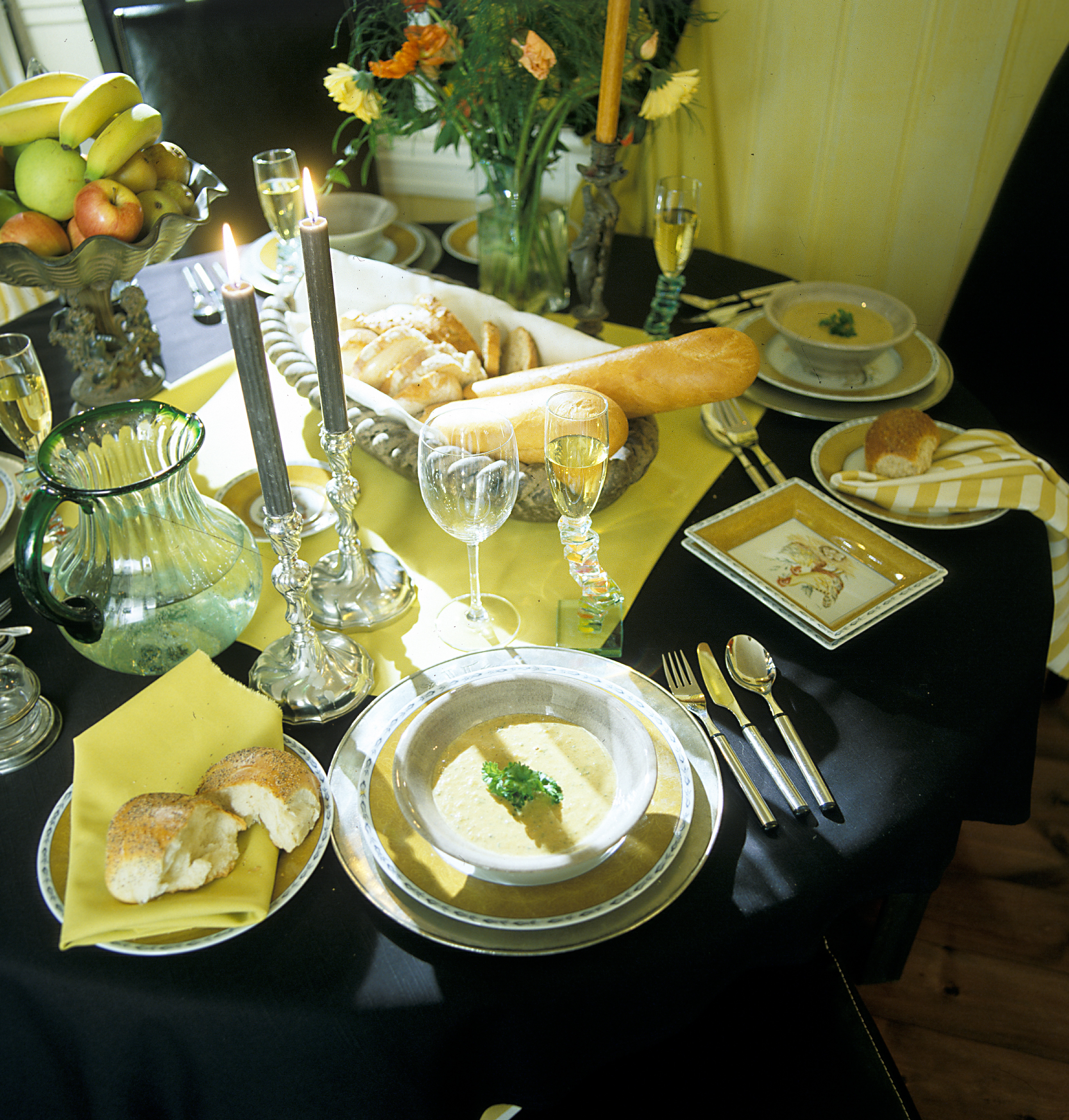 Det luksuriøse preget skapes med en flom av tekstiler. Her må det ikke spares på meterne. Det runde bordet har en overdådig duk i samme stripete bomullsstoff som liftgardinen. Den litt blanke bomullen virker eksklusiv og flott. Legg merke til den sorte overduken med dusker. Den holder bordet på plass. Uten den mørke kontrasten kunne bordet lett begynne "å sveve". Mat, dekorasjon og servise kommer godt frem på den mørke bakgrunnen.