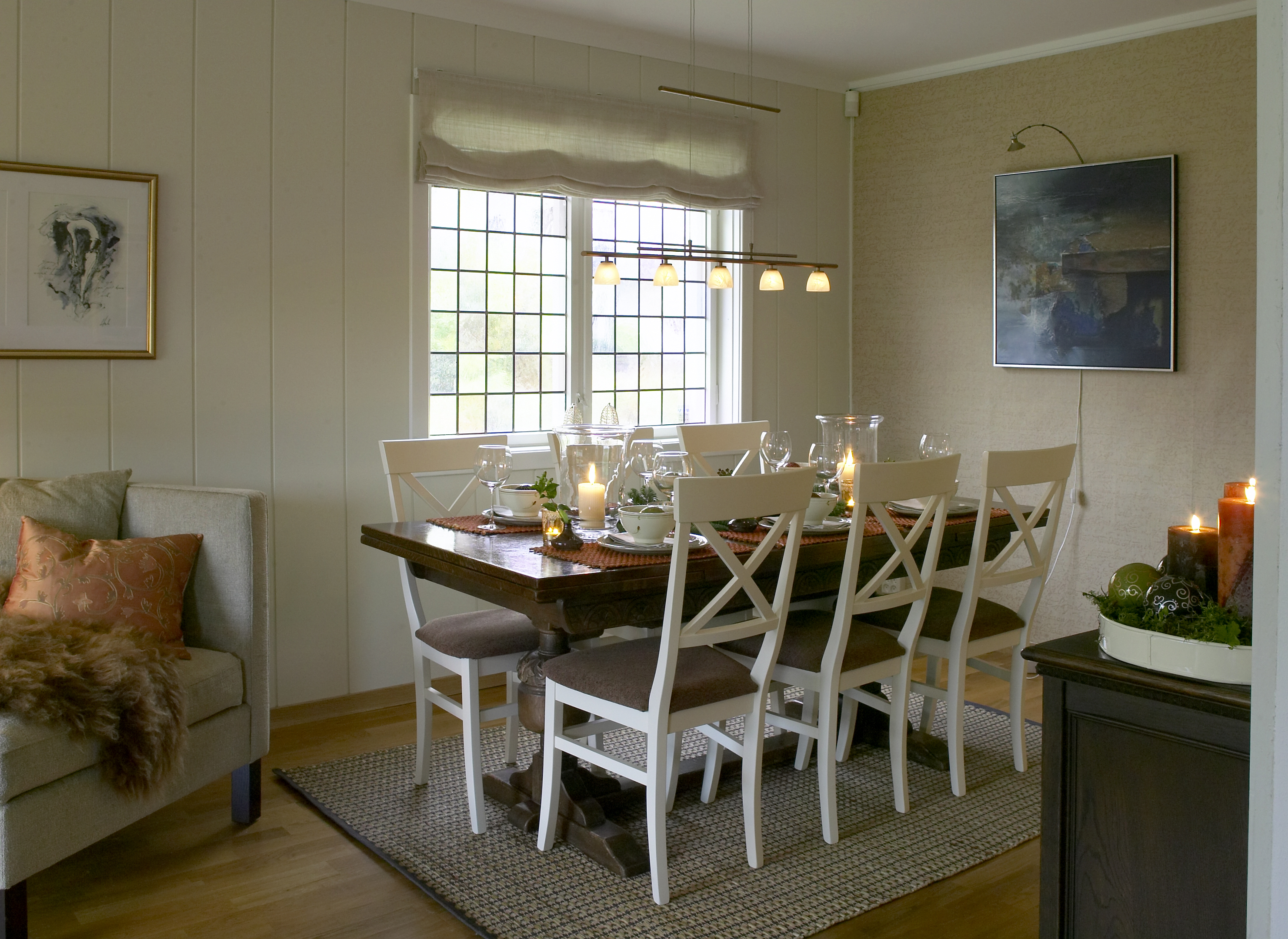 Stuen hadde noen store, tunge møbler som virket gammelmodige. Med disse ble det gjort kort prosess - og ble solgt i løpet av en ettermiddag på finn.no. Derimot ble både spise- og salongbord beholdt. Tanken var at en miks av gamle og nye møbler ville gi rommet en personlig touch. Ved hjelp av Liberon Bivoks fikk bordene en lekker og gylden glød, samtidig som de er godt beskyttet.