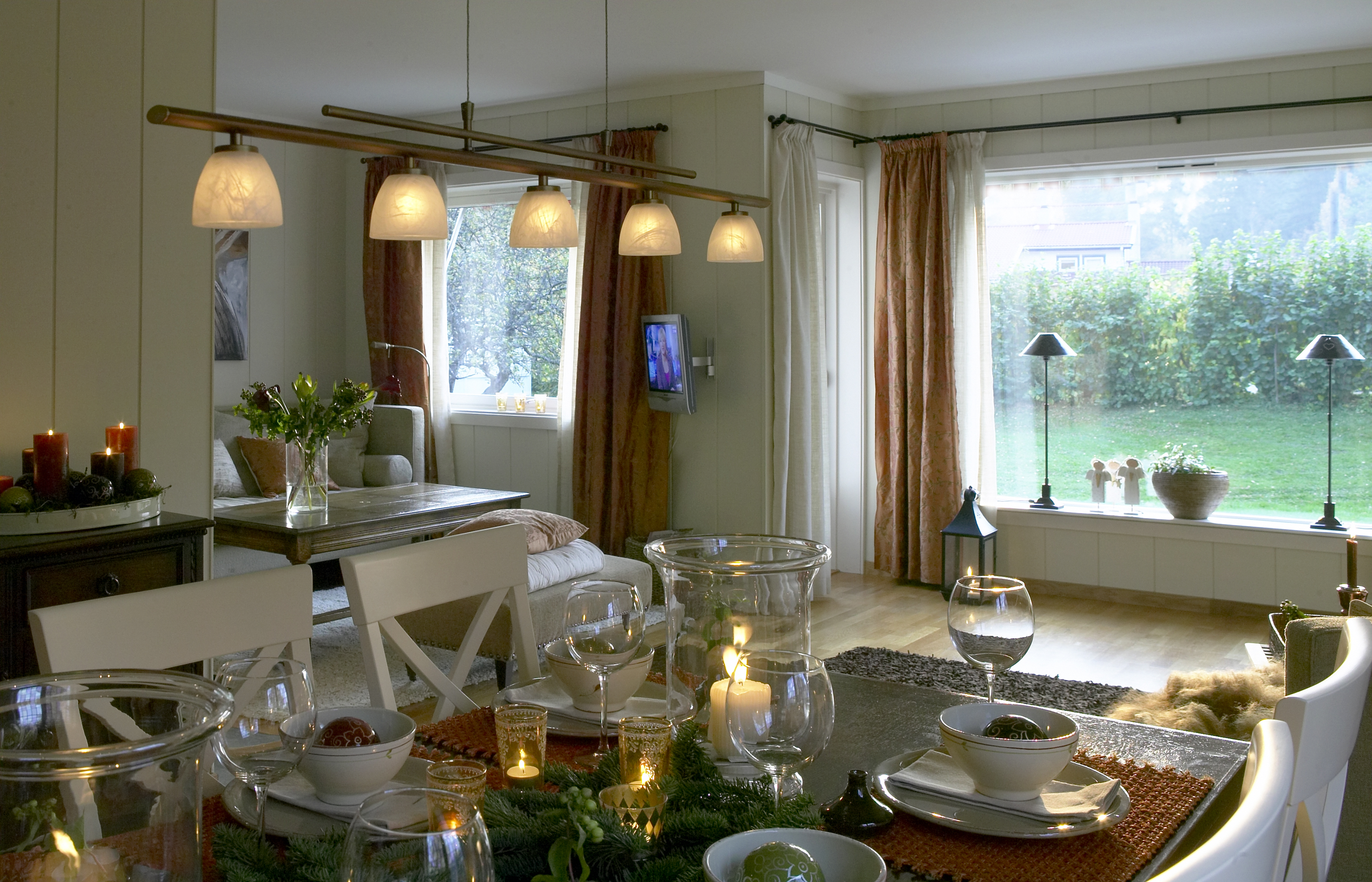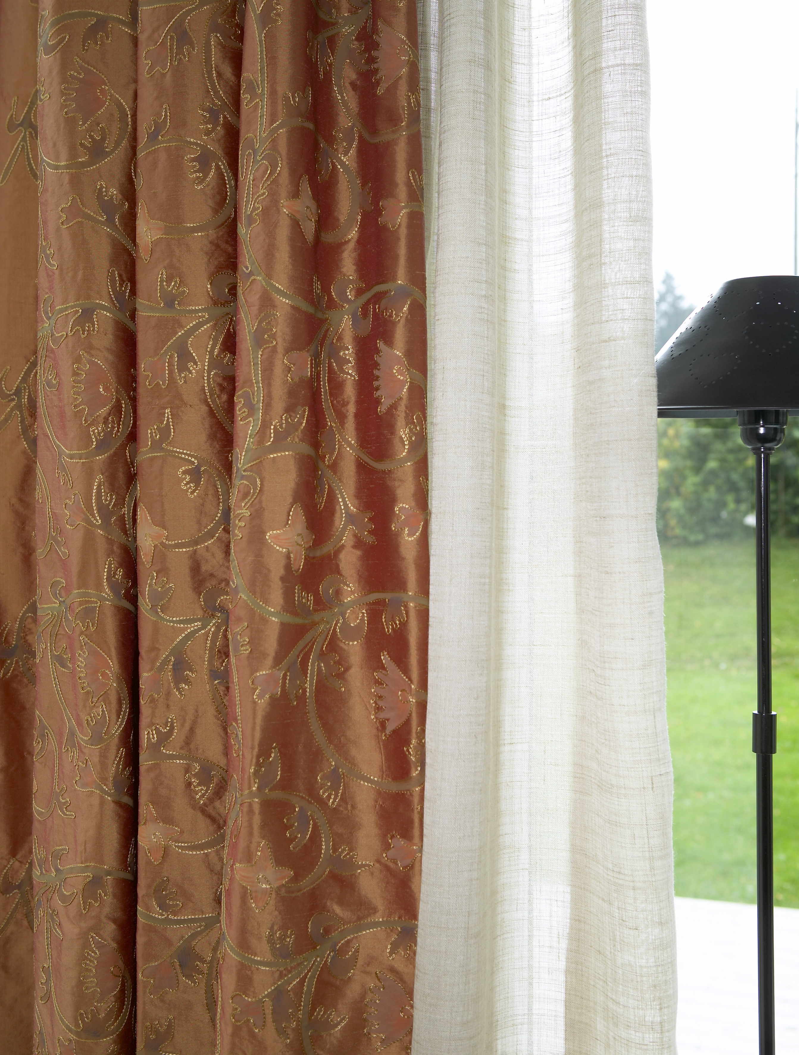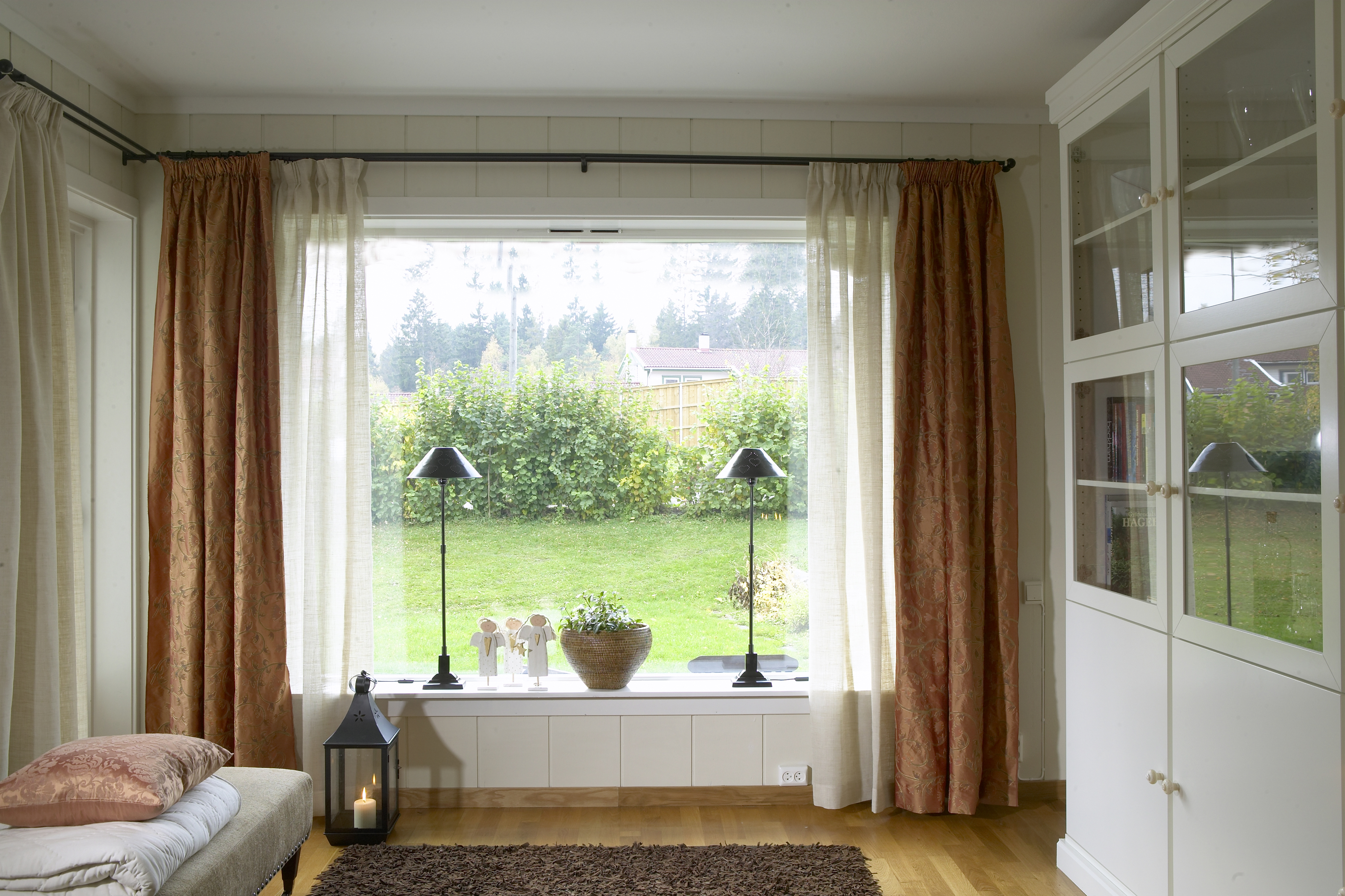 Tekstiler er et viktig element i en slik fornyelse. Som gardiner ble det valgt en kombinasjon av lin og silke, som gir et raffinert inntrykk. Silkegardinene ble foret for å unngå at fiberen blir spist opp av solen. Tanken var at familien skulle ha ett sett gardiner som bare var til pynt, og ett sett de kunne trekke for om kvelden. Gardinene ble derfor hengt i to lag, og for ikke å stjele for mye lys fra lysåpningen i vinduet, ble stengene hengt et stykke ut på hver side. Dette ga maksimal utnyttelse av lysåpningen, samt at rommet virket større.