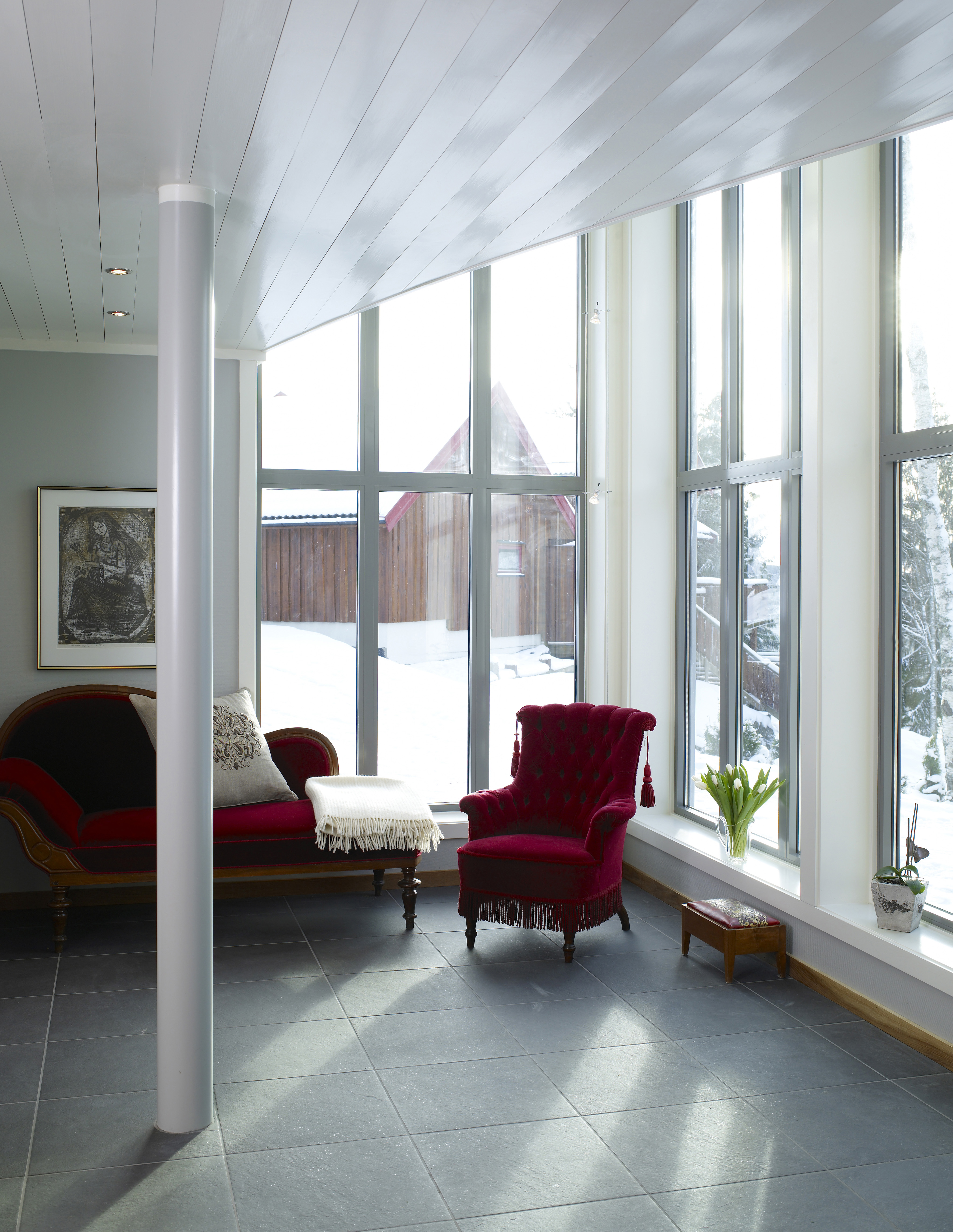 og halvblanke vegger gir fin effekt i rommet. Et panelt tak som er helblankt