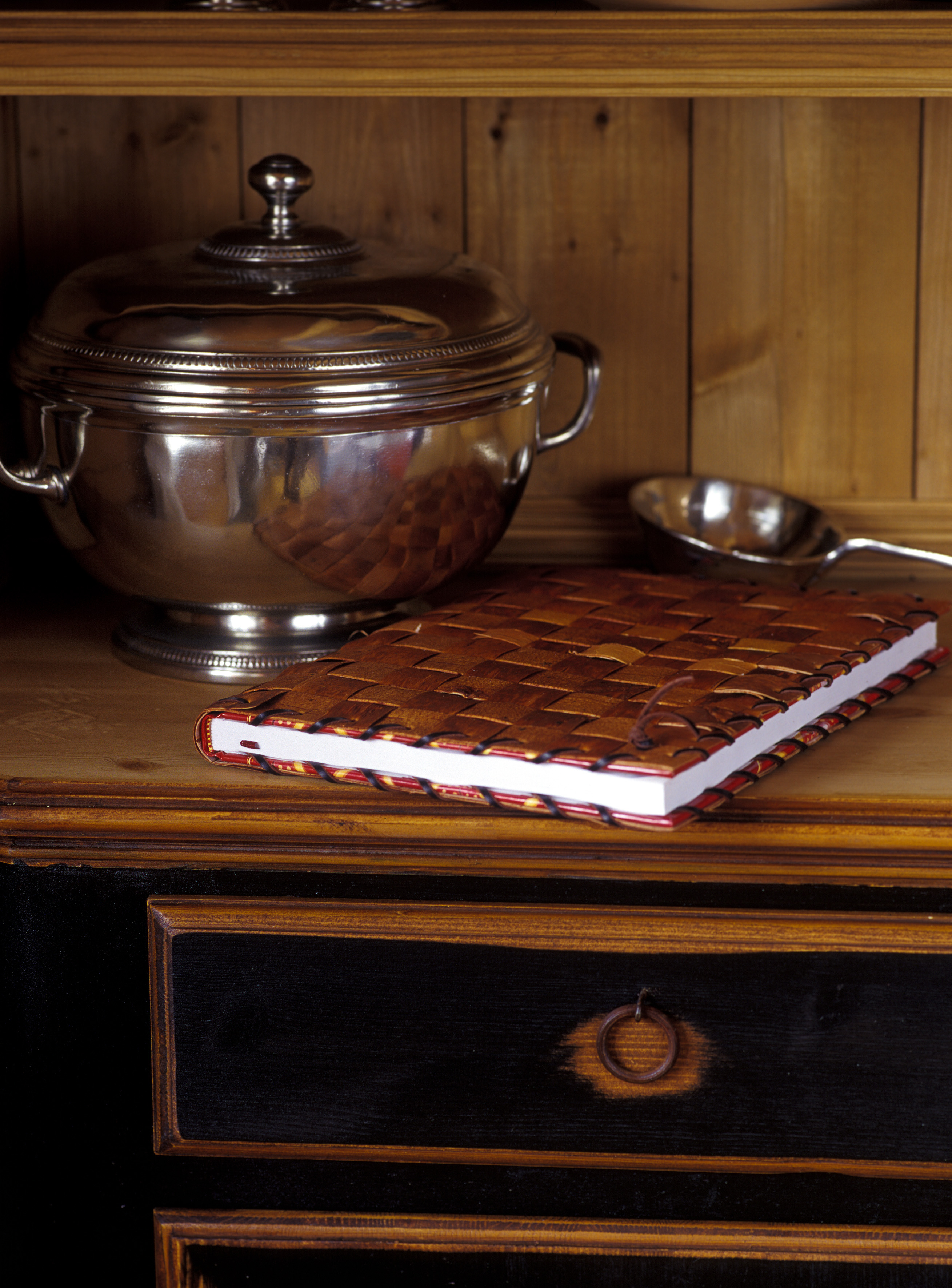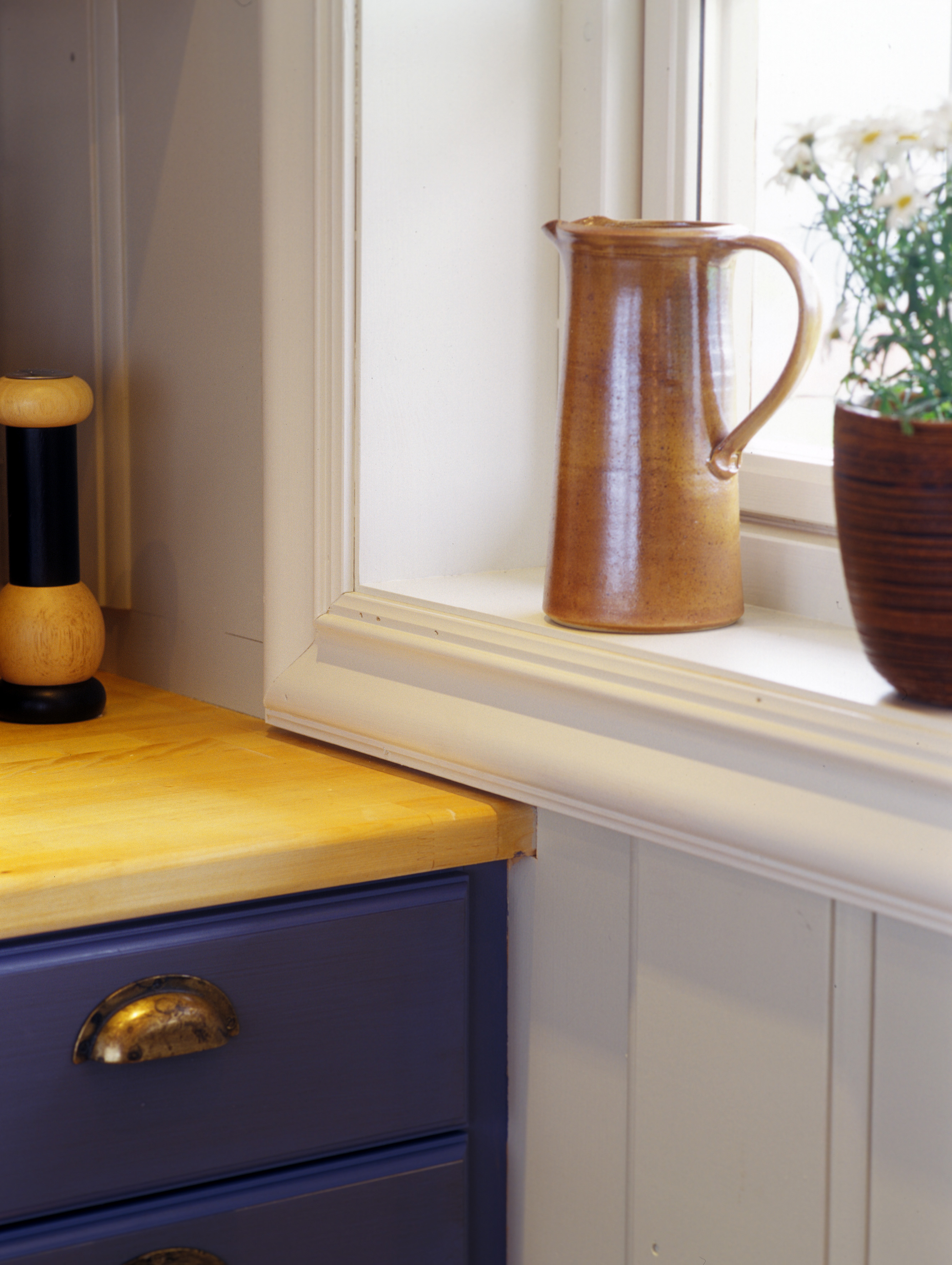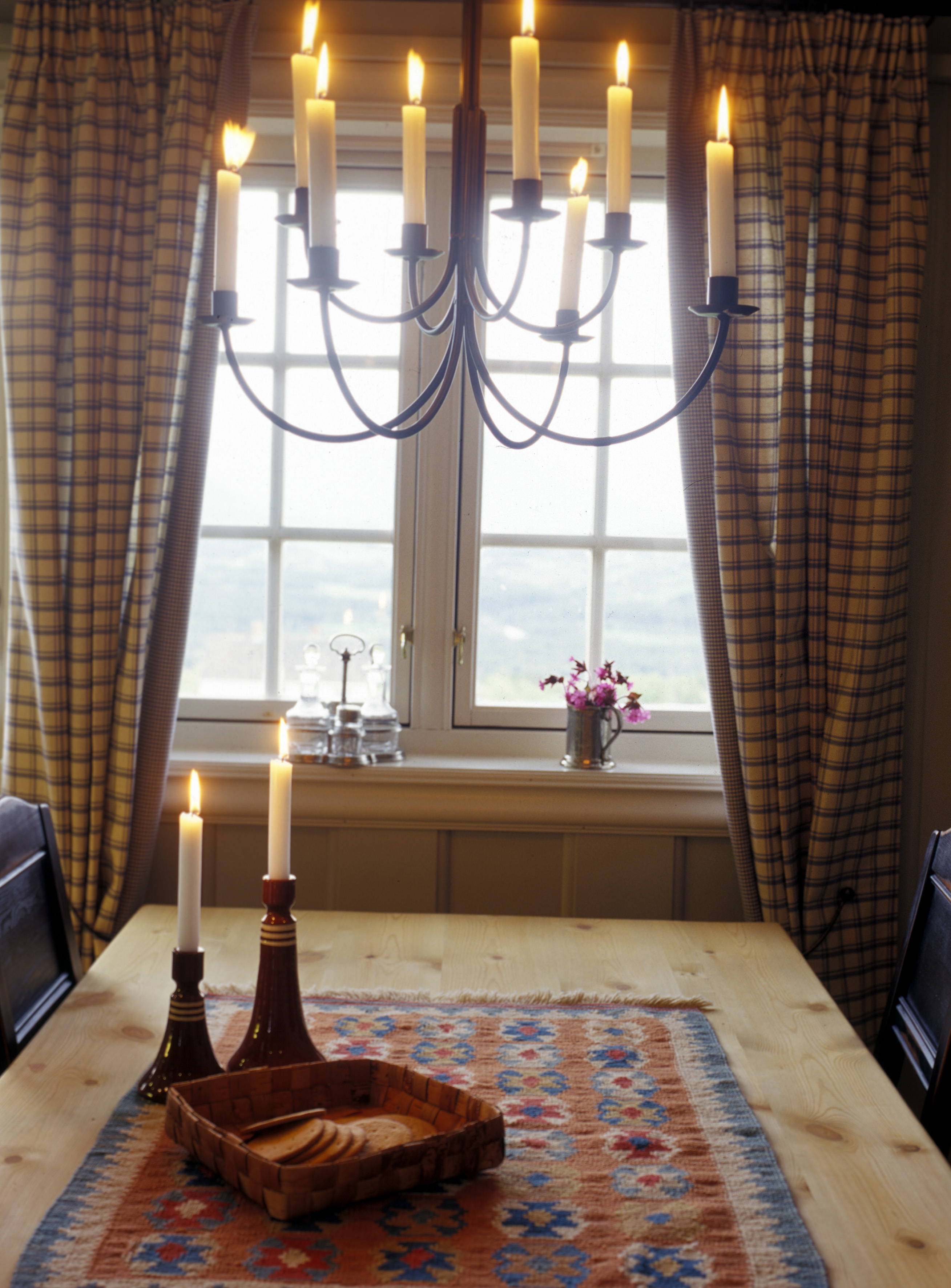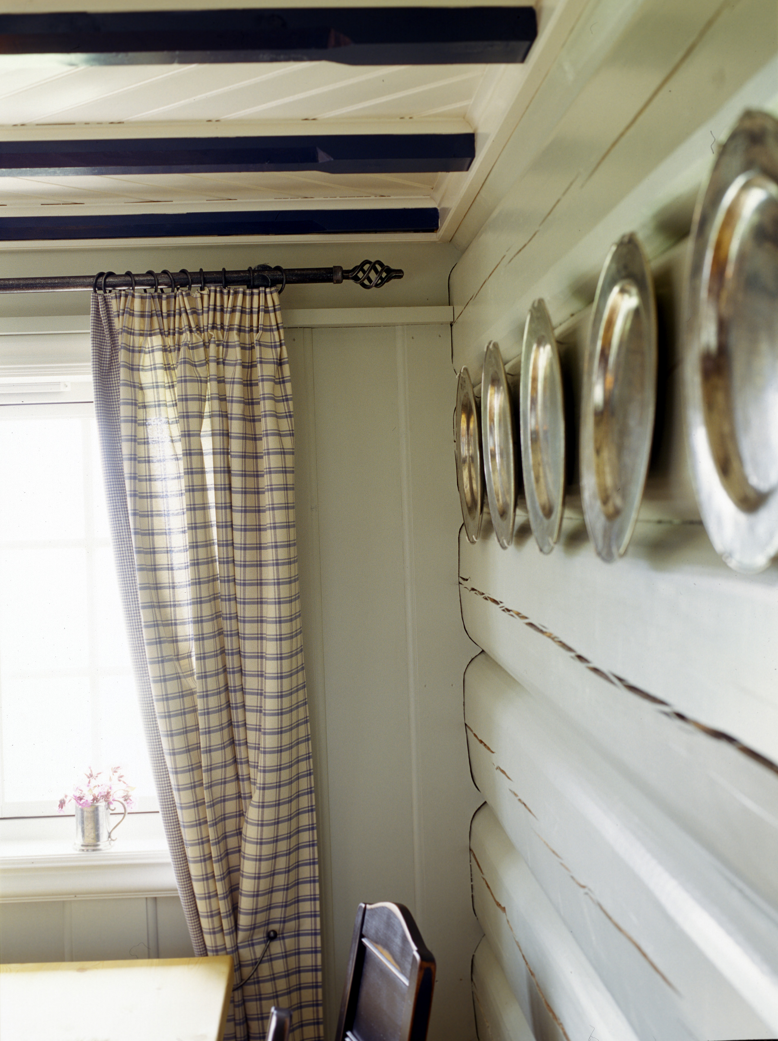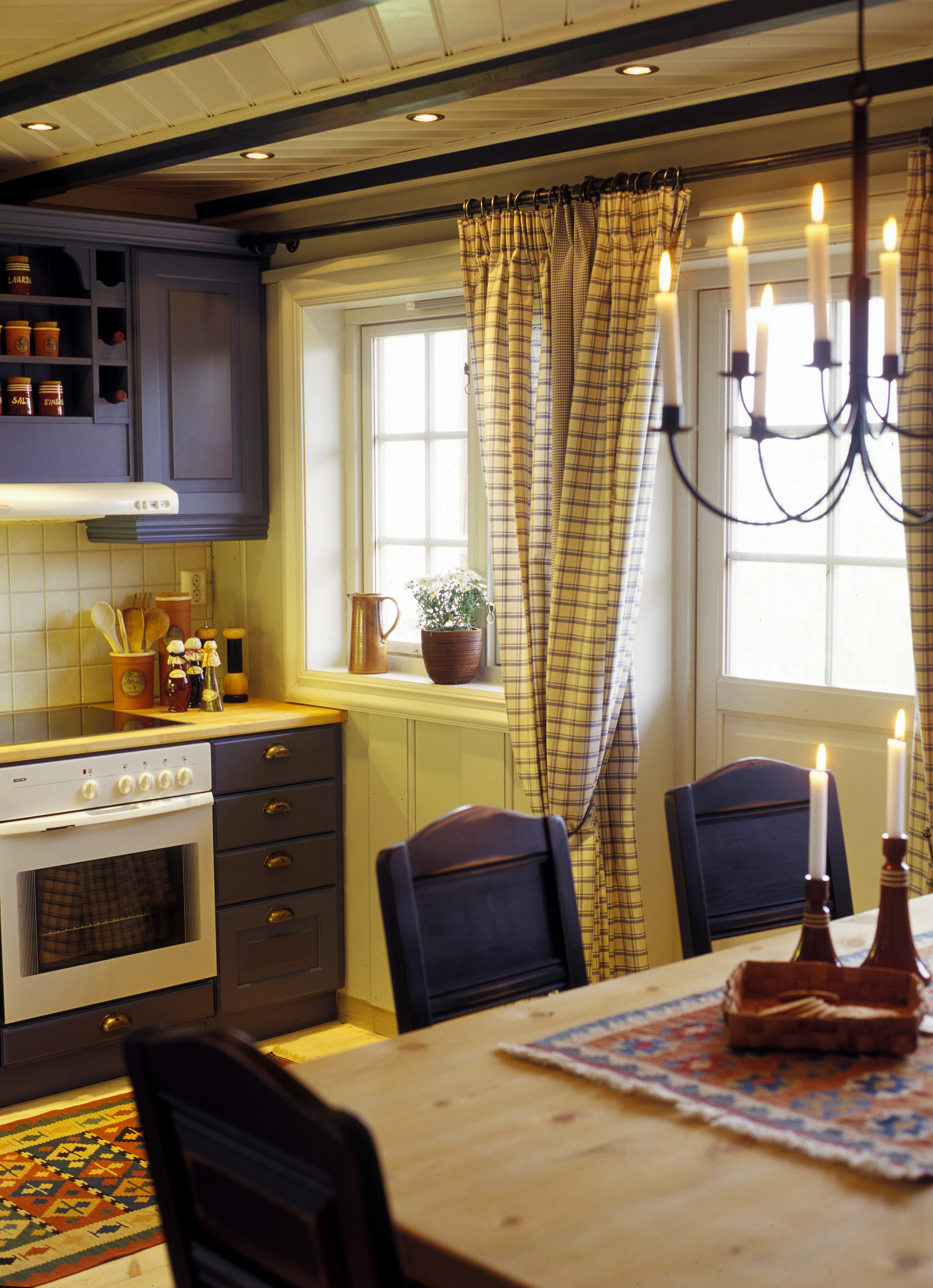 Kjøkkeninnredningen er spesiallaget av lokal snekkerbedrift. Heltre og kvalitet tvers gjennom. Men med furugulv, panelt tak og vegger blir det vel mye treverk. Blått er en gammel kjøkkenfarge, og eierne var opptatt av tradisjoner, så blått ble et naturlig valg. Selv om fargen er kraftig er tonen dempet. Dørspeilene er lasert med et strøk olje i brent umbra for å gi mer dybde til fargen. Veggene ble malt lys grå og vinduene antikkhvite. Taket ble hvitmalt og spotter montert. Bjelkene fikk en dyp blåfarge. Fargen på innredningen tas opp i rutene på de kraftige vevde gardinene som holdes til side med metallbøyler. Når hytta forlates trekkes de fotside gardinene for hele vindusveggen. Bondebord med tjukk plate og aldringsmalte stoler hører til.