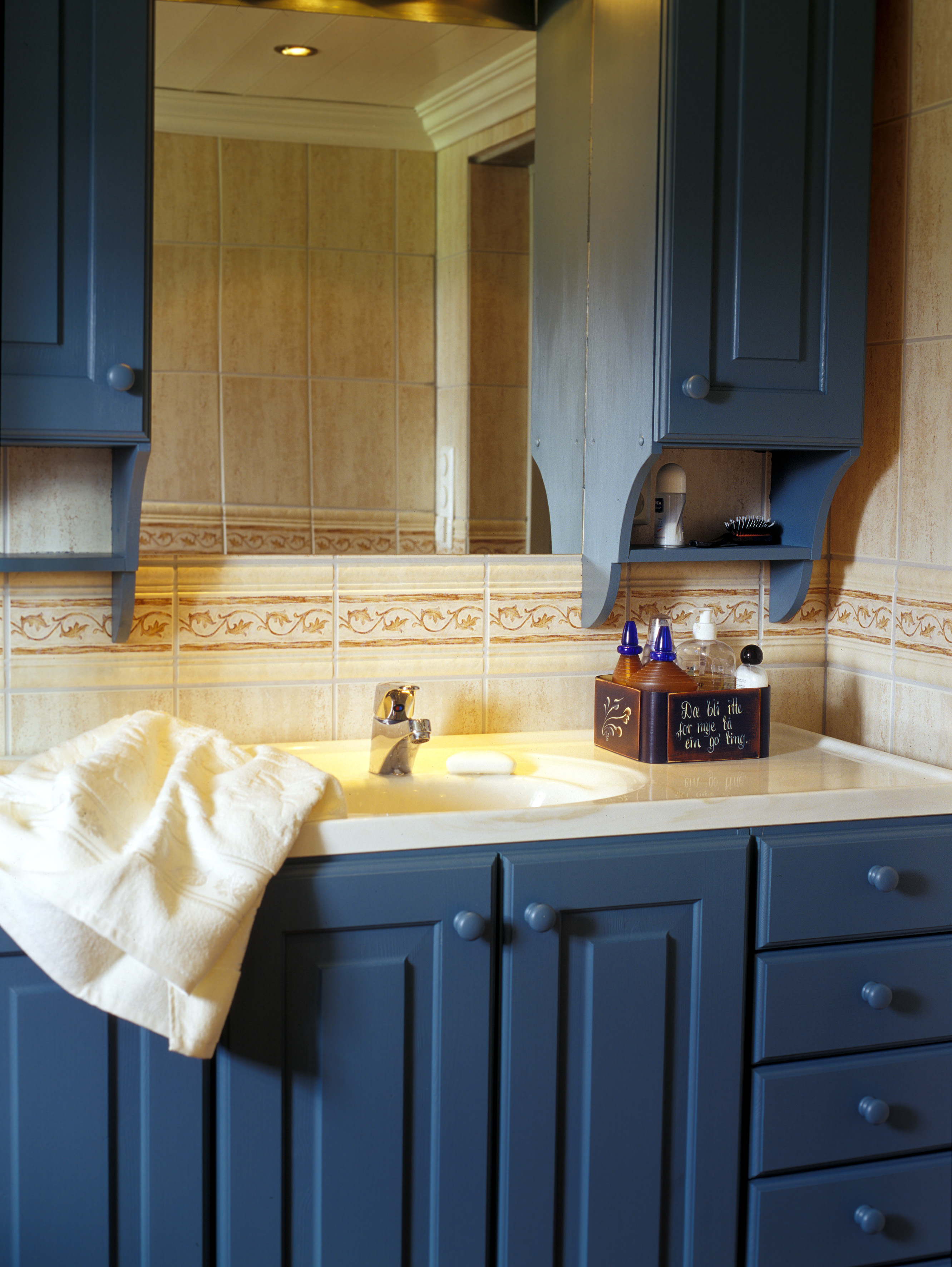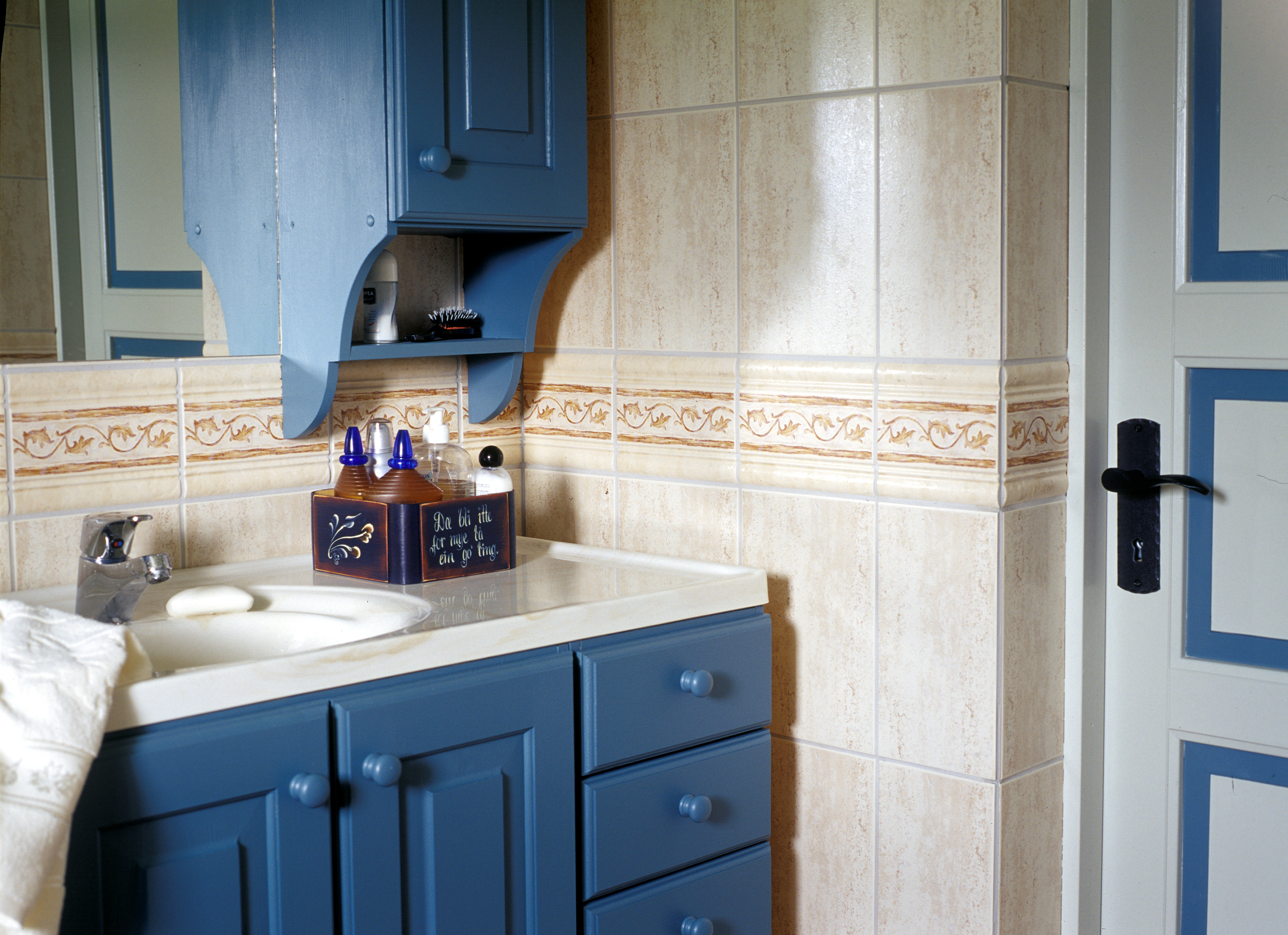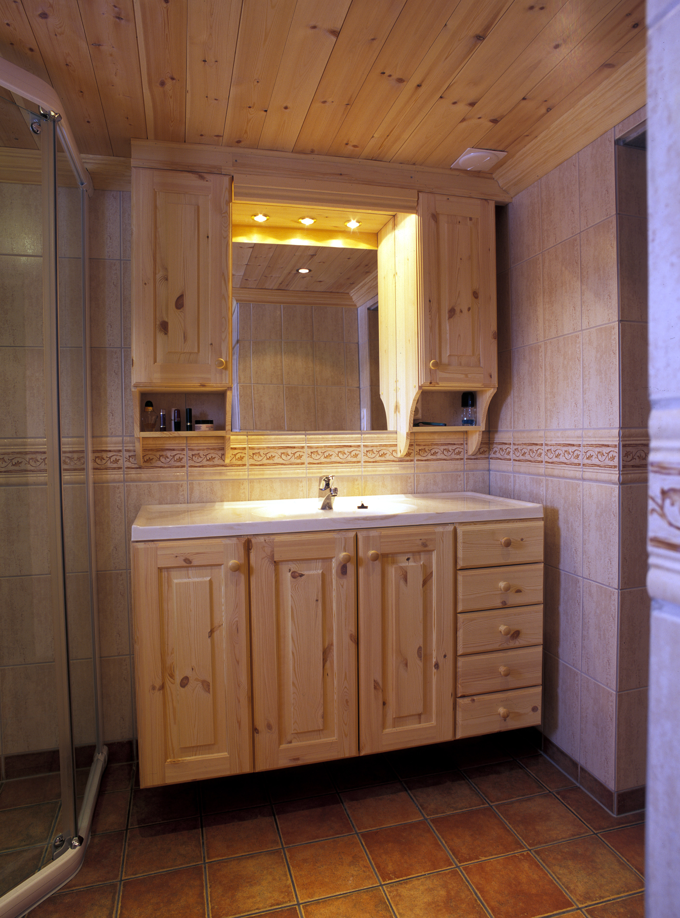 Et komfortabelt og velfungerende bad stod på ønskelisten, men noe stor luksus var ikke nødvendig. Et dusjkabinett og innredning med god skapplass fyller behovet. Vegger og gulv ble flislagt og taket fikk beholde furupanelet. Blått ble også hovedfargen, en blågrønn tone som tas igjen i dørfyllingene.