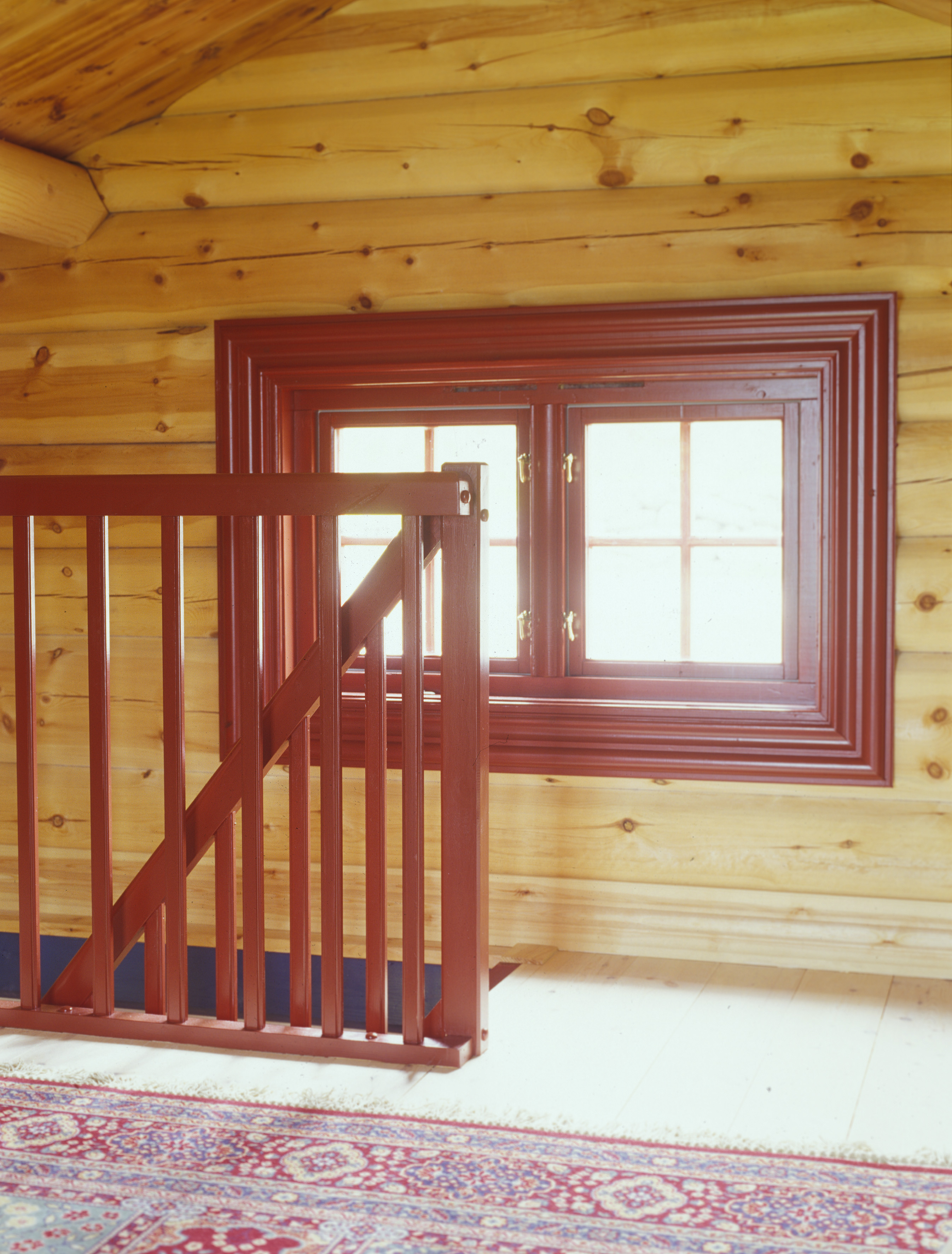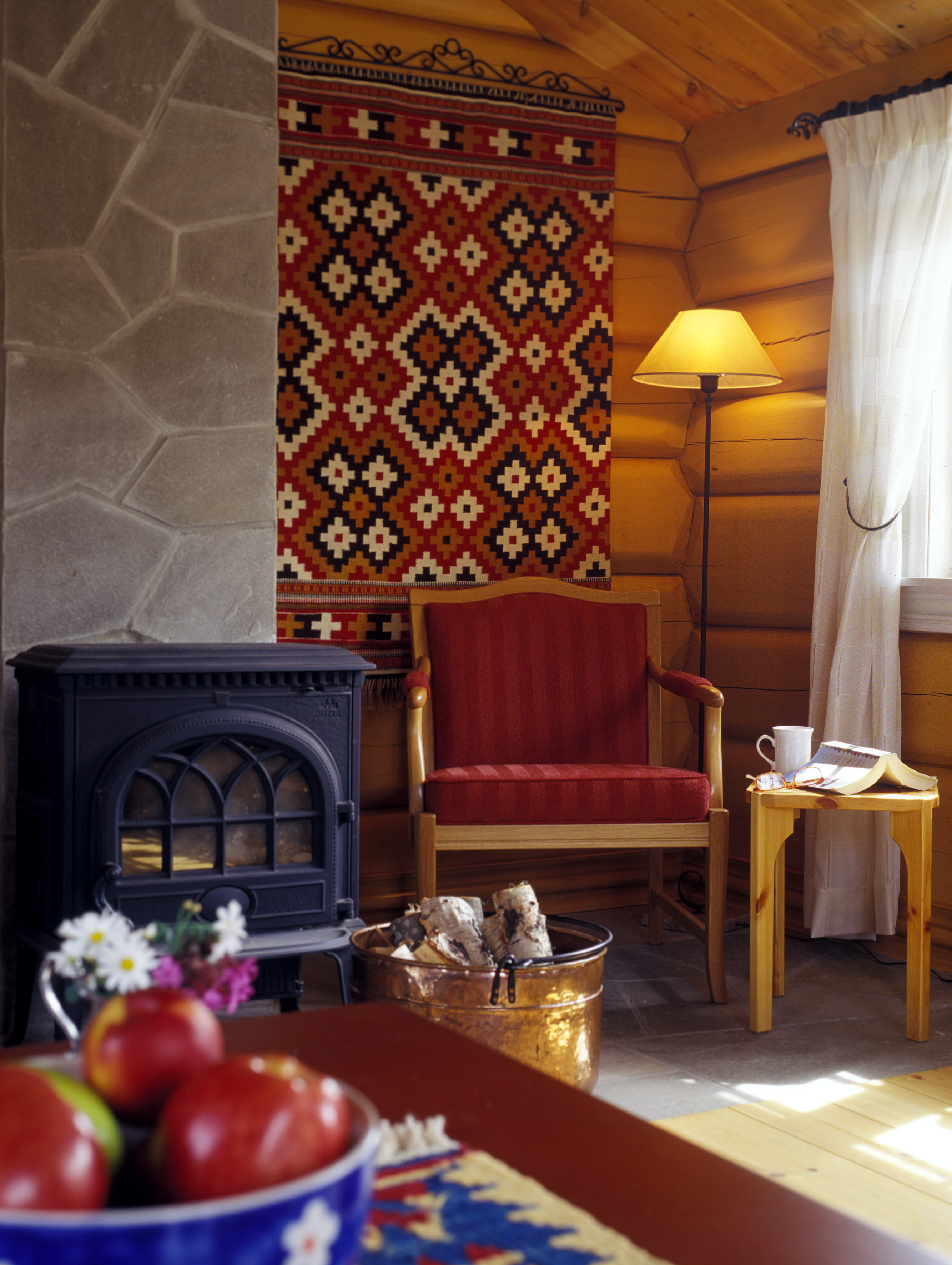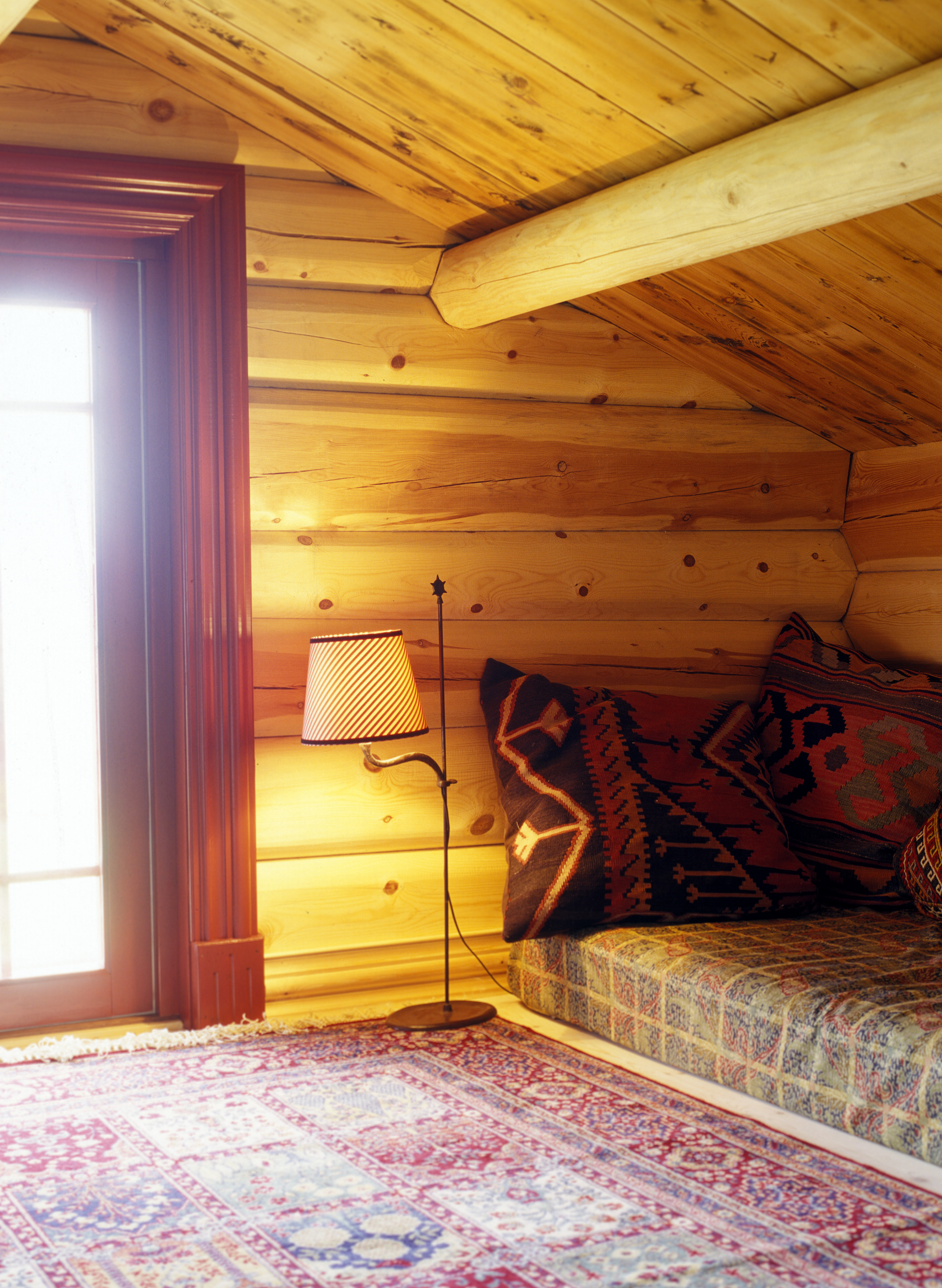 I oppstuguen ble treverket beholdt. For å bringe litt farge inn her valgte eierne å videreføre den dype rødfargen fra trappen til vinduene. Takhøyden er lav og siden rommet skulle brukes til avslapping trakk vi solide madrasser og la de rett på gulvet. Et flott gulvteppe i et etniskinspirert mønster og store kelimputer gir en avslappet atmosfære.