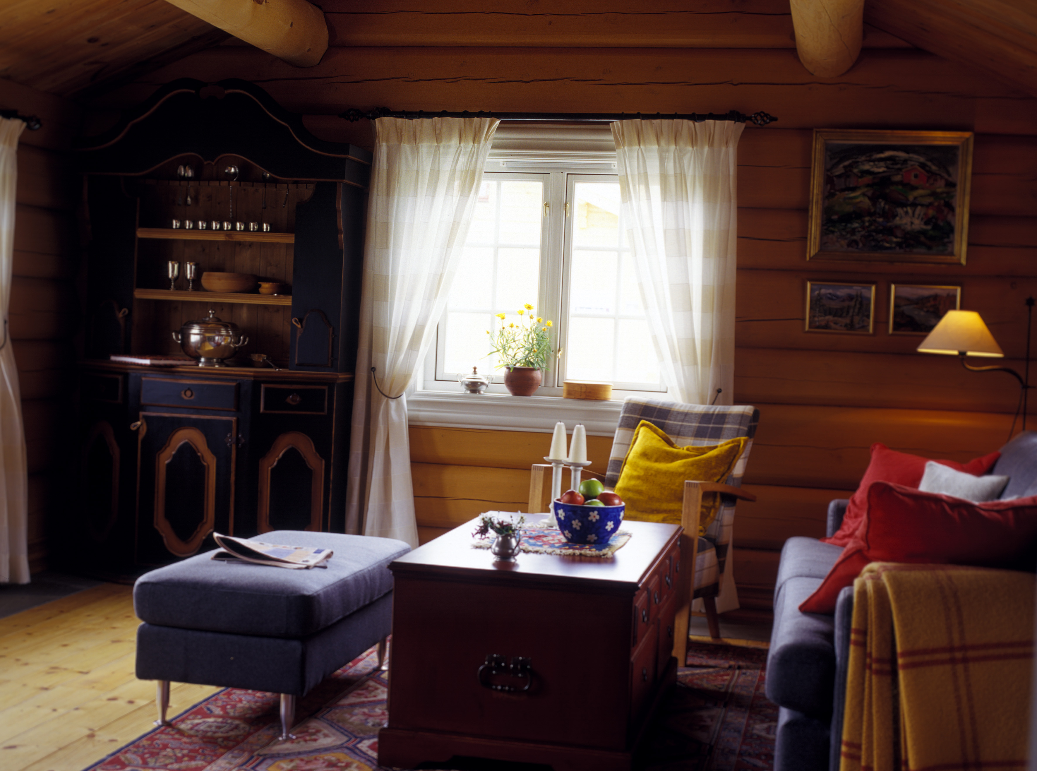 Okergule tømmervegger virker lunt og varmt på en fjellhytte, selv om de forandrer seg hele tiden med lyset. De frodige vinduslistene, karmene og rammene er malt i antikkhvitt som forsterker inntrykket av lysflom inn i stuen. Sofaen har god sittekomfort og har ullstoff. Kistebordet er malt med aldringsslitt teknikk. Skuffene er gjennomgående og har god plass til kortstokk, fjernkontroll, aviser, briller og alt det som ellers flyter rundt. Det store framskapet er laget i god, norsk håndverkstil. Det er aldringsmalt i sort med okergult som tar opp veggfargen. Den store pallen med plass til to er i samme stil og har samme trekk som sofaen. Teppet har vakkert rosemønster i varme farger som tar opp farger på vegger og møbler. Gardinene er hengt opp med store ringer på kraftige, svarte metallstenger med smidde spyd. Gardinene slipper inn mye lys og sperrer ikke for utsikten. Oljet furu på gulvet og skifer under peisen og langs veggene.