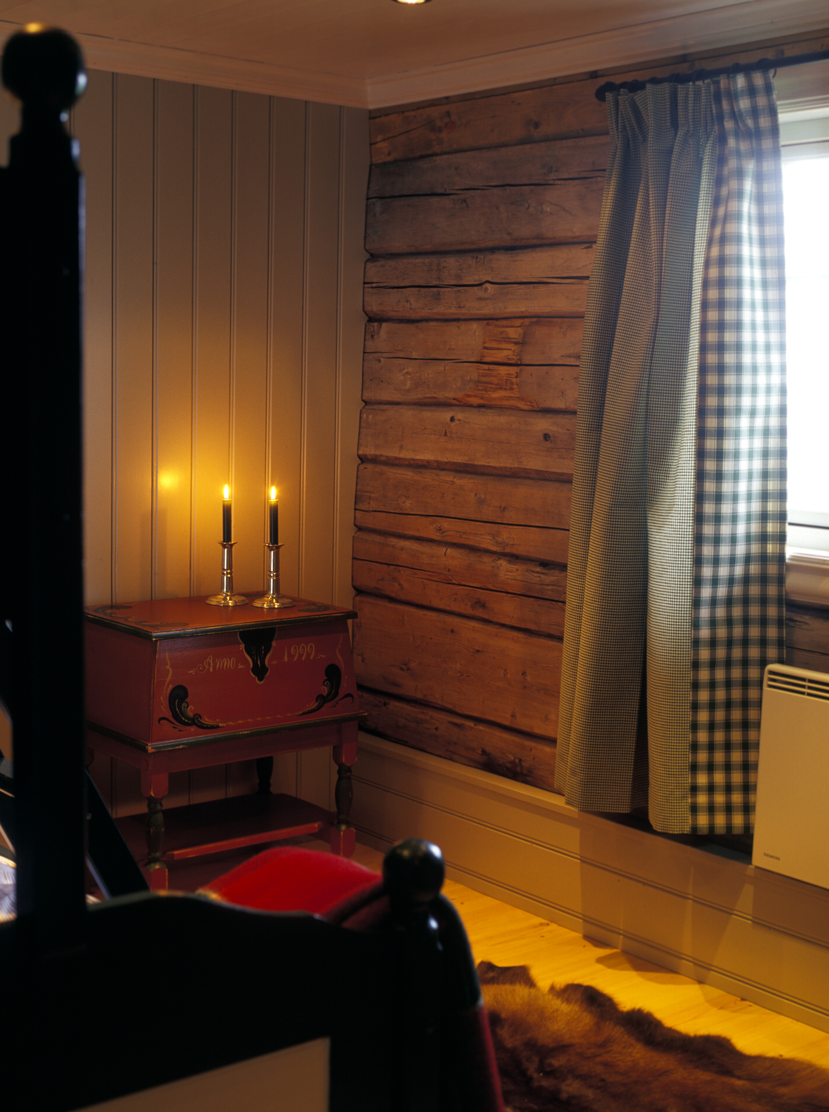 I tidligere tider ble det innvendige treverket alltid malt og dekorert, ofte for å vise økonomisk velstand, maling var dyrt den gang. Det først de siste 30-40 år at vi har brukt treverket i naturell tilstand. På denne tiden har vi innarbeidet en tradisjon med trehvitt hytteinteriør. For mange er det slik hytta skal være, heltre i vegger, gulv, tak og innredning. Så også for eierne her. Det var deres utgangspunkt, men etter rådføring med IFI - Informasjonskontoret for farge og interiør og interiørrådgiver Ellen Skifjeld Lønnestad ble det annerledes. Eierne fikk et forslag om fargelegging av hele hytta innvendig, samt gardin- og møbelforslag. Og etter en tids modningspause valgte de å male. Riktignok satt de store, flotte rundtømmerstokkene i stua langt inne. De ble malt til slutt. Da hytta var ferdig i all sin fargeprakt, var tilbakemeldingene entydig, ikke bare fra familien selv, men også fra venner og hyttenaboer: Dette ble berre lekkert!