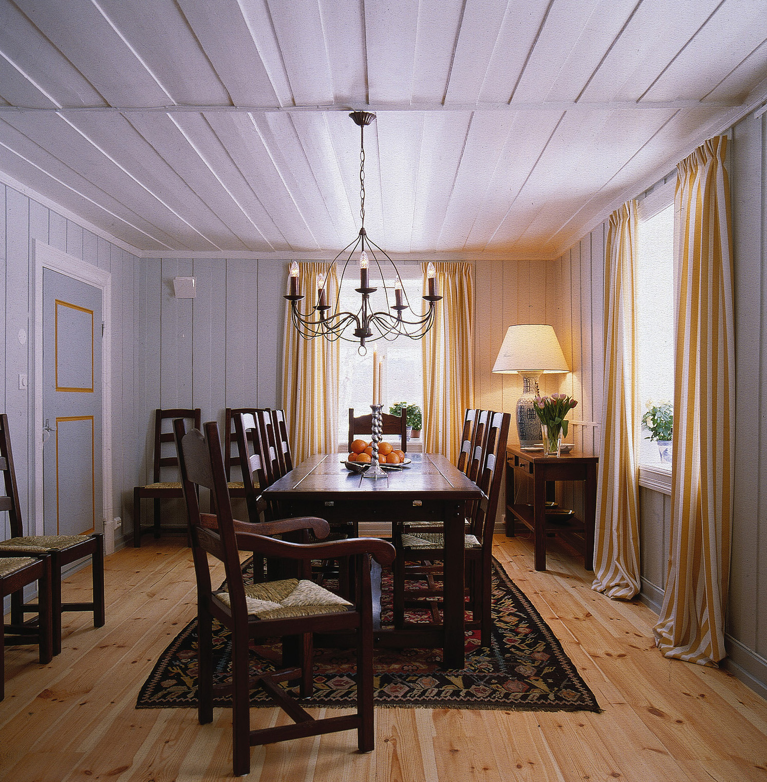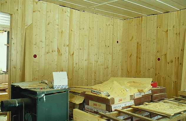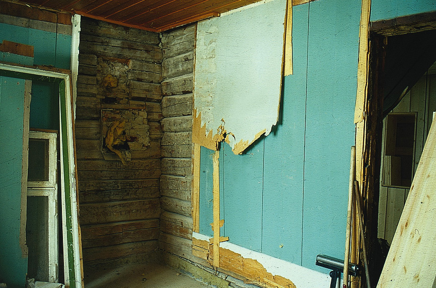 Panelet i tak og på vegger er stort sett det opprinnelige, for det meste skyggepanel i forskjellig utførelse. Størstedelen av kledningen er høvlet for hånd, dels med svært store dimensjoner på bordene. Noen steder var kledningen dekket med plater, men disse ble fjernet og det gamle panelet hentet fram. Der det ikke var brukbart, ble nytt laget på gammelt vis. Uskadet listverk ble forsiktig tatt ned og brukt på nytt. Nye lister ble laget etter mønster av de gamle.