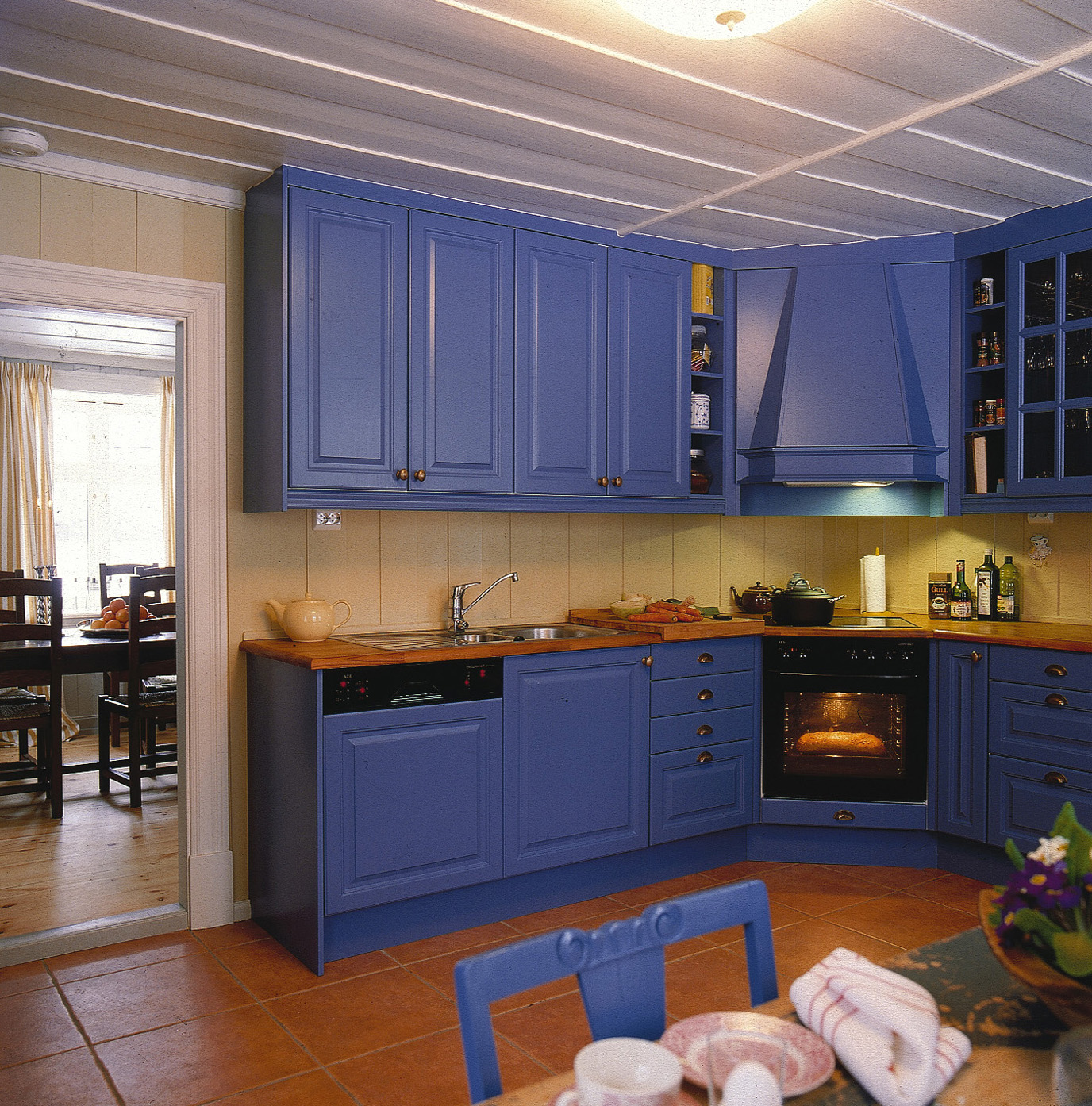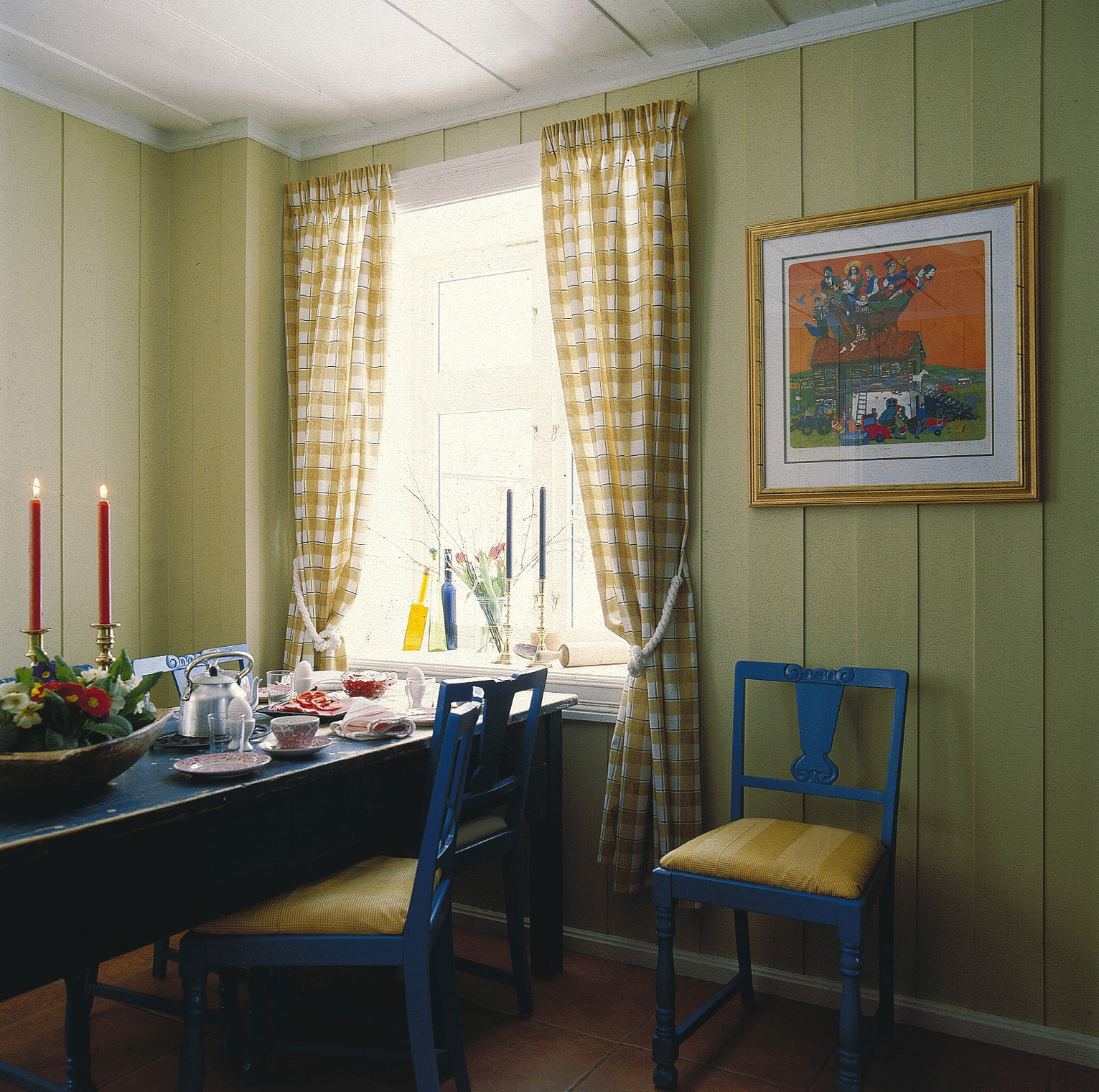 Når det gjaldt farger, ønsket eierne et tradisjonelt preg. De ville ha markerte soverom, "det blå", "det grønne" osv.. De ønsket seg også et gult inngangsparti, fordi gul er en vennlig og innbydende farge. I stuene i første etasje ønsket de lyse, nøytrale farger. På grunn av de store lysflatene (mange vinduer og gjennomlys) kunne en også bruke relativt sterke farger og likevel oppnå et lyst, men samtidig lunt preg.