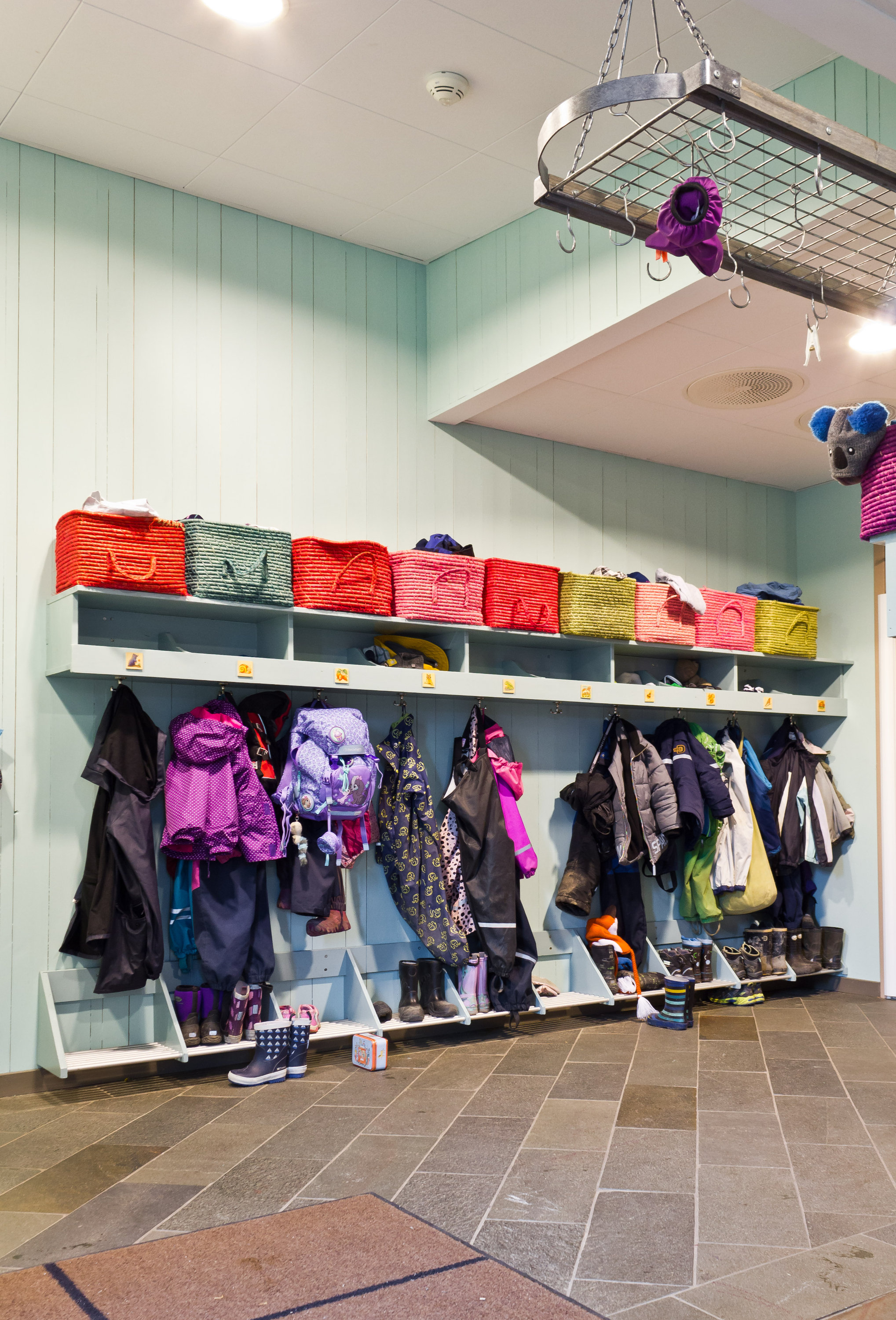– Blått en ganske alvorlig farge. Den kompletteres av kurver for barnas klær og utstyr i flere farger, sier Hovland og legger til at Tyttebær-avdelingens dempede grønnfarge er hentet fra tyttebærlyngen. De sterkt røde kurvene henspeiler på bærene.