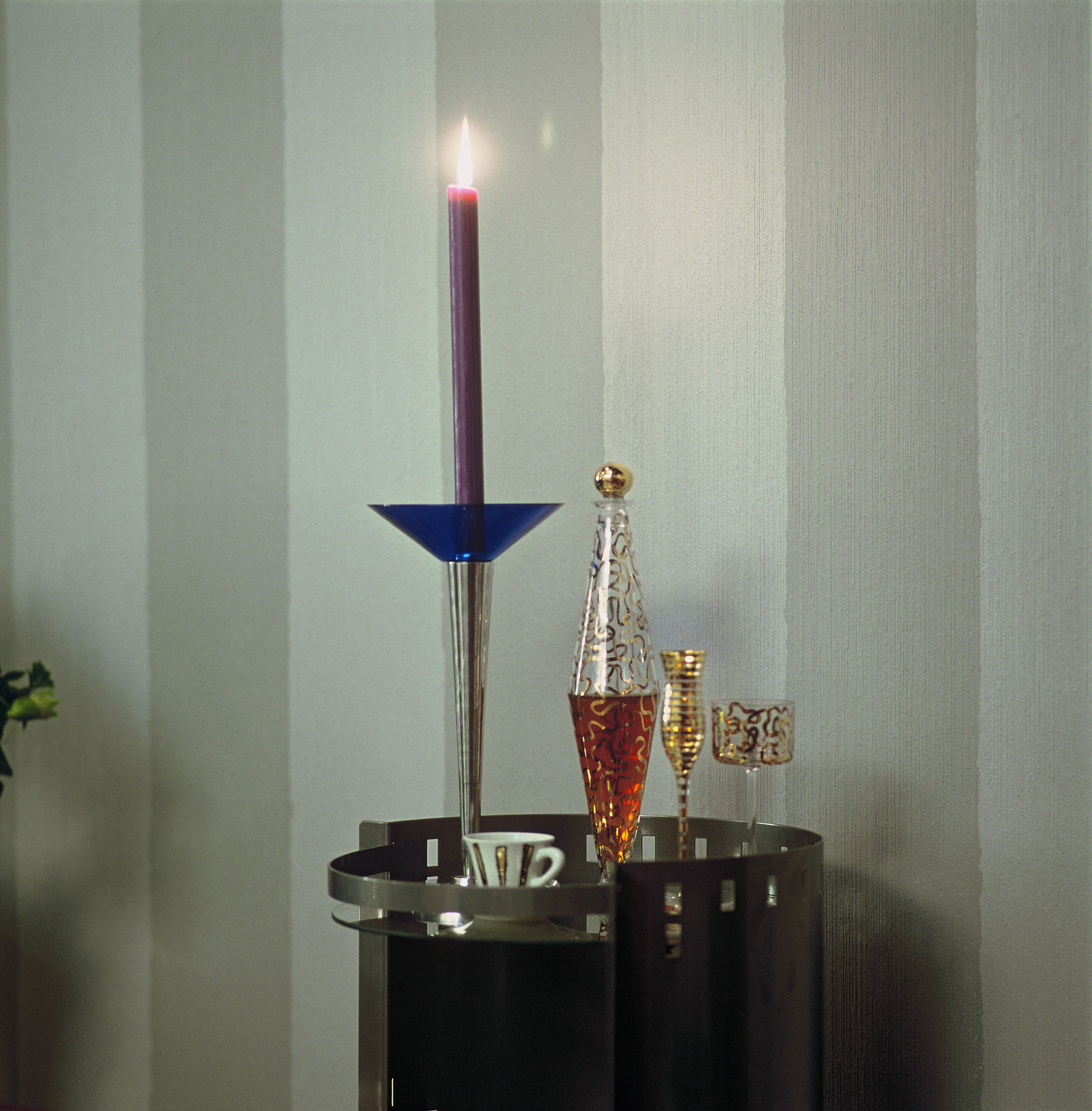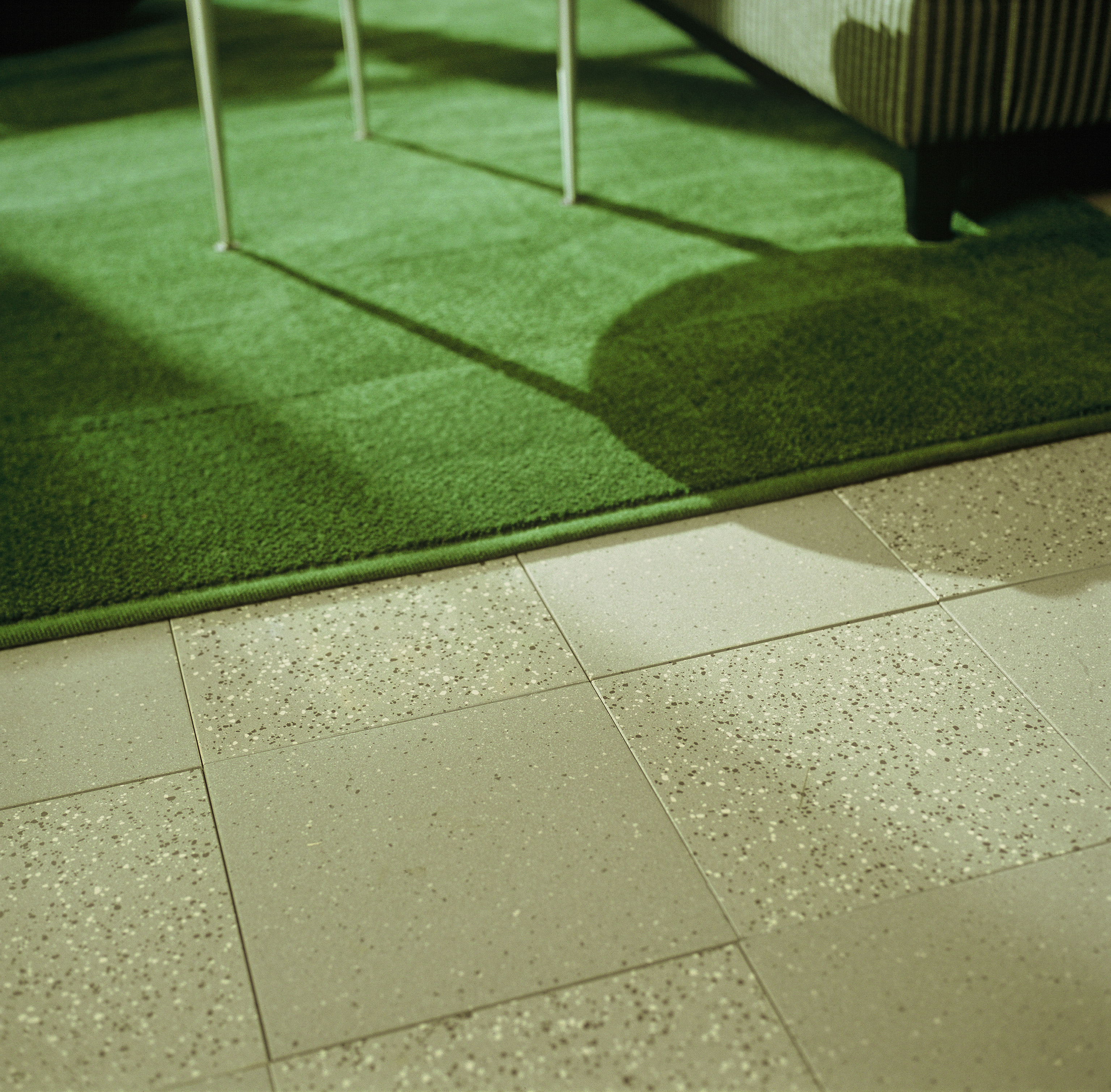 Eksklusive materialer og fine overflater hvor lær og metall blir en kontrast til myke og transparente tekstiler. Lysvirkninger og effekter med glass, gjerne sandblåst, hører med. Stål og aluminium gjentas, og litt gull skaper spenning. De rette linjer, striper og ruter får motvekt i runde former på stol, glassbord og eggeformet puff. Halvparten av gulvets keramiske fliser er polert, og det gir en spennende matt/blank-effekt. Den blanke flisen gir også en fin lyseffekt i rommet. Gulvteppet er i myk, ren ull i vevet rutemønster. Flate og "tørre" tekstiler blandes med fnugglette og transparente stoffer. Møblene må gjerne være trukket med lær.