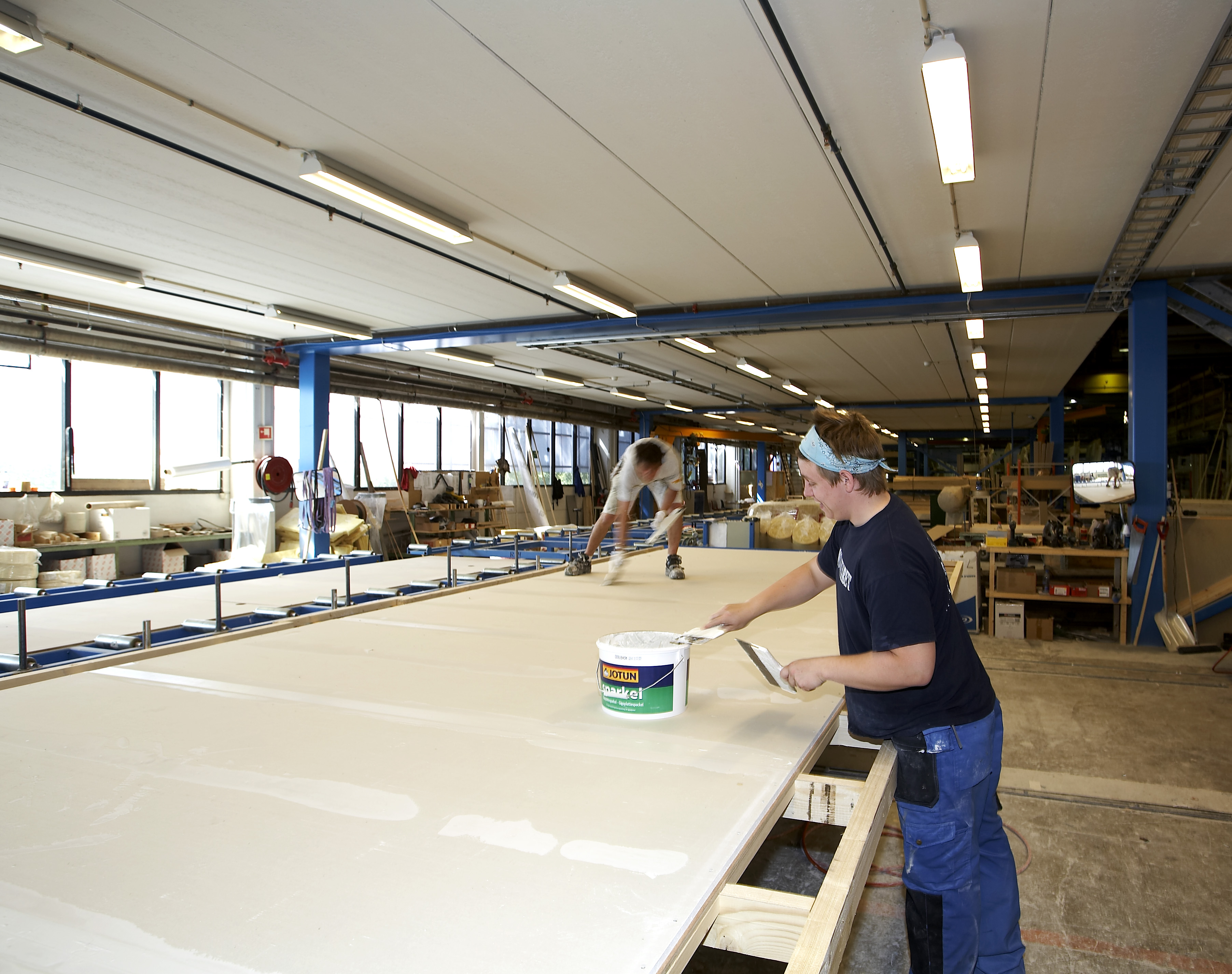 - Det er ingen roboter som bygger her. Dette er husbygging under tak, forteller direktør Hans Erik Stadshaug. -Bygging under tak betyr også at vi utstyrer modulene mest mulig. De kan være helt ferdige hvis kundene ønsker det - i boligenheter med komplett bad og kjøkkenutstyr. Dermed leverer vi alt over grunnmur.