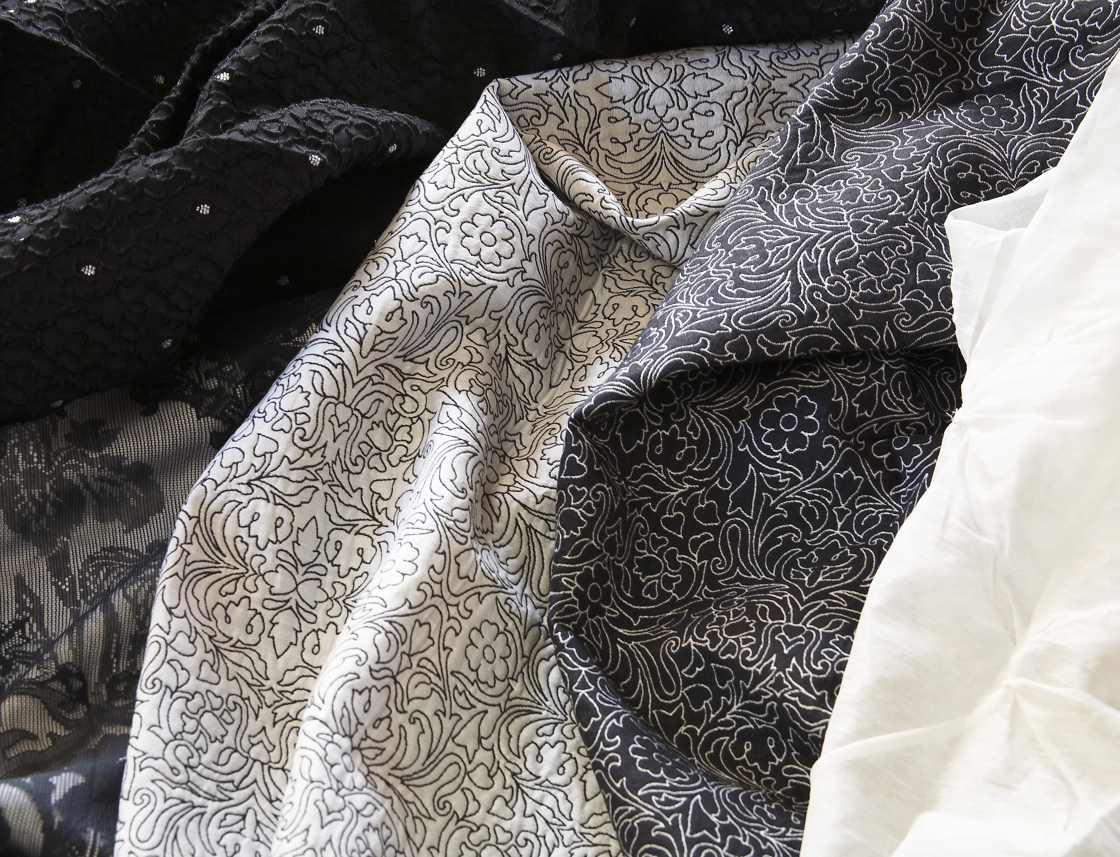 - Vi ser mye av store ornamentale mønstre og blandinger mellom blanke og matte overflater, sier Bjørg og viser frem et hvitt silkestoff med sorte barokkinspirerte blomster i flokktrykk.