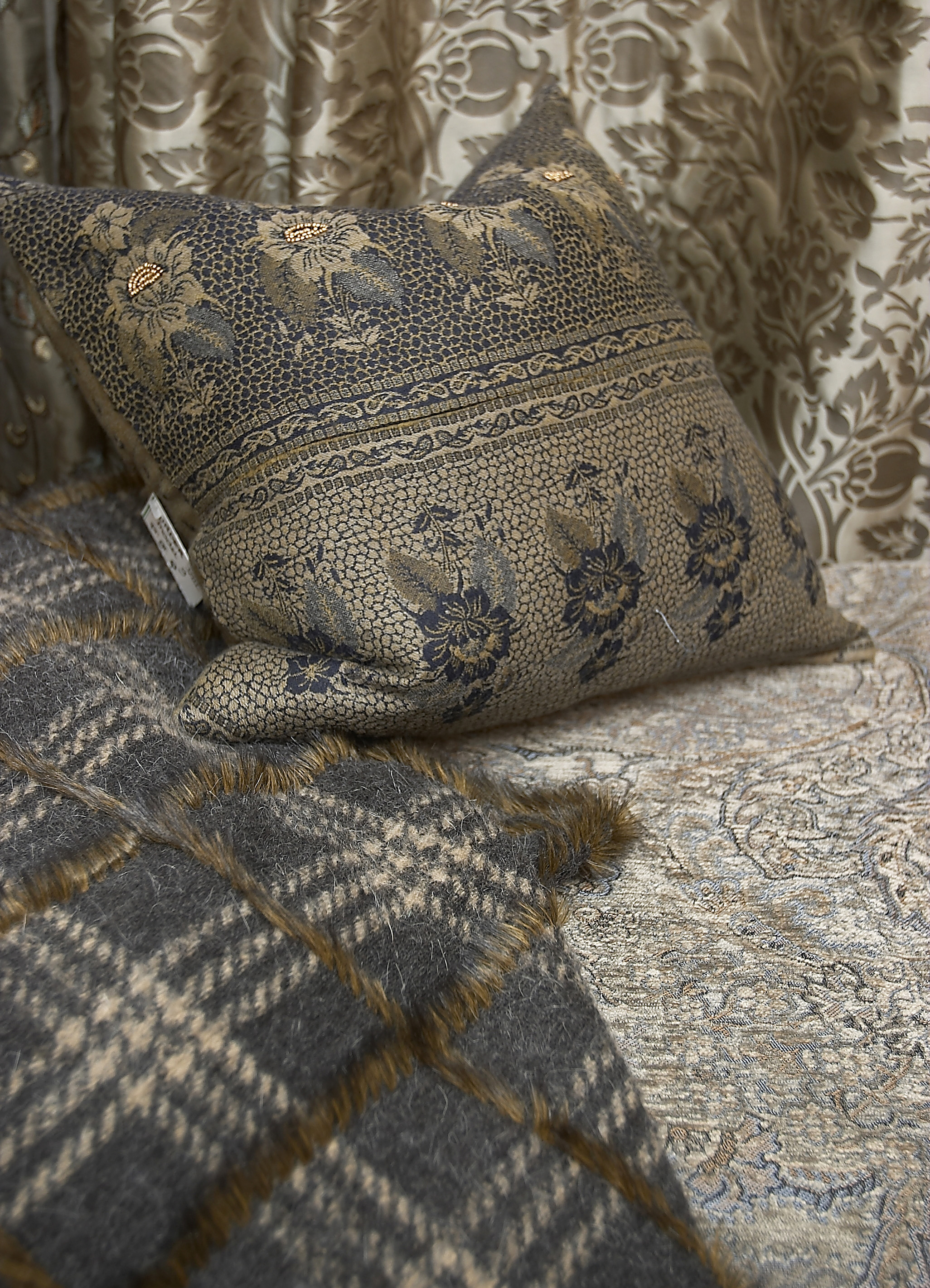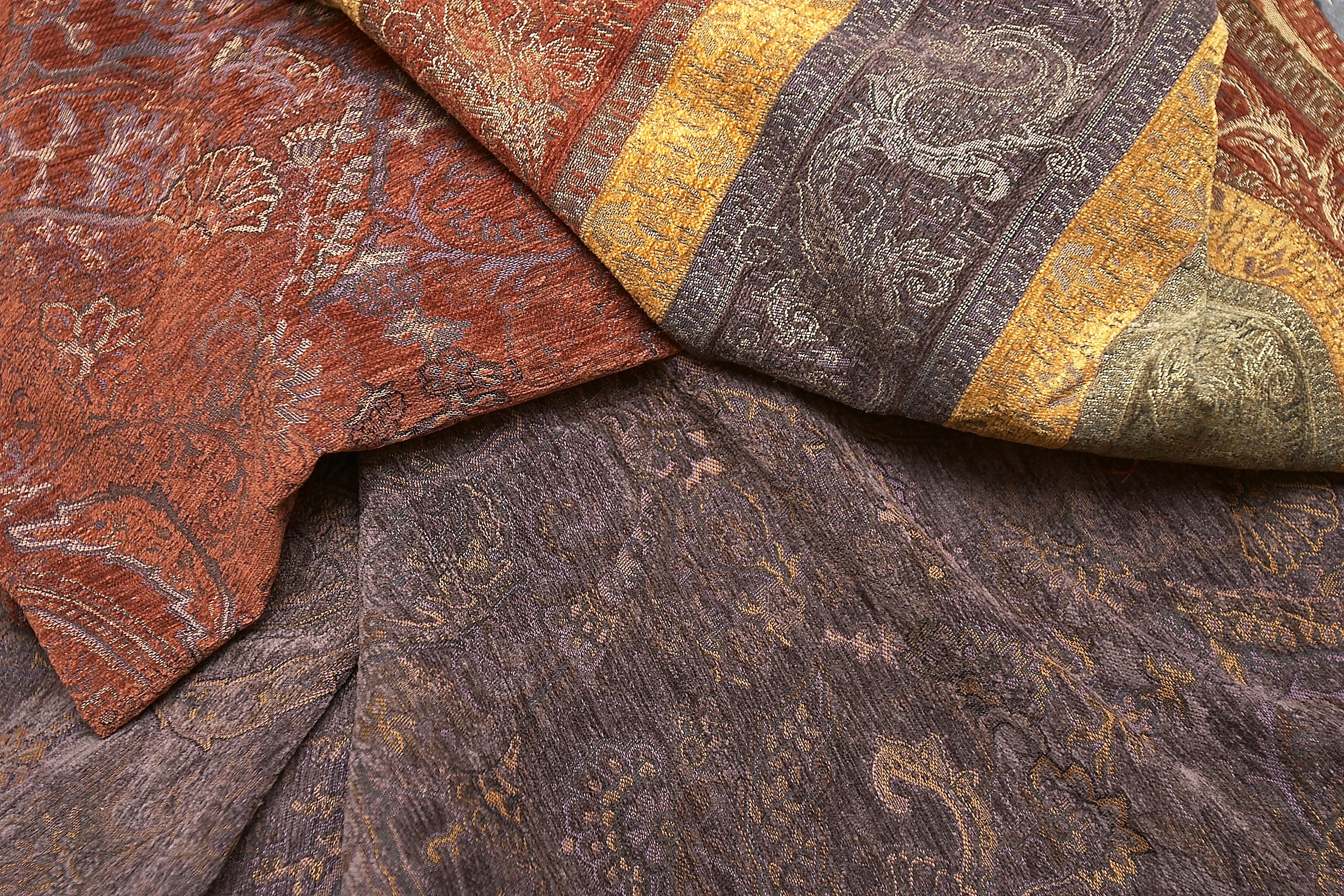 Silke kommer for fullt. Det gir mer liv til flaten enn bomull. Dessuten er det masse chenille og taft. I tillegg kommer mye ull. Man kombinerer gjerne til en blank/matt effekt og supplerer mønstrene med perler, paljetter, pels og semsket skinn.