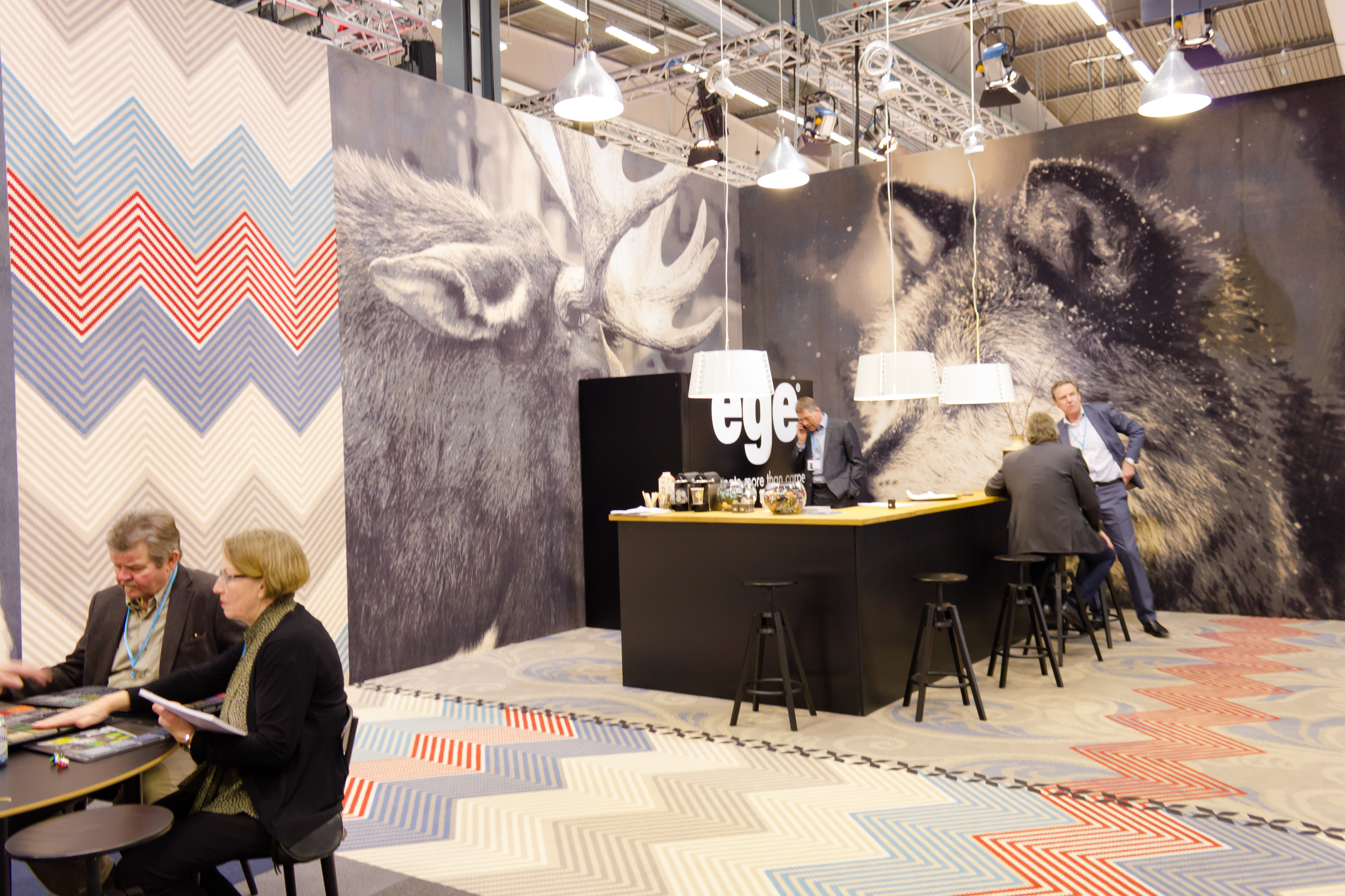 Naturtemaet var fremtredende også hos Egetepper, der standen var kledd med store digitaltrykkede tepper med intense nærbilder av ulv, ugler og elg – med innskutte trendy zig-zag-striper. Teppet på bakveggen og en gavl var laget i ett stykke, i fire meters bredde.