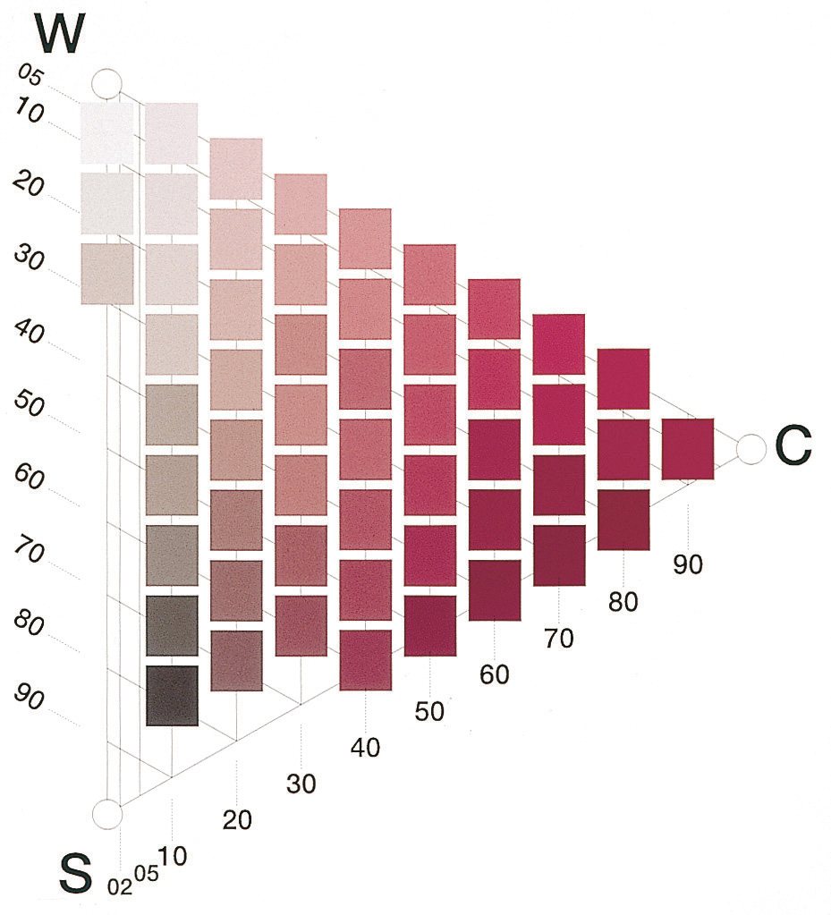 Trekanten forteller hva som skjer med kuløren når den "spes ut" fra full kulør slik at sorthet eller hvithet dominerer. NCS-koden uttrykker dette i prosent. Tenk deg at sort + hvitt + kulør = 100 %. Først kommer et tall for sortheten, deretter for kulørtheten - resten opp til 100 utgjør hvitheten, men det blir overflødig å skrive. Er første del av koden 1040, vil det si at nyansen har 10 % sorthet i seg og 40 % kulør. Da blir det 50 % igjen til hvithet.