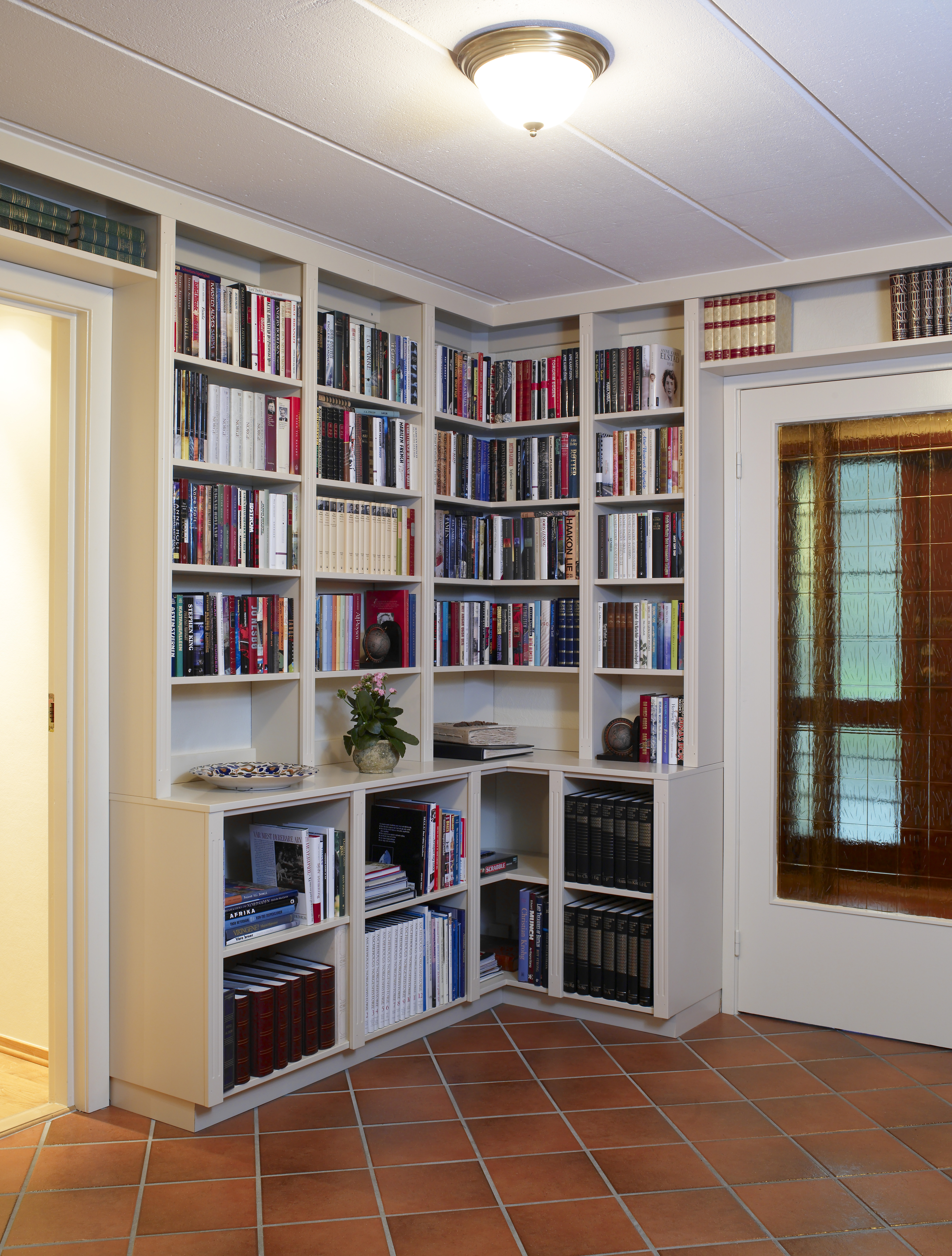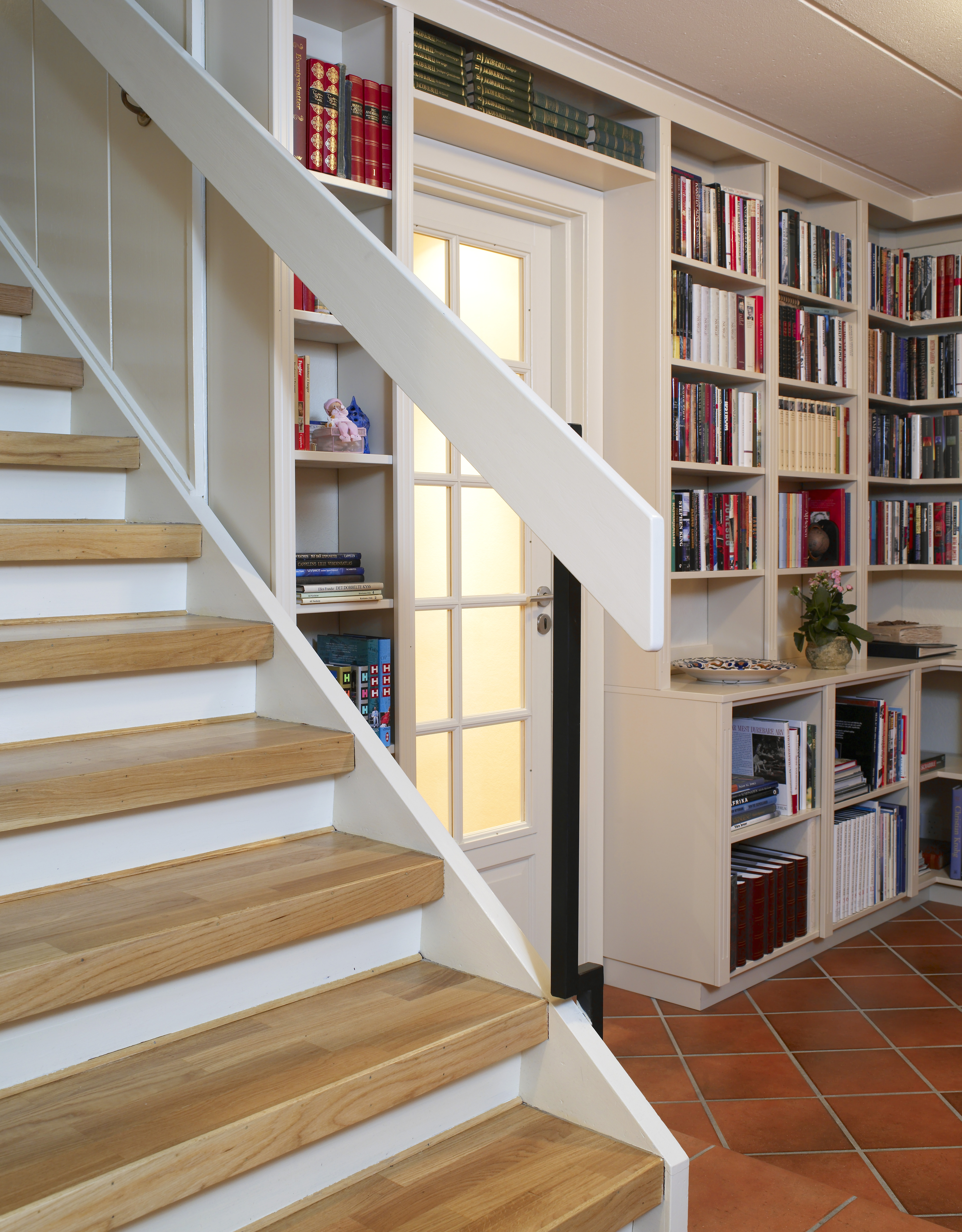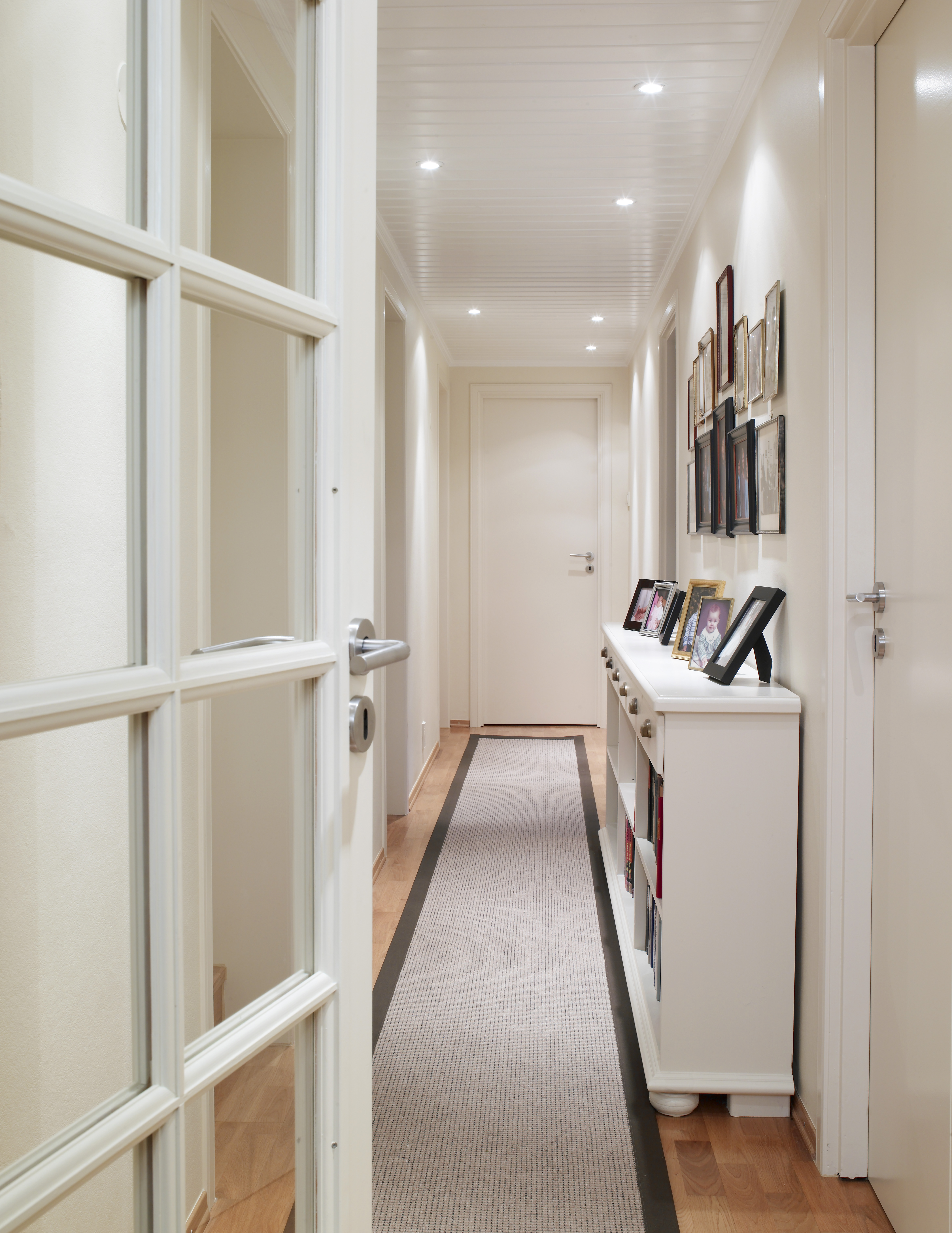 Marianne ville ikke ha bøker oppe i stuen, så vi lagde biblioteket hun lenge hadde ønsket seg nede i den store hallen.Soveromsgangen var en lang tarm, og brystningspanel er bare vellykket i gamle Frognerleiligheter. Så vi fjernet alt løst, og lyste den opp med ny farge. Det som kostet penger er peisveggen og de spesiallagde skapene og hyllene. Resten er gjort ved hjelp av ommøblering og maling.