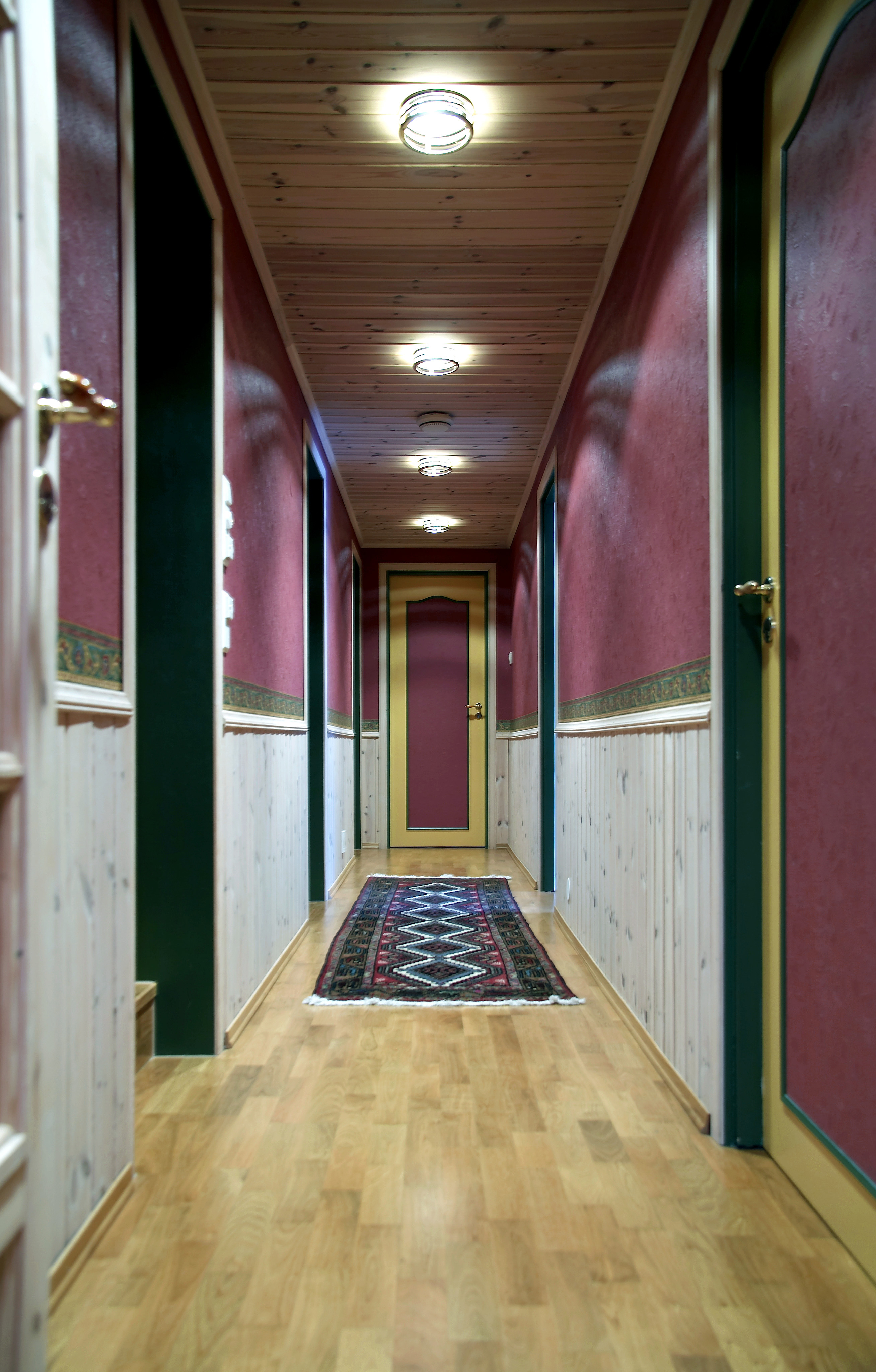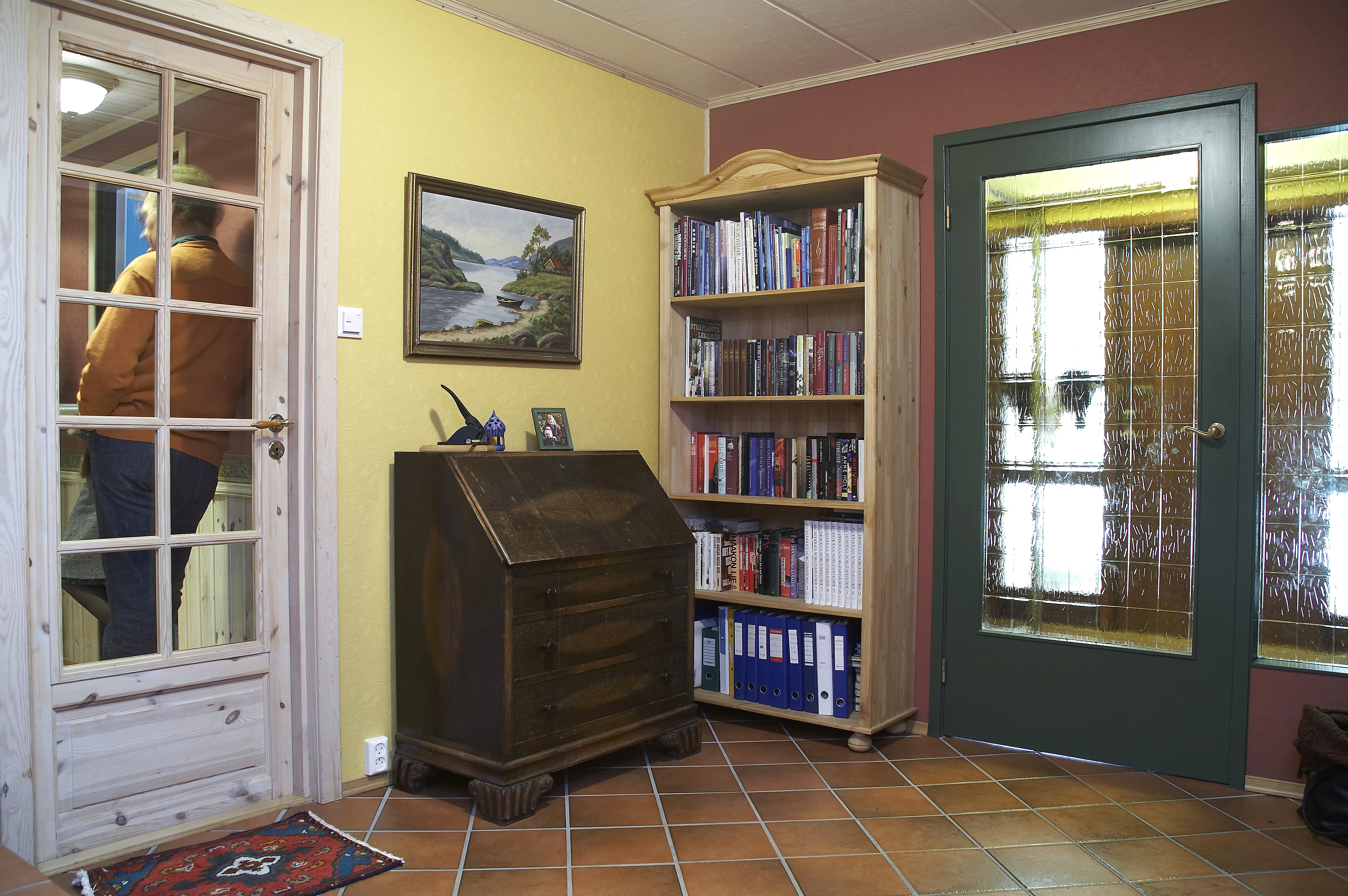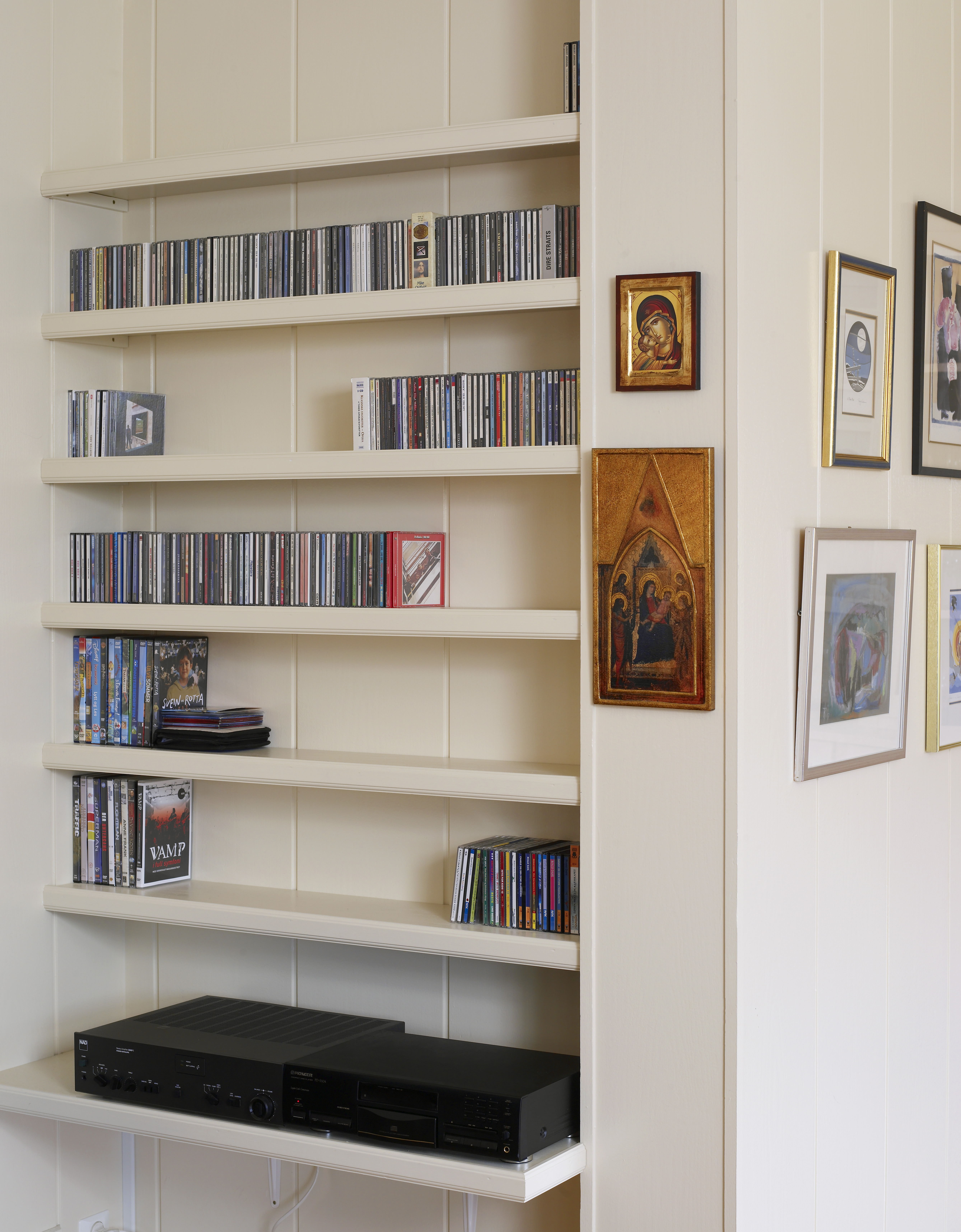 Marianne ville ikke ha bøker oppe i stuen, så vi lagde biblioteket hun lenge hadde ønsket seg nede i den store hallen.Soveromsgangen var en lang tarm, og brystningspanel er bare vellykket i gamle Frognerleiligheter. Så vi fjernet alt løst, og lyste den opp med ny farge. Det som kostet penger er peisveggen og de spesiallagde skapene og hyllene. Resten er gjort ved hjelp av ommøblering og maling.
