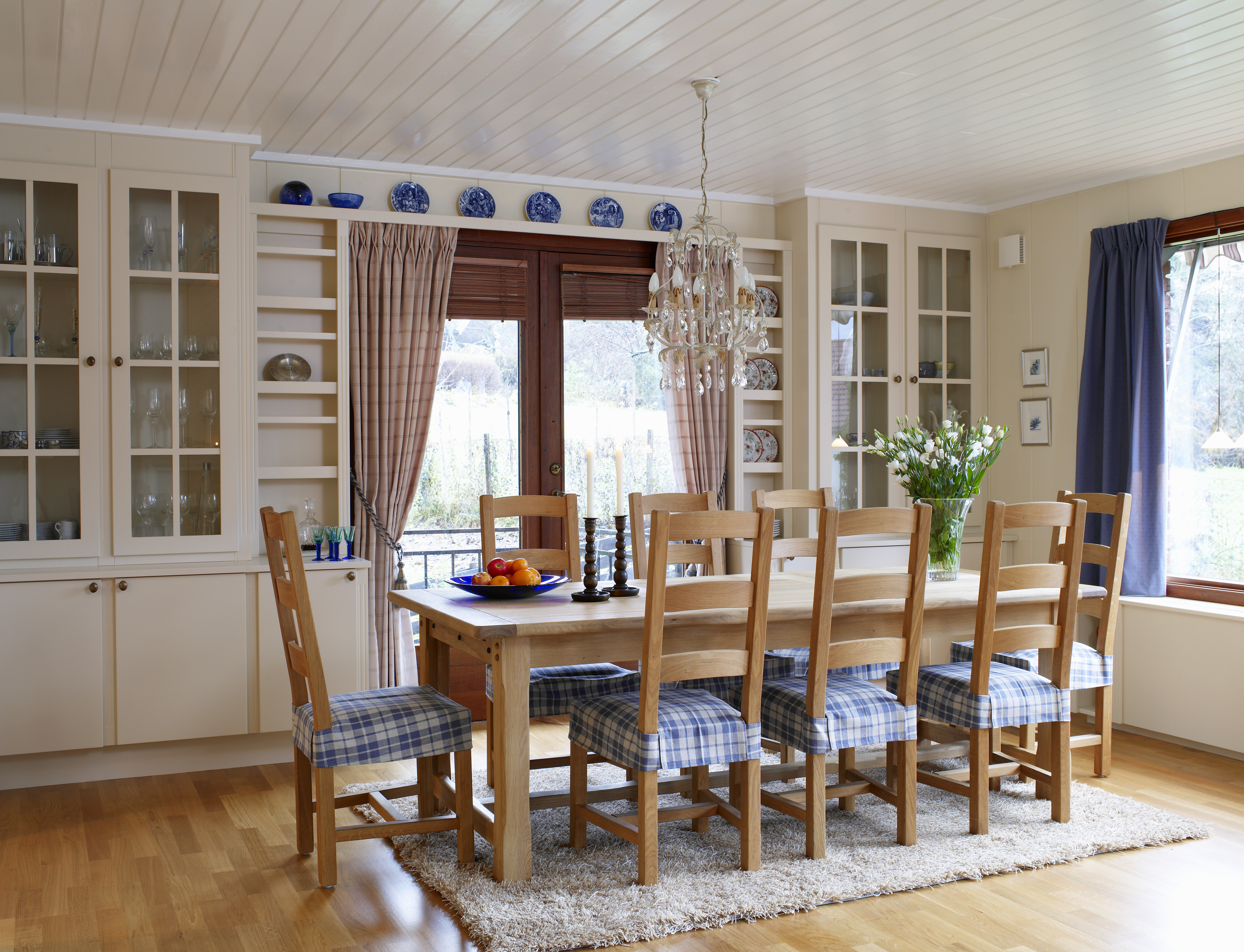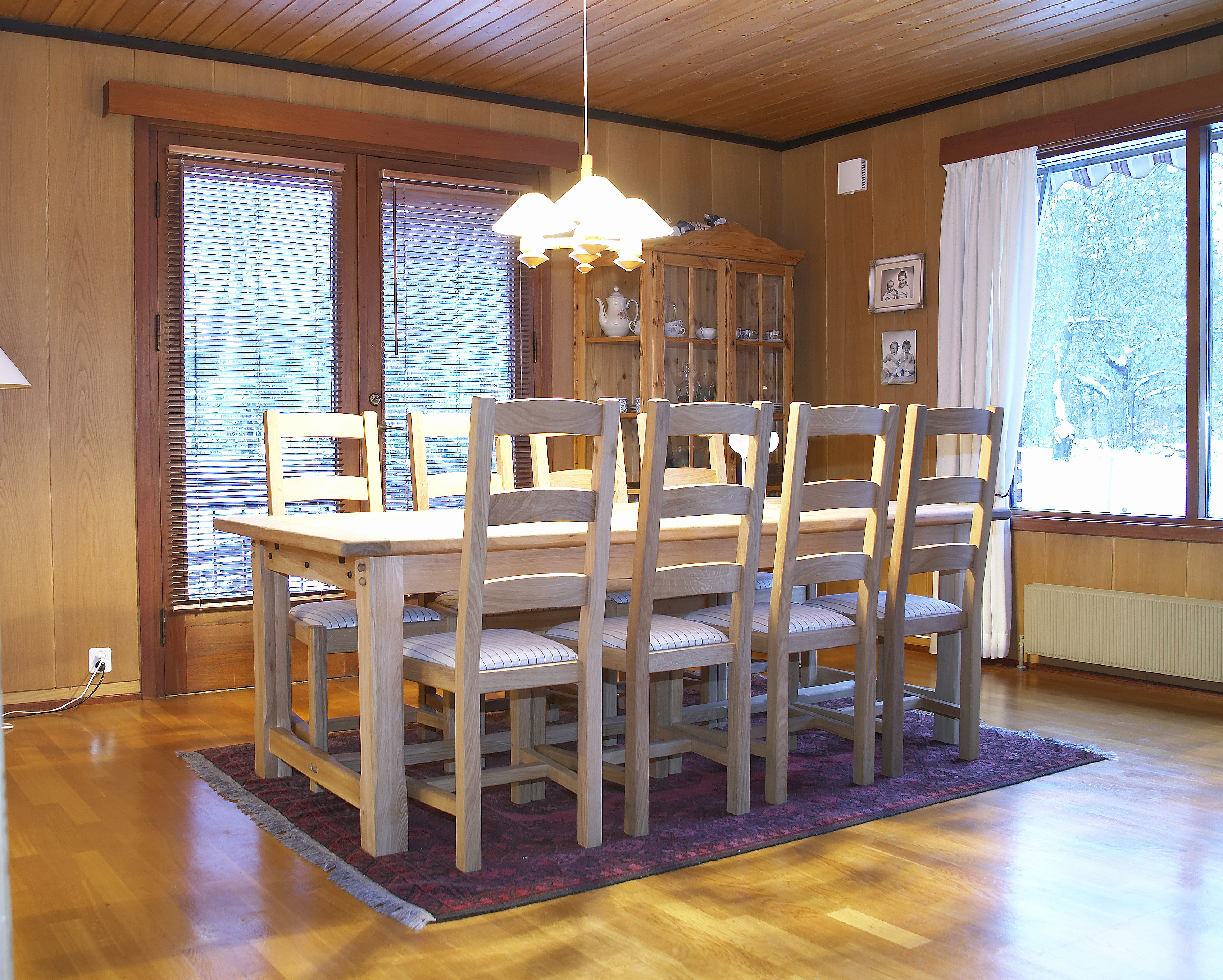 For å slippe mange ulike små skap, bygget vi spesialtilpassede skap i spisestue-delen av stuen. I den andre enden ble det så en finere avdeling for peis og kos, med en ny peis som er hyggelig også når den ikke er i bruk.