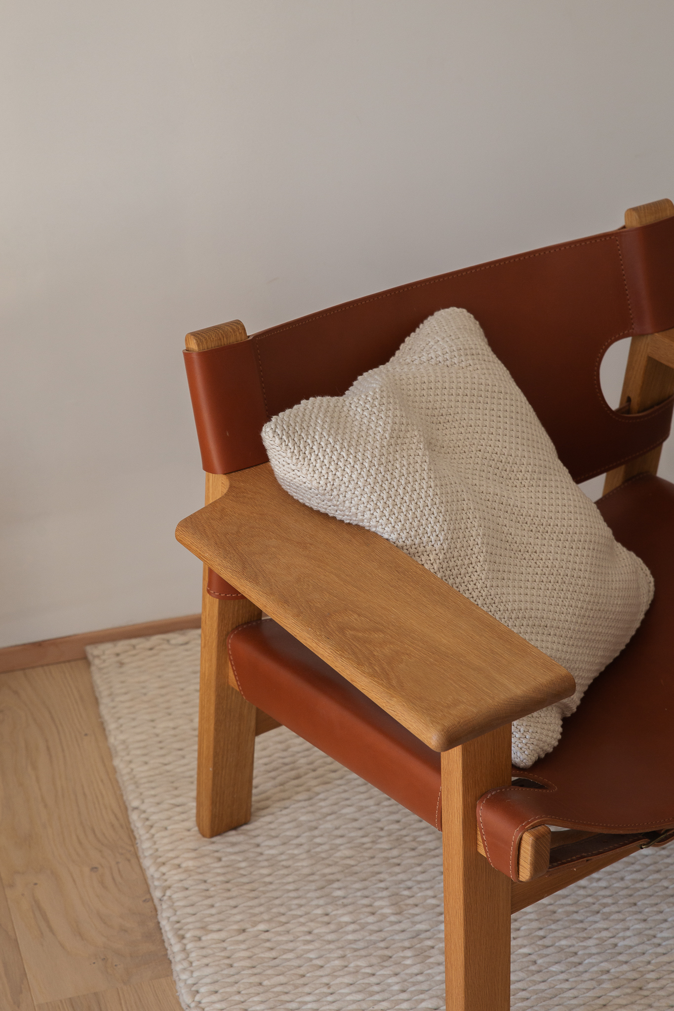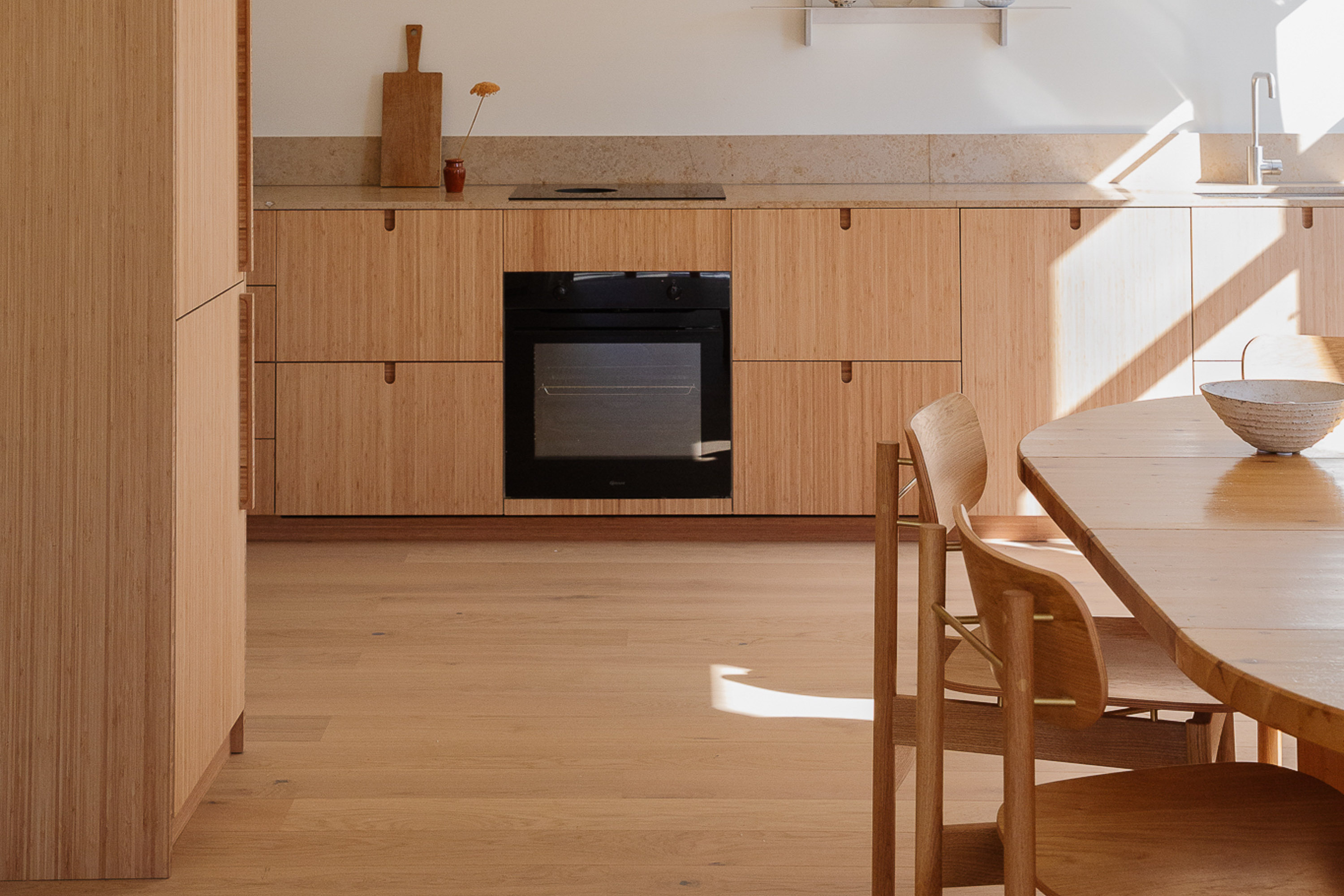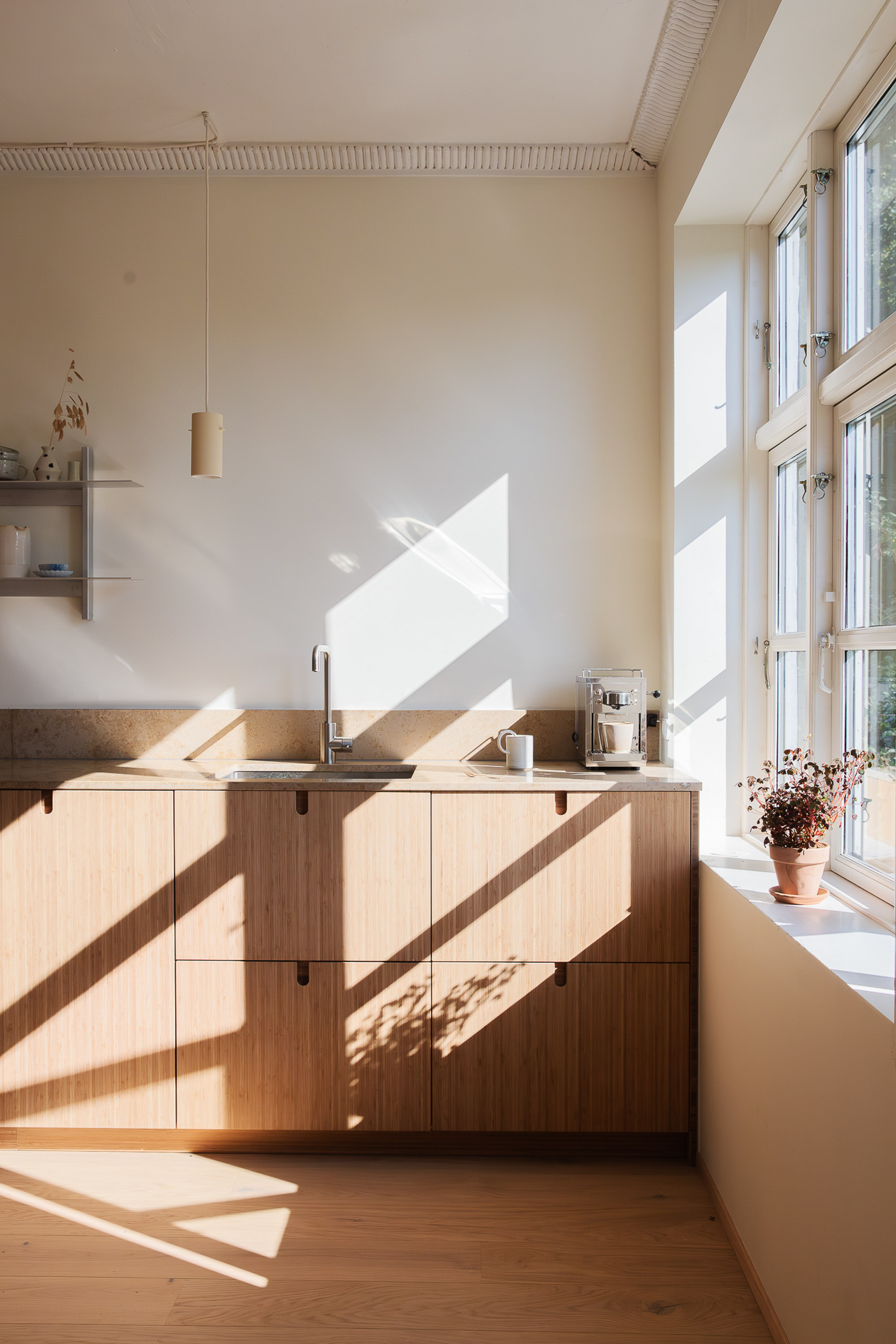 Hjemmet er innredet med varme naturmaterialer, og en sjarmerende miks av bruktfunn og nye, skandinaviske designmøbler. Det nye kjøkkenet er laget i bambus med en benkeplate av gulbeige kalkstein. Kjøkkenet har ingen overskap, men består av en lang, sammenhengende linje og kjøleskapet står fritt ved veggen. Koketoppen har innebygd ventilator. Veggene er malt i fargen «Bomull», og familien har lagt et nytt gulv av eikeparkett med lange, brede plank og en forsiktig hvit pigmentering.