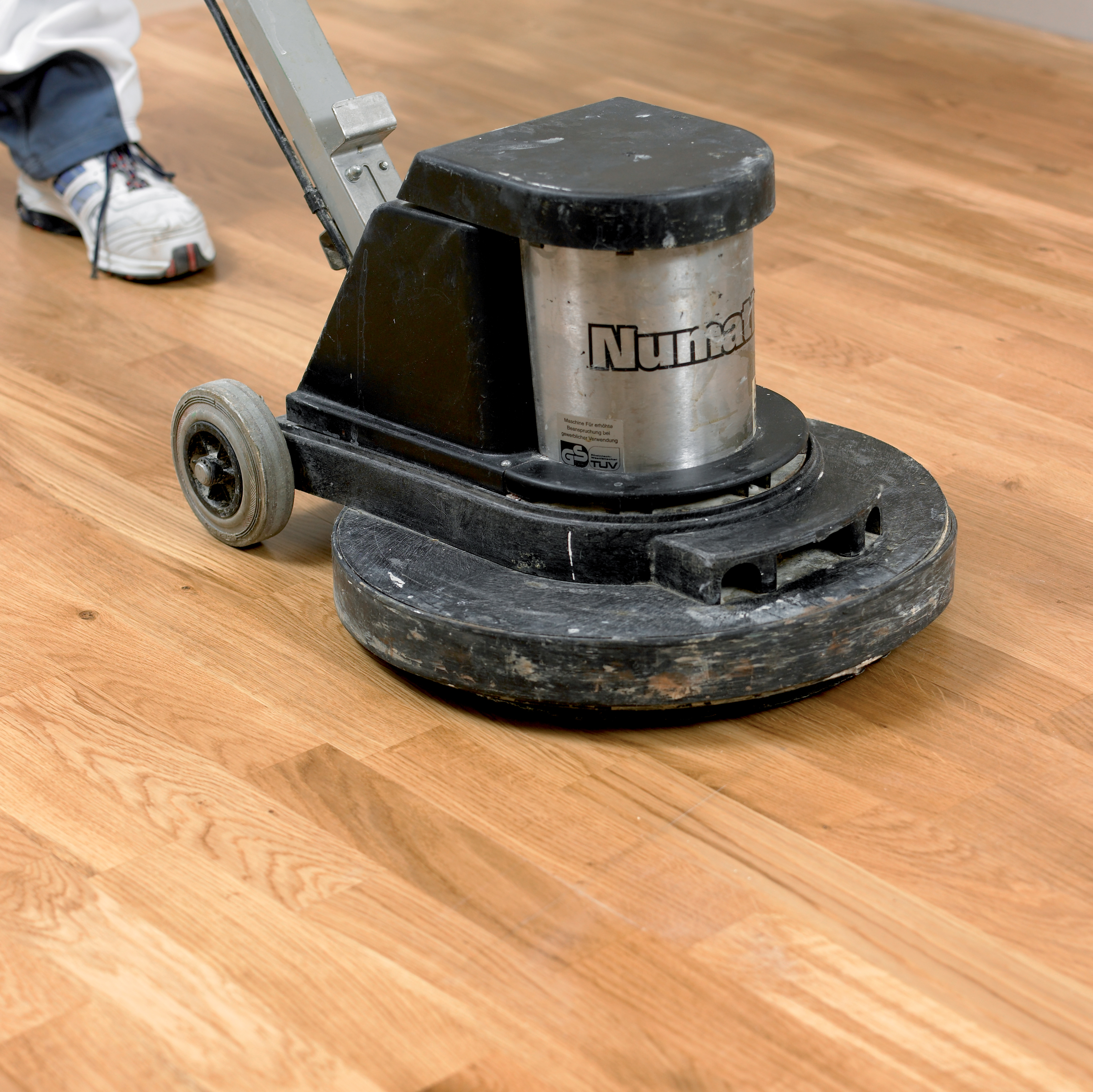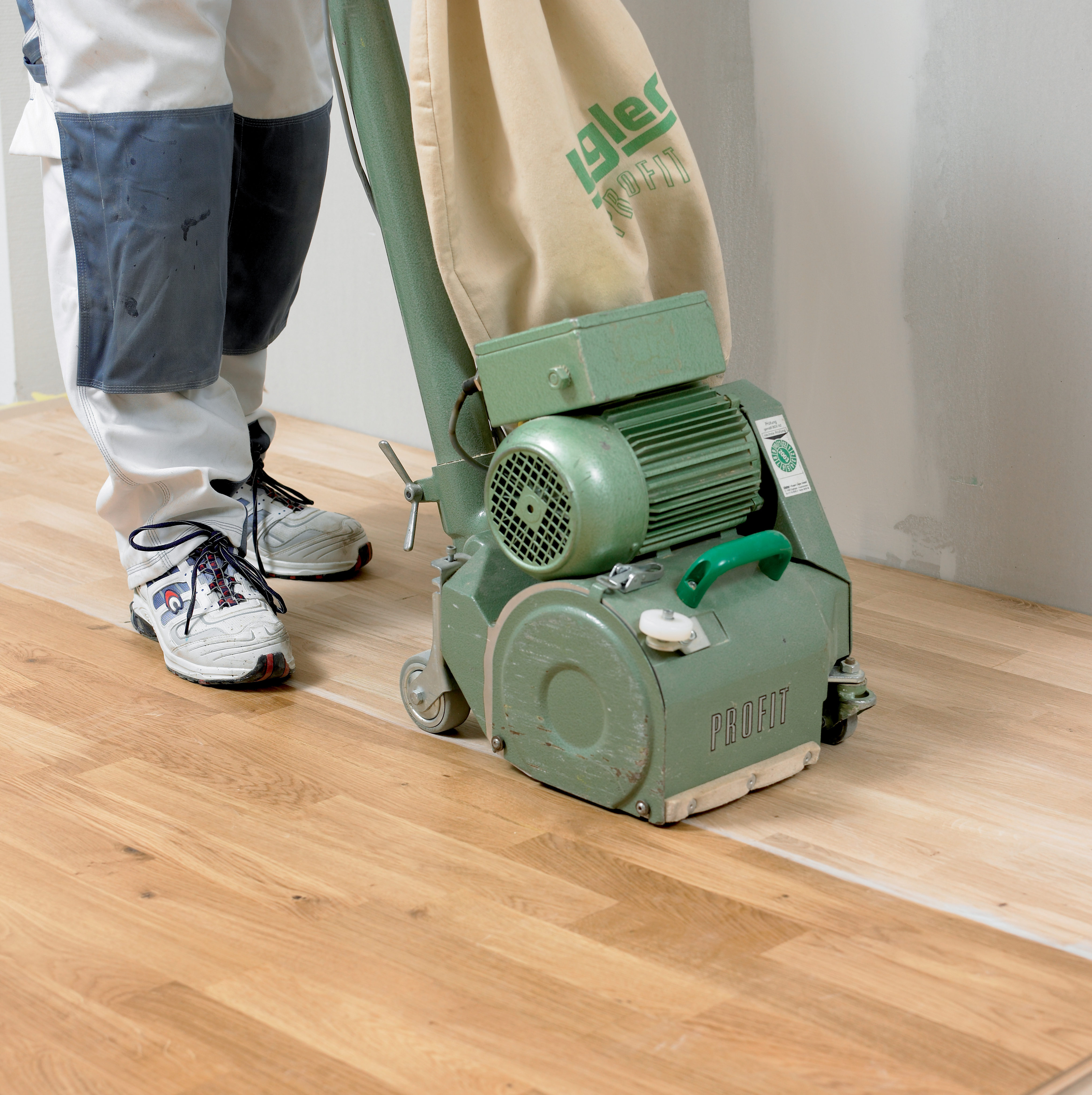 Før ny behandling skal på, bør gulvet slipes. Hvis gulvet har hakk og skader, bør du gå grundig til verks med slipingen. Dette fjerner den gamle lakken, og gjør gulvet jevnt og pent. Du kan godt få håndverkere til å gjøre jobben, men leier du riktig utstyr, er det ingenting i veien for å gjøre det selv.