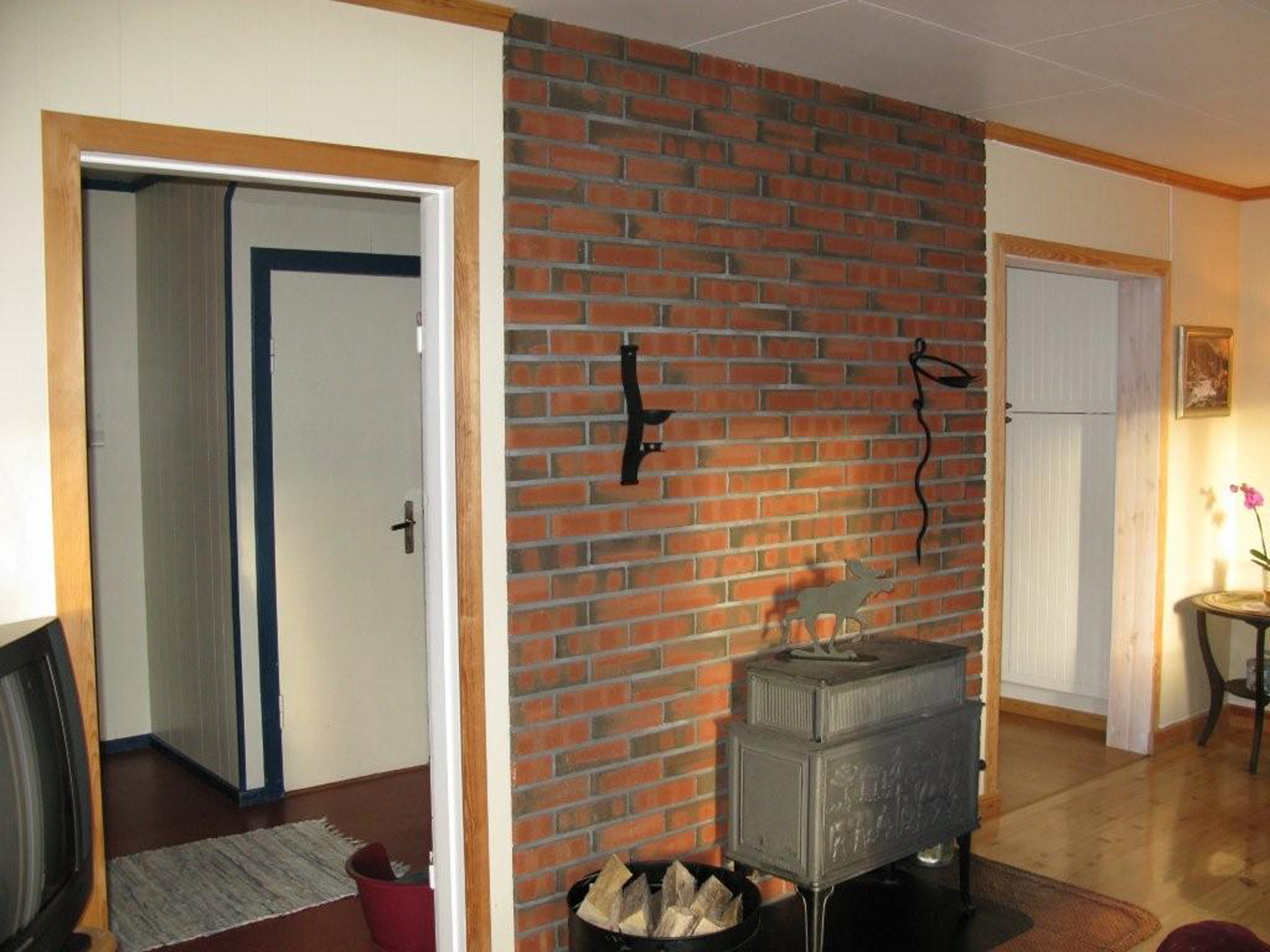 Listverk i ubehandlet furu, laminatgulv à la furu, brannmur i rød teglstein gjorde sitt for å gi rommet et utdatert preg.