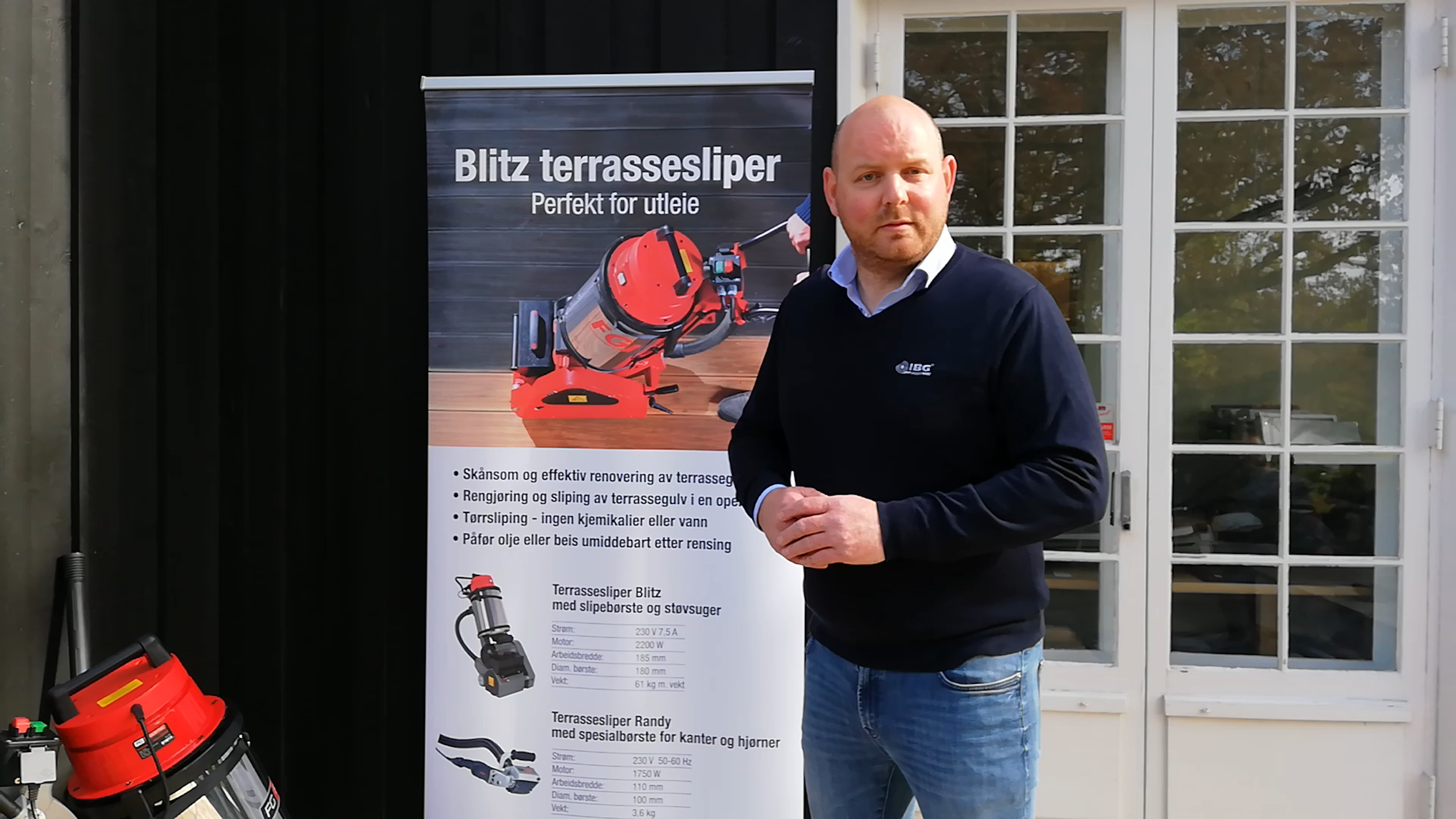 – Maskinen heter Blitz og er en terrassesliper eller terrasserenser som bruker børster for å få bort smuss, rester av gammel beis og det du måtte ha på terrassen, sier Owe Busland hos Industri- og Bolipgrodukter, IBG.