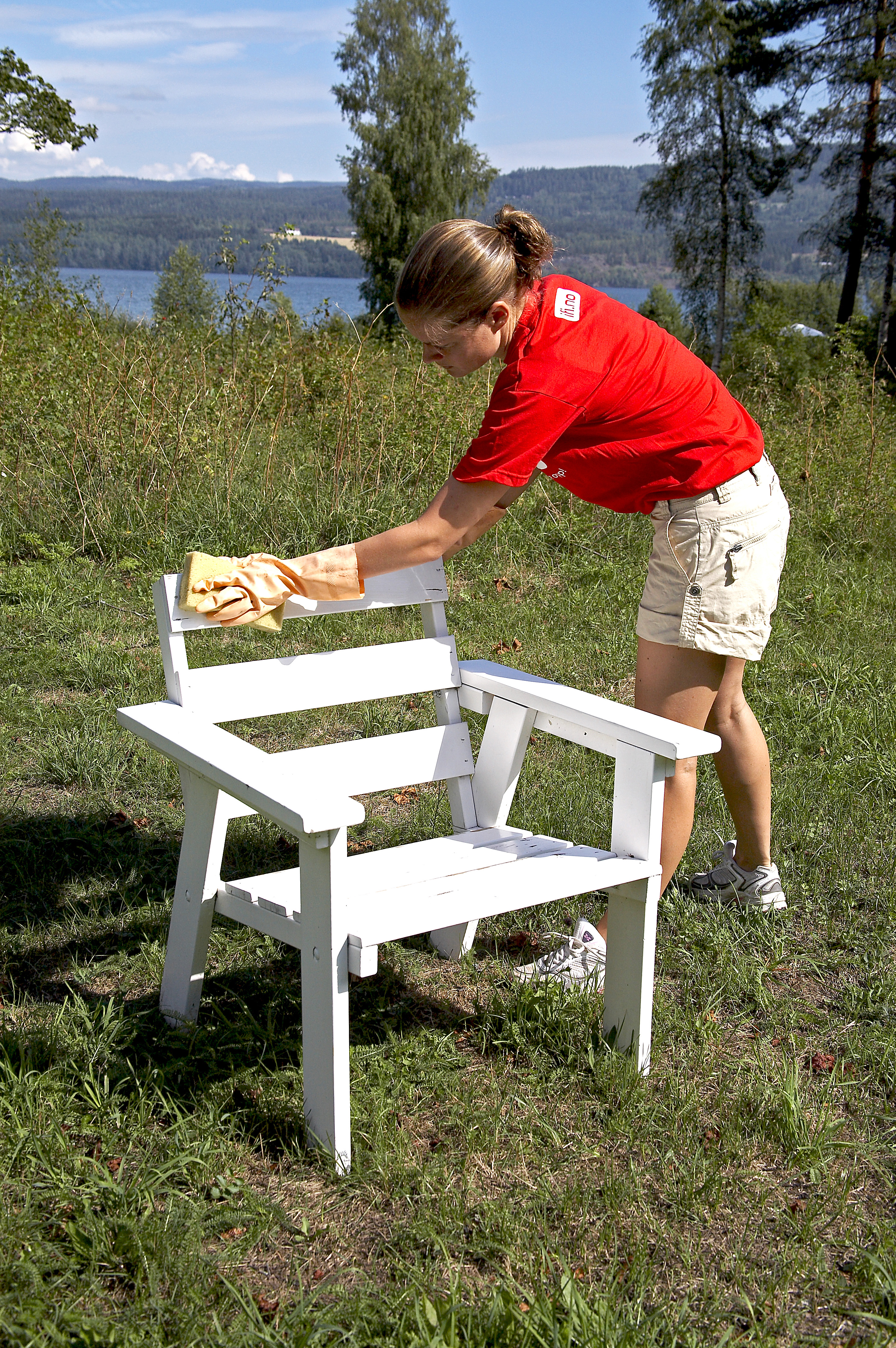 Når pussingen er over, har du et hagemøbel hvor det fremdeles sitter en del maling, mens mye av treverket er bart. Kjenn på alle overflatene med fingertuppene. Flatene skal være så glatte og fine som mulig. Når du kan gi pussingen karakteren "godkjent", vasker du med et alkalisk husvaskemiddel. Til det kan du bruke en natursvamp. La deretter møbelet tørke godt, kanskje et par dager.