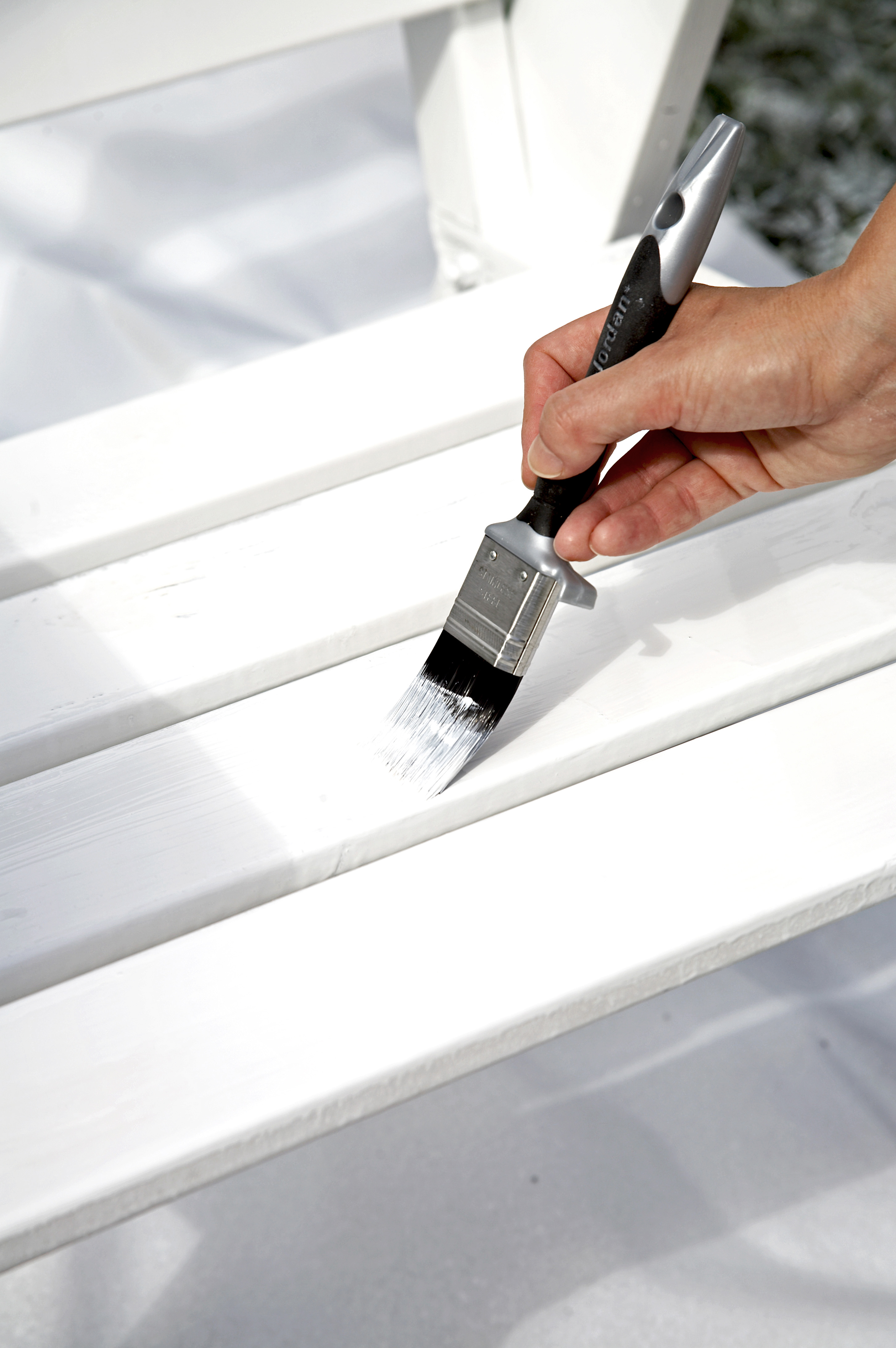 Mal deretter møbelet med to strøk maling i ønsket farge. Heller ikke malingen bør være vanlig utendørsmaling/dekkbeis. Slike produkter gir for myk overflate. Du skal bruke maling beregnet for vinduer og dører, eller maling for trebåter. De tåler mer juling. To strøk er nødvendig.