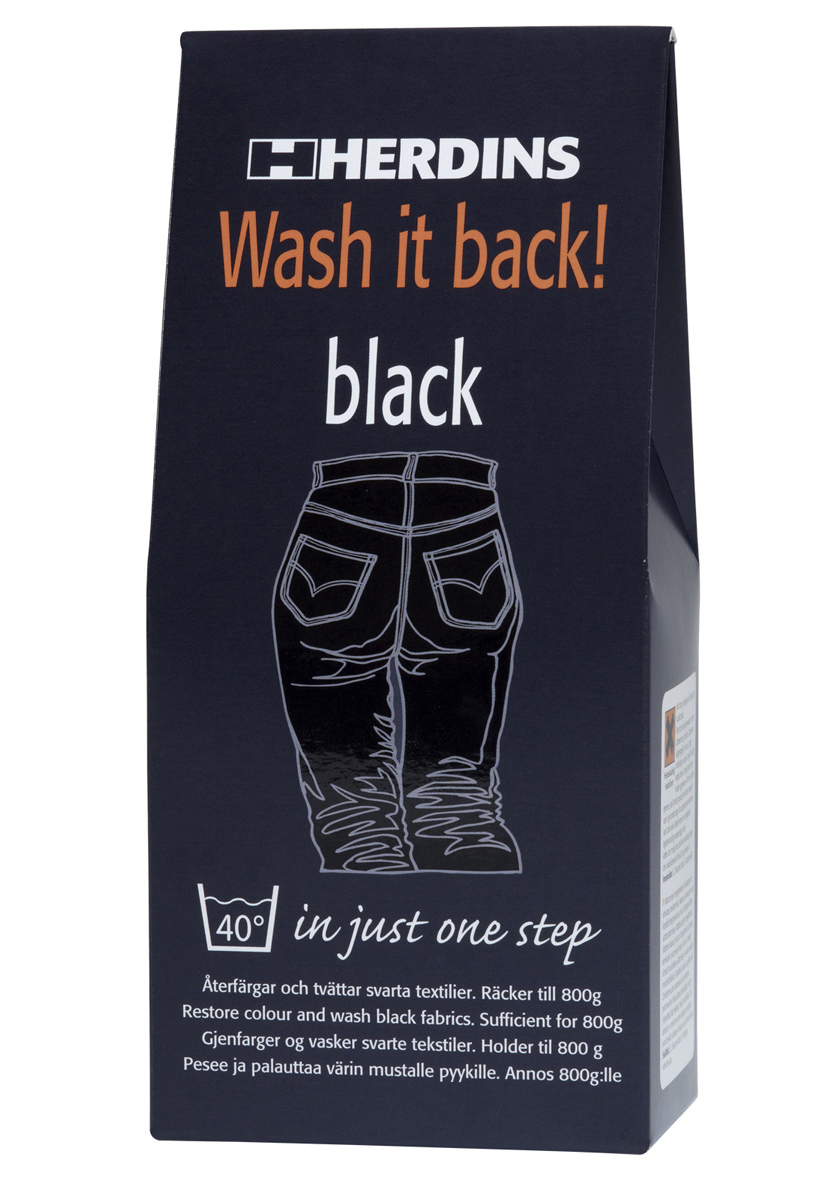 Nå kan man nemlig kjøpe farge som gjør buksa nesten så god som ny. Med Herdins Wash it back! - black kan man vaske og farge plagget som er utvasket på én og samme tid i vaskemaskinen. En fargepakke innholder alt man trenger til 800 gram tørre tekstiler, og fargen kan brukes på bomull, lin og viskose.