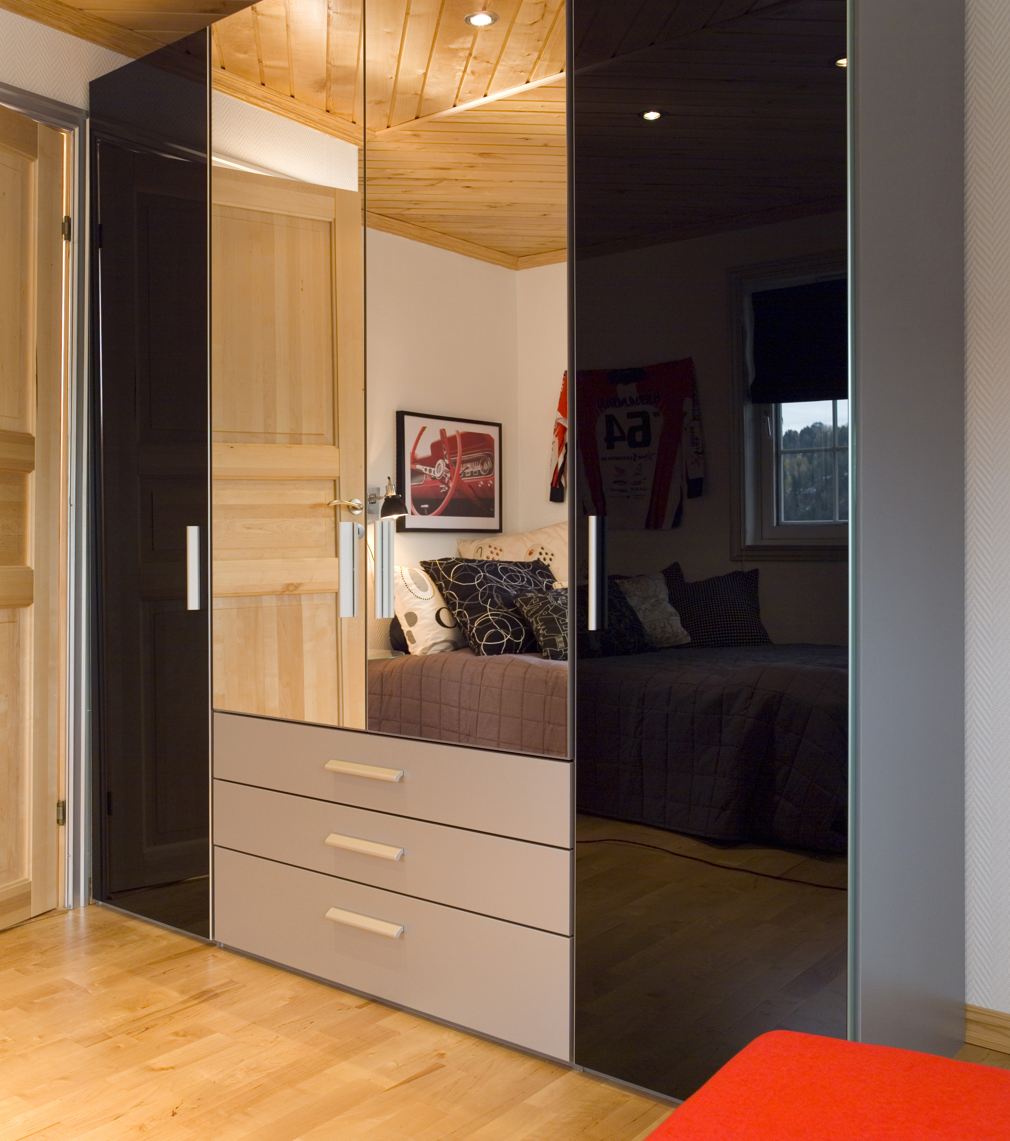 Det 12 kvadratmeter store rommet ble malt lyst, og vindusgeriktene ble kjempetøffe med et par strøk sølvmaling. Joachim fikk ny seng, skrivepult, stol og garderobeskap. Skrivebordet har glassplate, og skapfrontene er en blanding av klare og sotfargede speil.