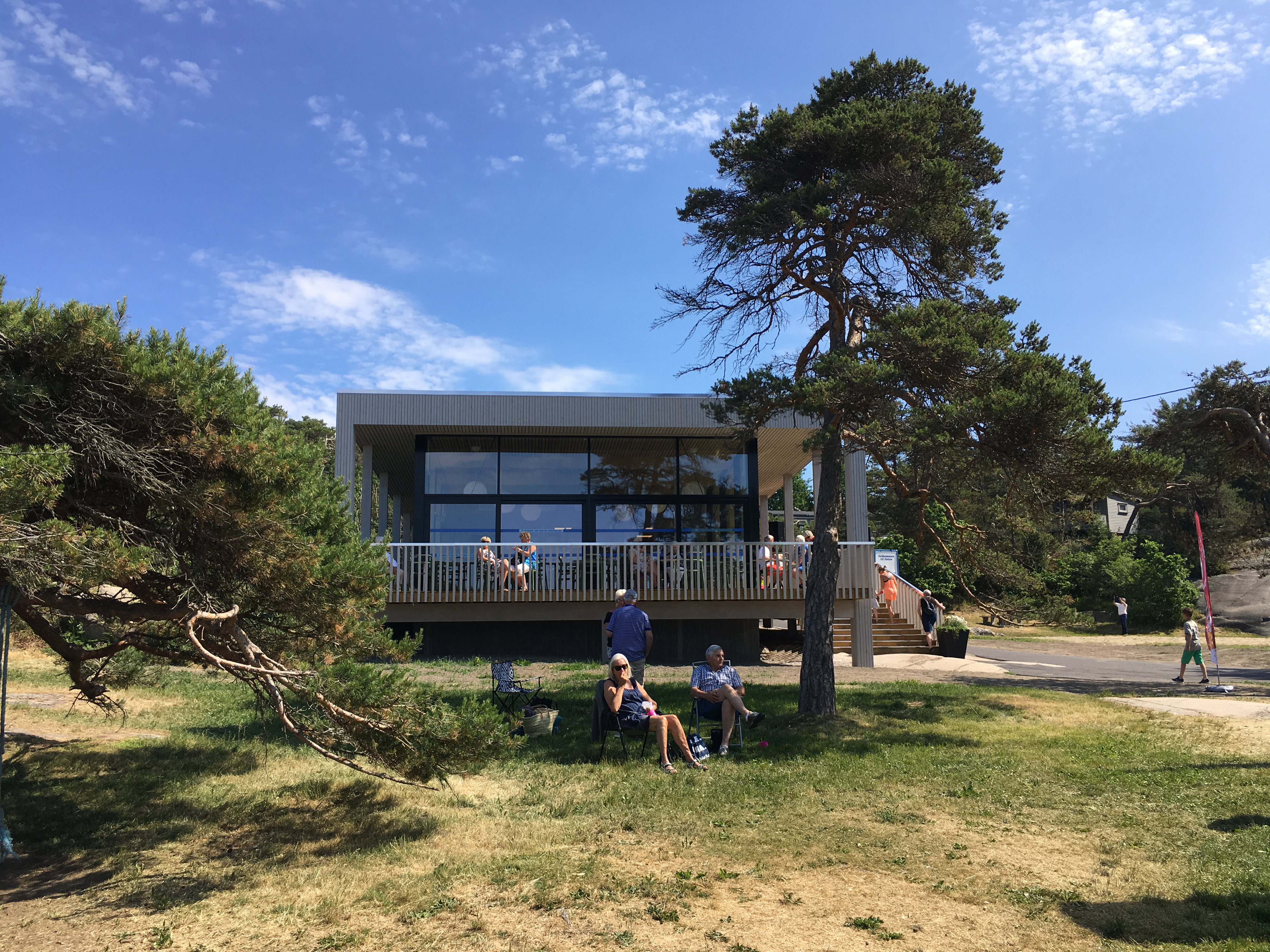 Fasade og rekkverk er ferdig gråpatinert trekledning, som smelter godt inn mot svaberg, sand og fjellknauser. Limtresøyler er behandlet for å skli sømløst inn mot det grå treverket. Kledningen består av fabrikkbehandlet, silisiumimpregnert treverk som allerede fra dag én har en grå patina. Materialet er miljøvennlig, tilnærmet vedlikeholdsfritt, og trenger ingen annen overflatebehandling enn regelmessig rengjøring.