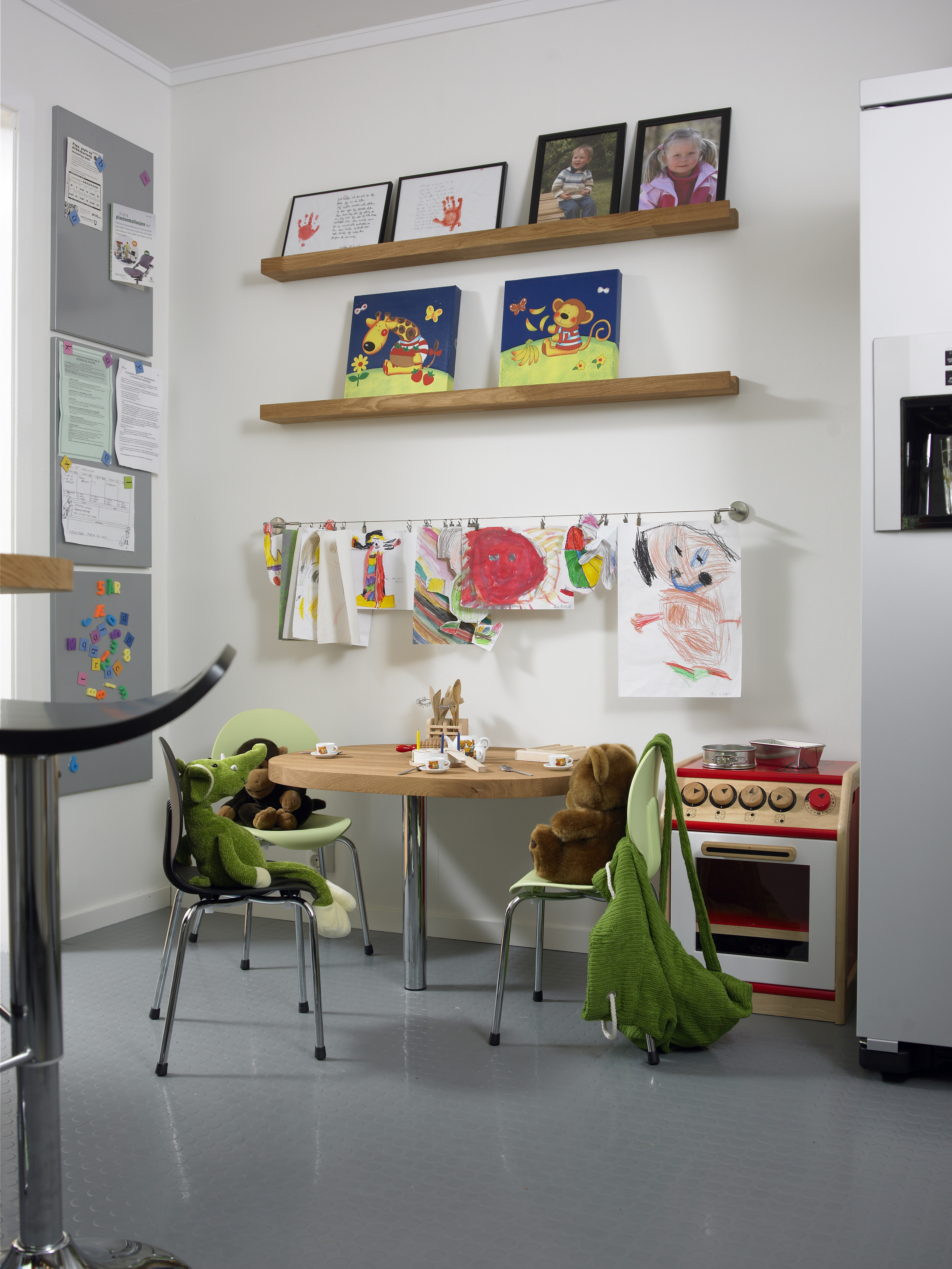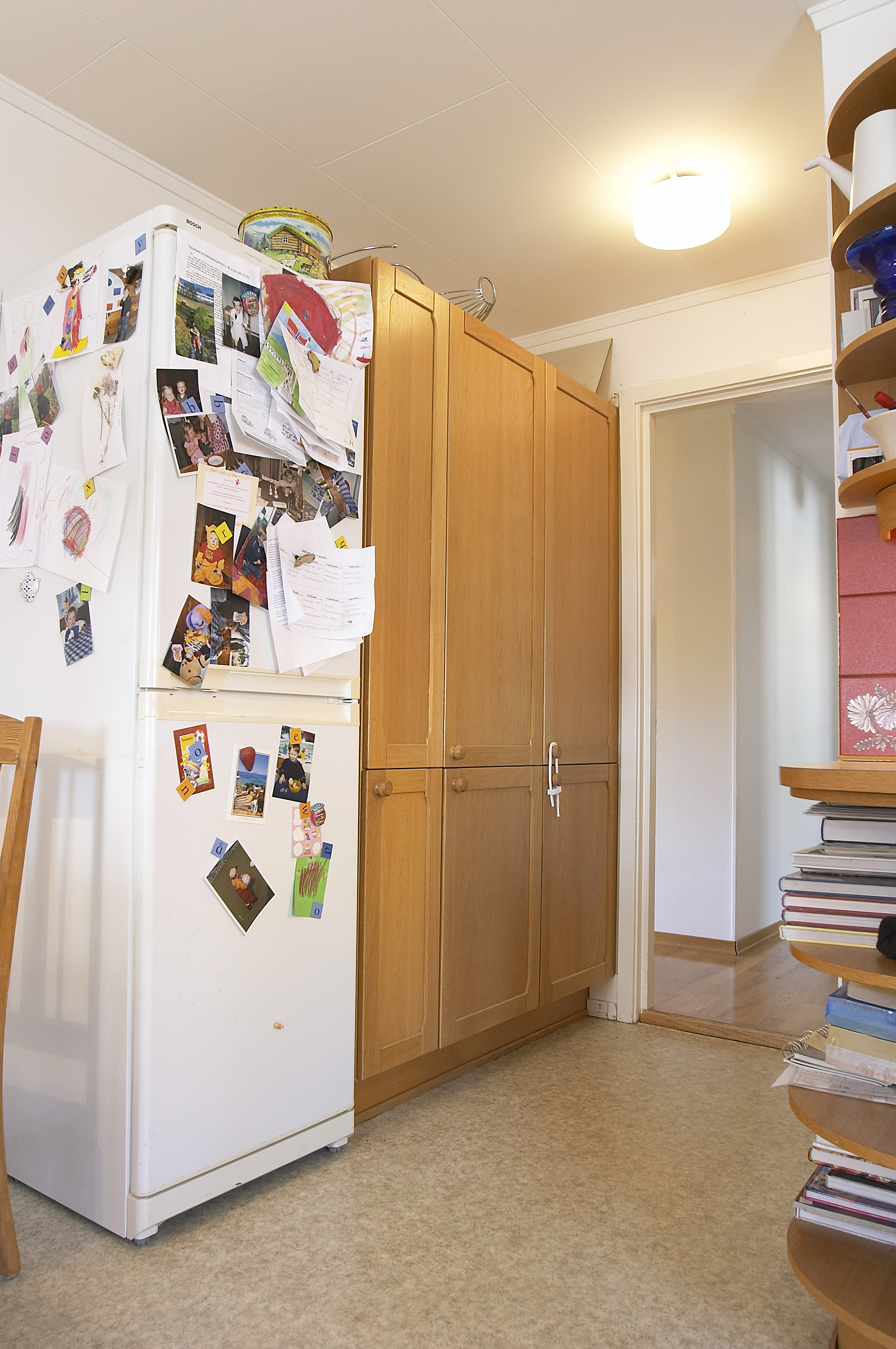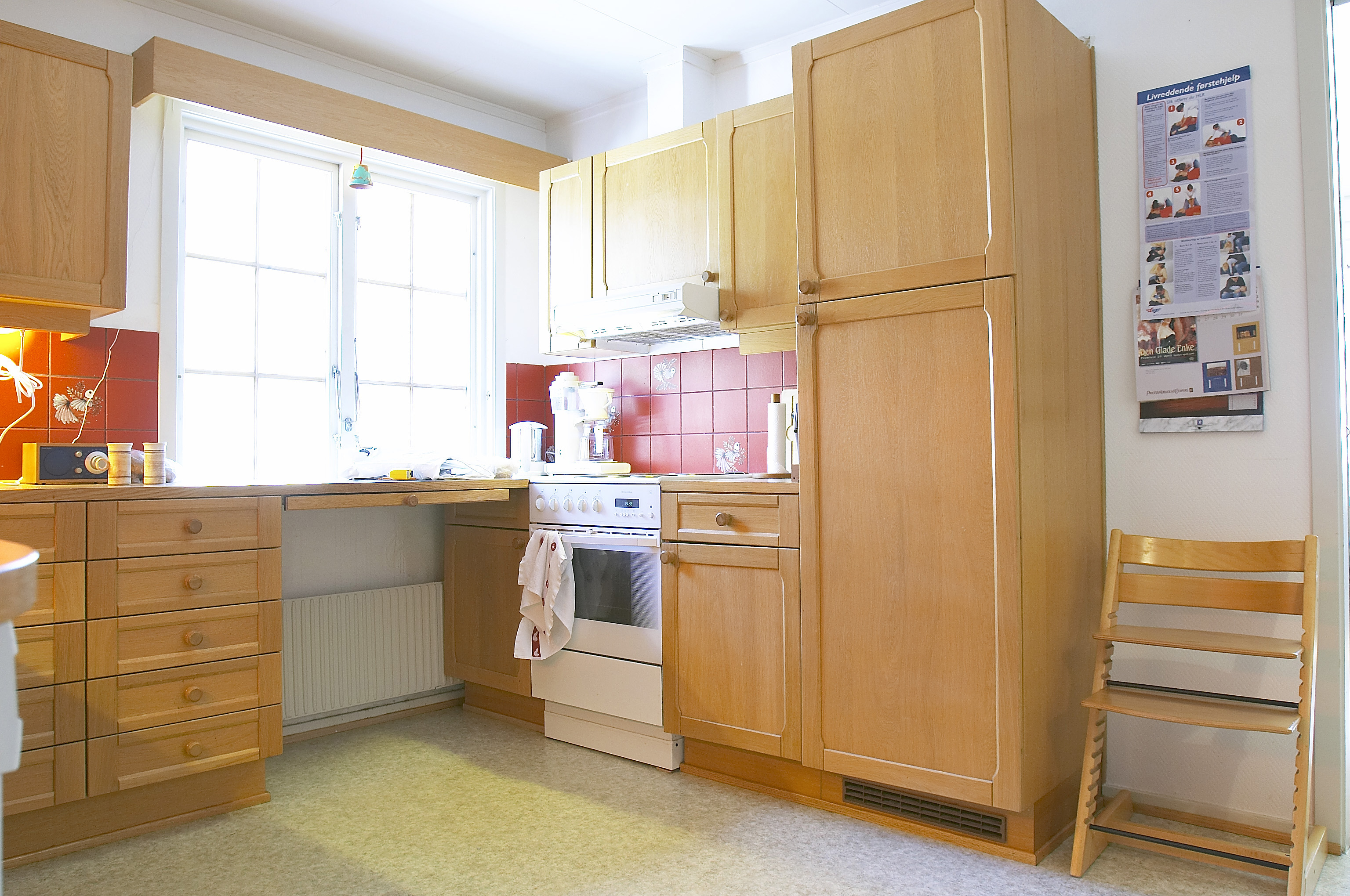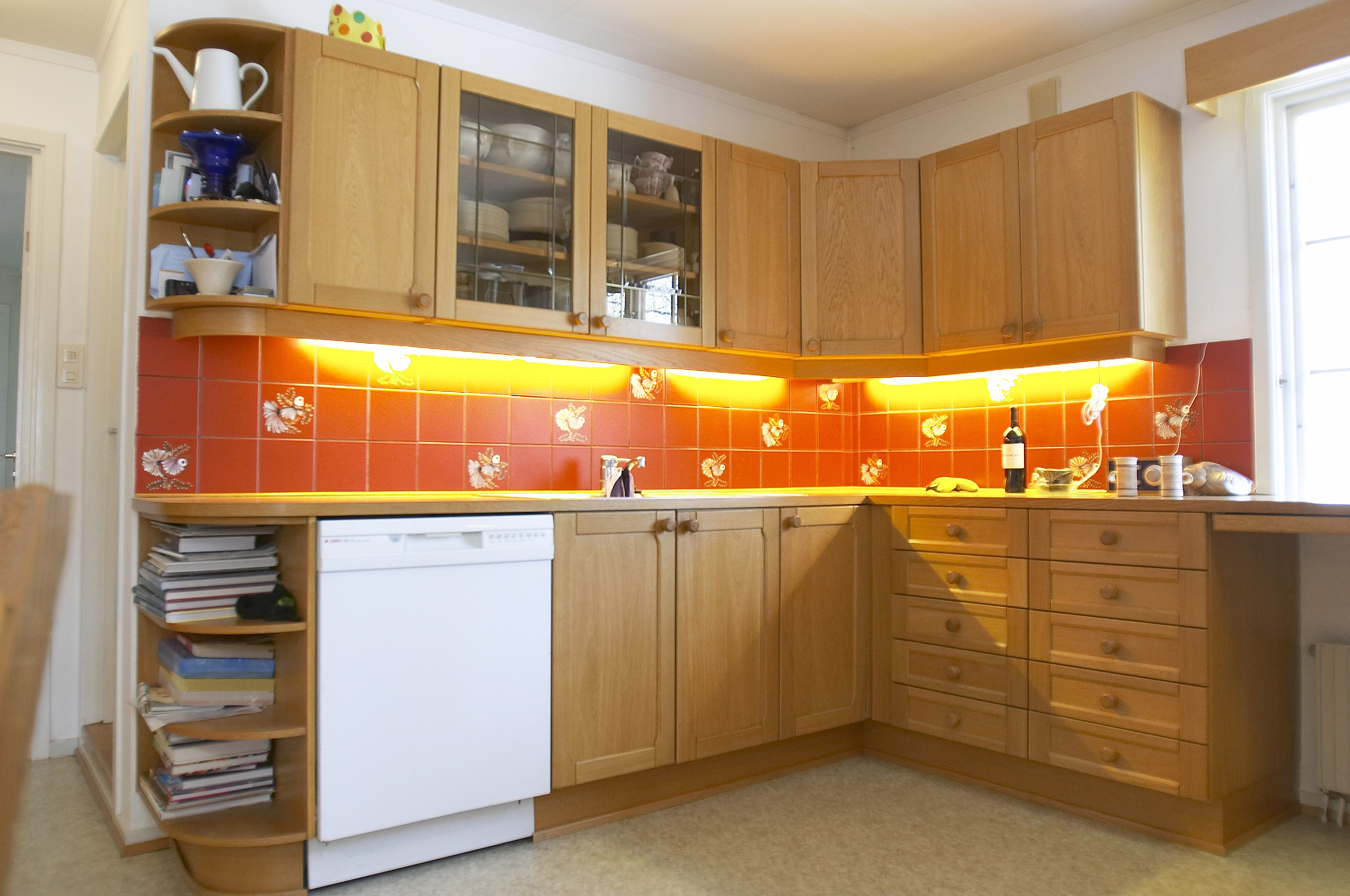 Spraglevinyl på gulvet, store fronter i eik, oransjerøde fliser med motiver