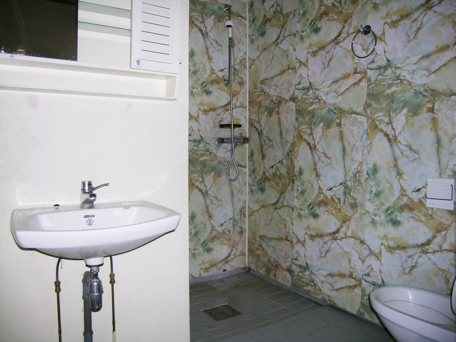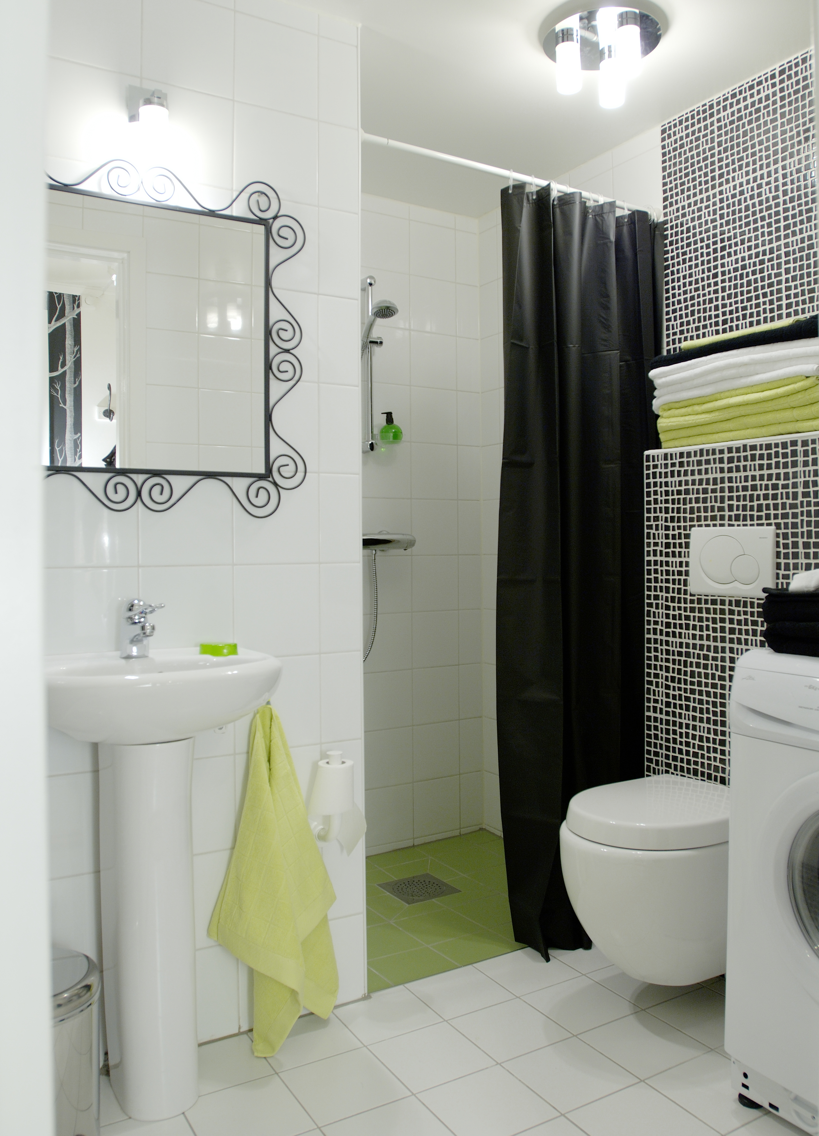Baderommet var gammelt og trist, med lite oppbevaring og trist belysning. Det ble lagt ny hvite fliser på gulv og vegger. På to veggger ble det brukt en tøff flis i sort og hvitt. For å kvikke det hele litt opp laget vi et knallgrønt gulv i dusjen.