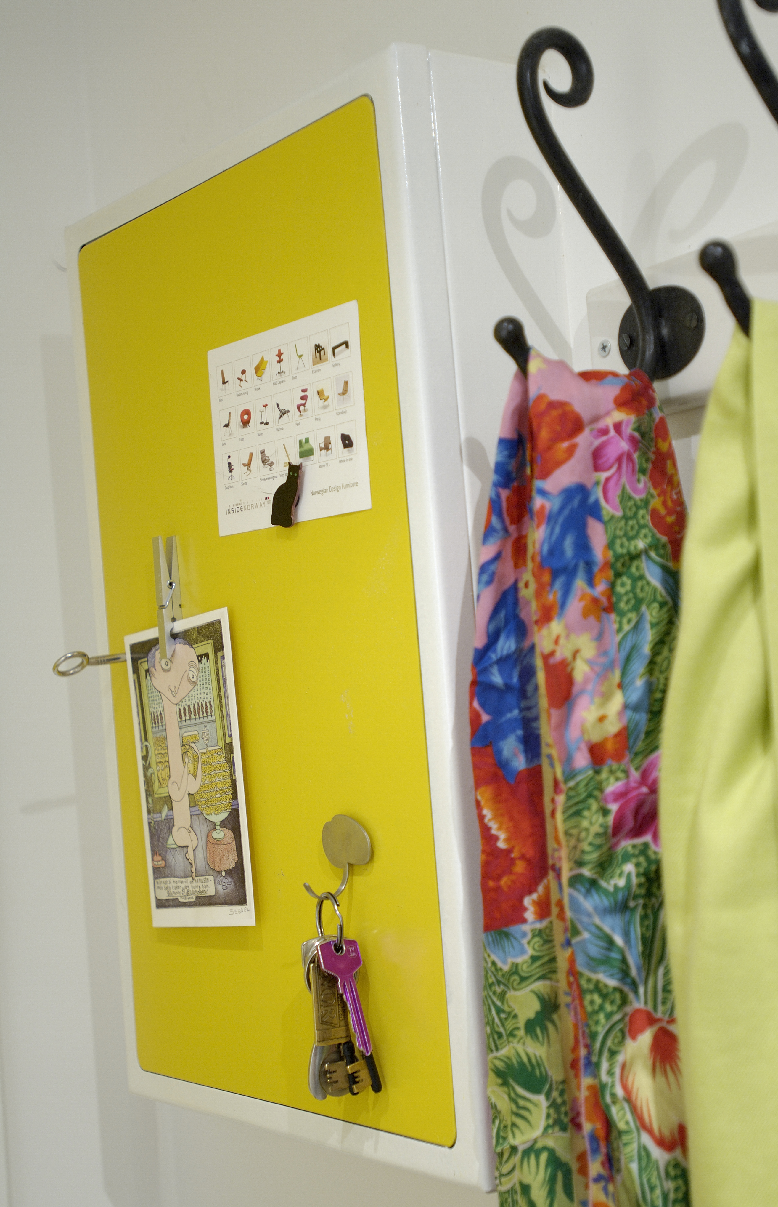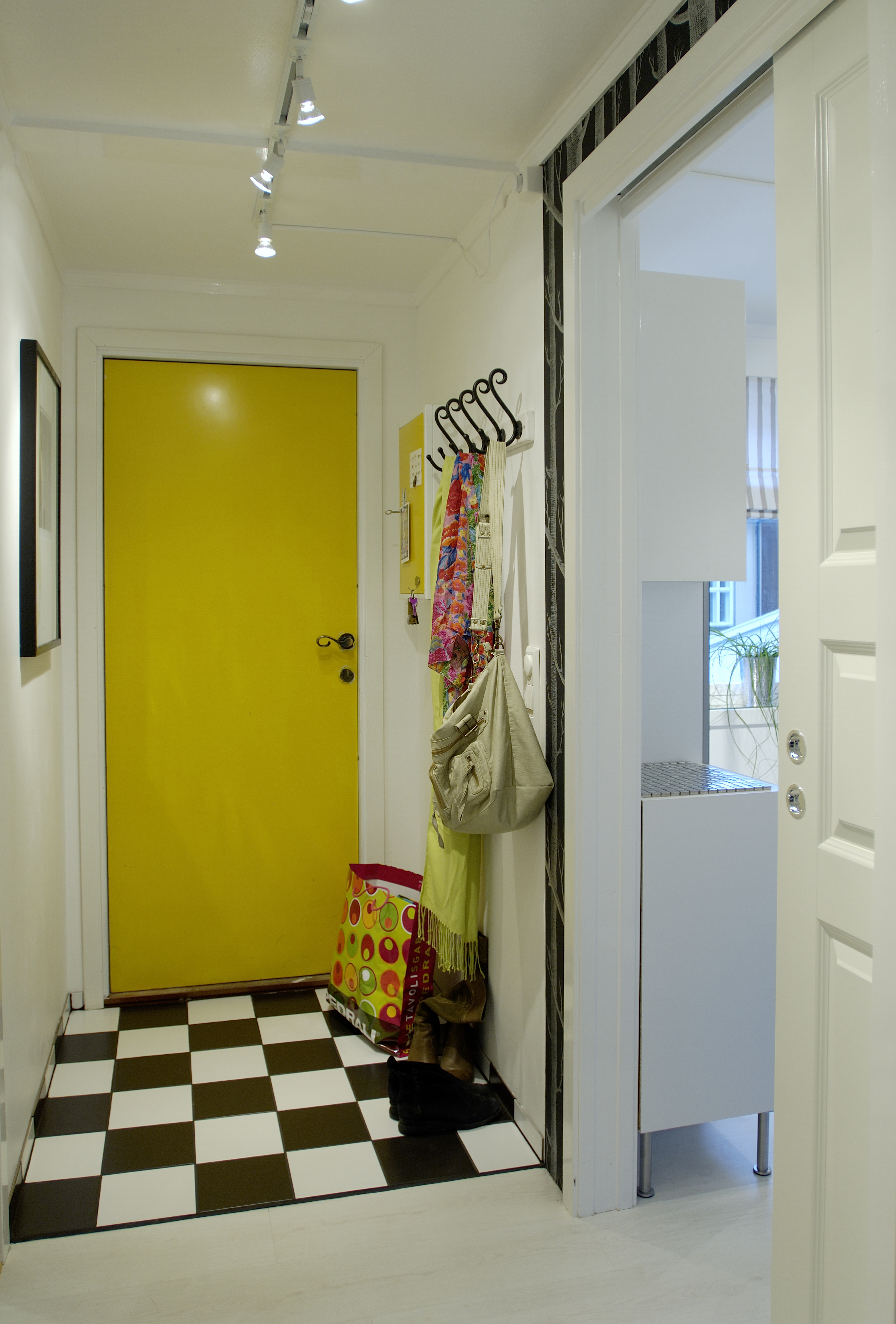 Vindfanget er markert med et annet gulvbelegg. Fliser tåler allverdens slitasje og er lett å vaske - så her er det lagt sorte og hvite fliser i sjakkmønster. Det ser hyggelig ut og signaliserer stilen i huset ellers. Døren er malt knallgul og gir en glad og munter velkomst.