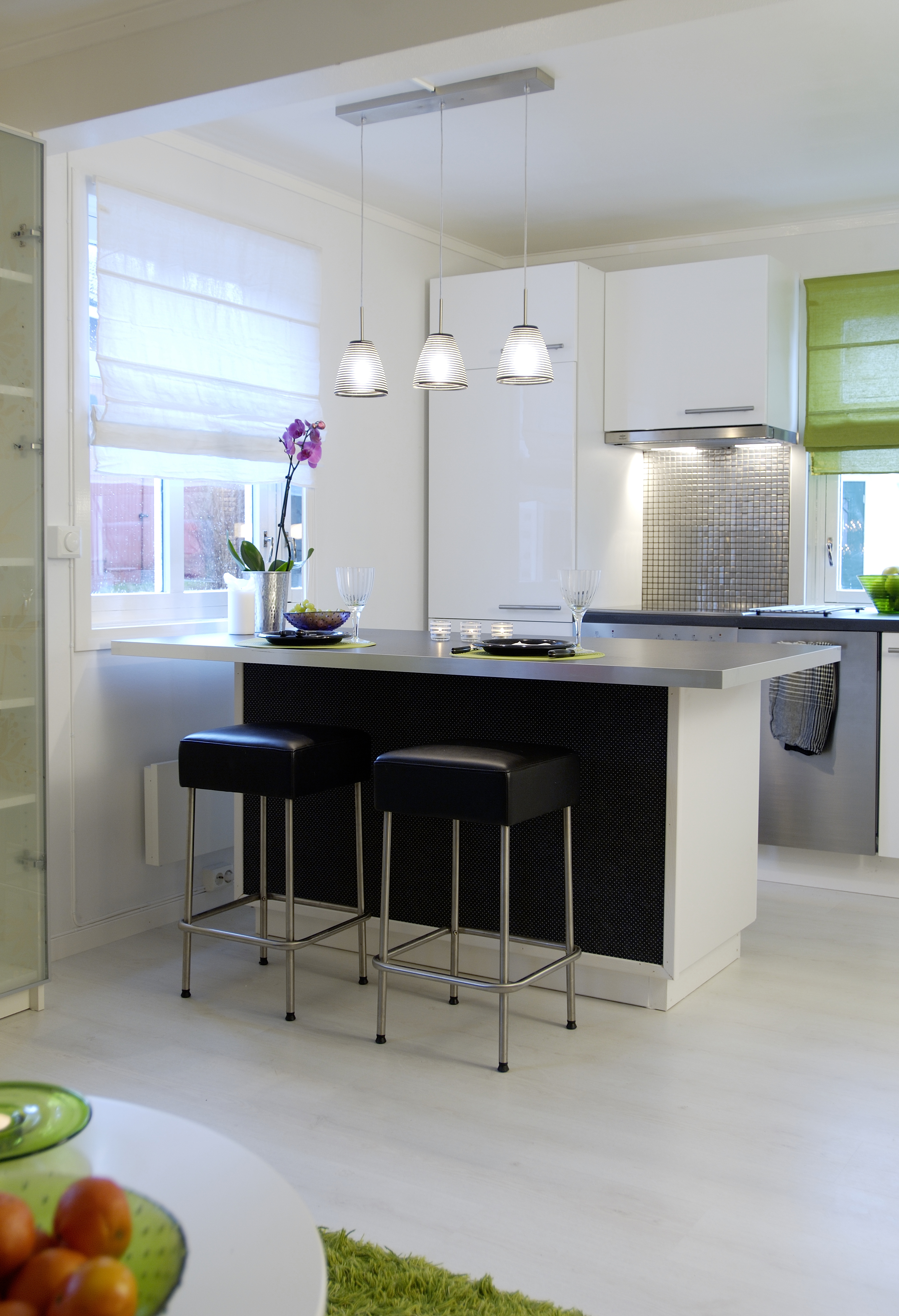 Kjøkkeninnredningen har hvite blanke fronter, både de, stålfrontene og mosaikken av stål reflekterer lyset. Få fargeinnslag gjør at kjøkkenkroken virker større enn den er.