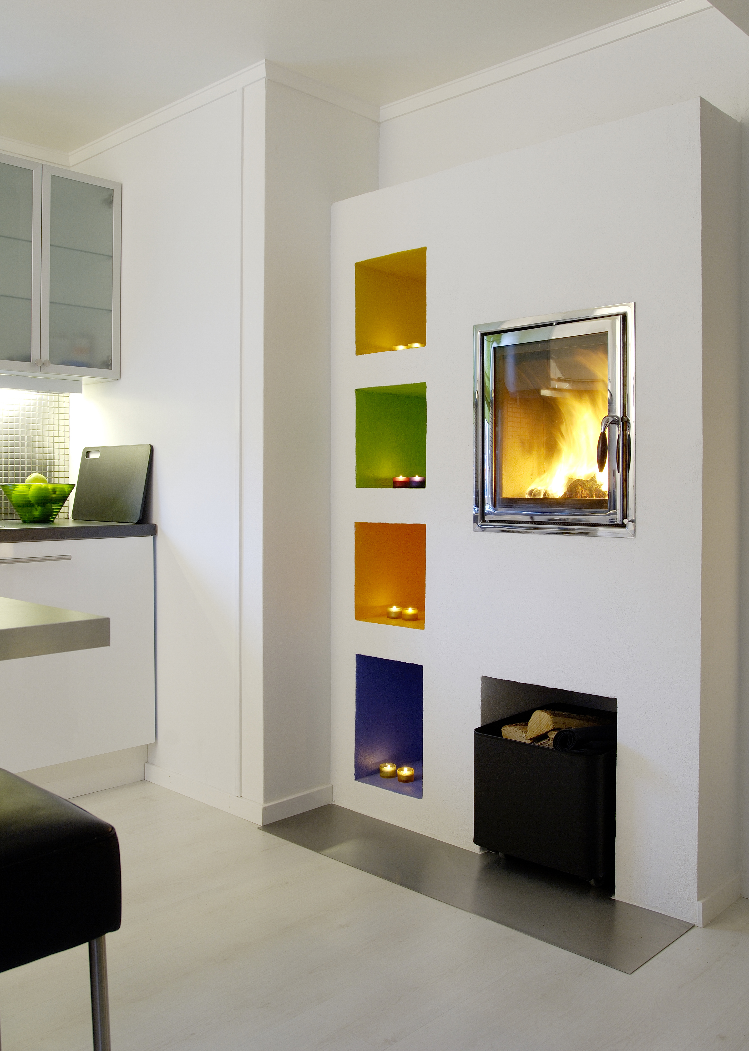 Peisen står i overgangen mellom kjøkken og stuekroken. Den er murt opp som en enkel blokk, og har innsats med glass. Det betyr at peisbålet er godt synlig fra hele rommet, og det er en effektiv varmekilde. Ved siden av er det murt fire nisjer, som er malt i klare farger som går igjen ellers. Når det settes levende lys her så gløder det over hele rommet. Praktisk er det også med en nisje til vedkurven som trilles inn.