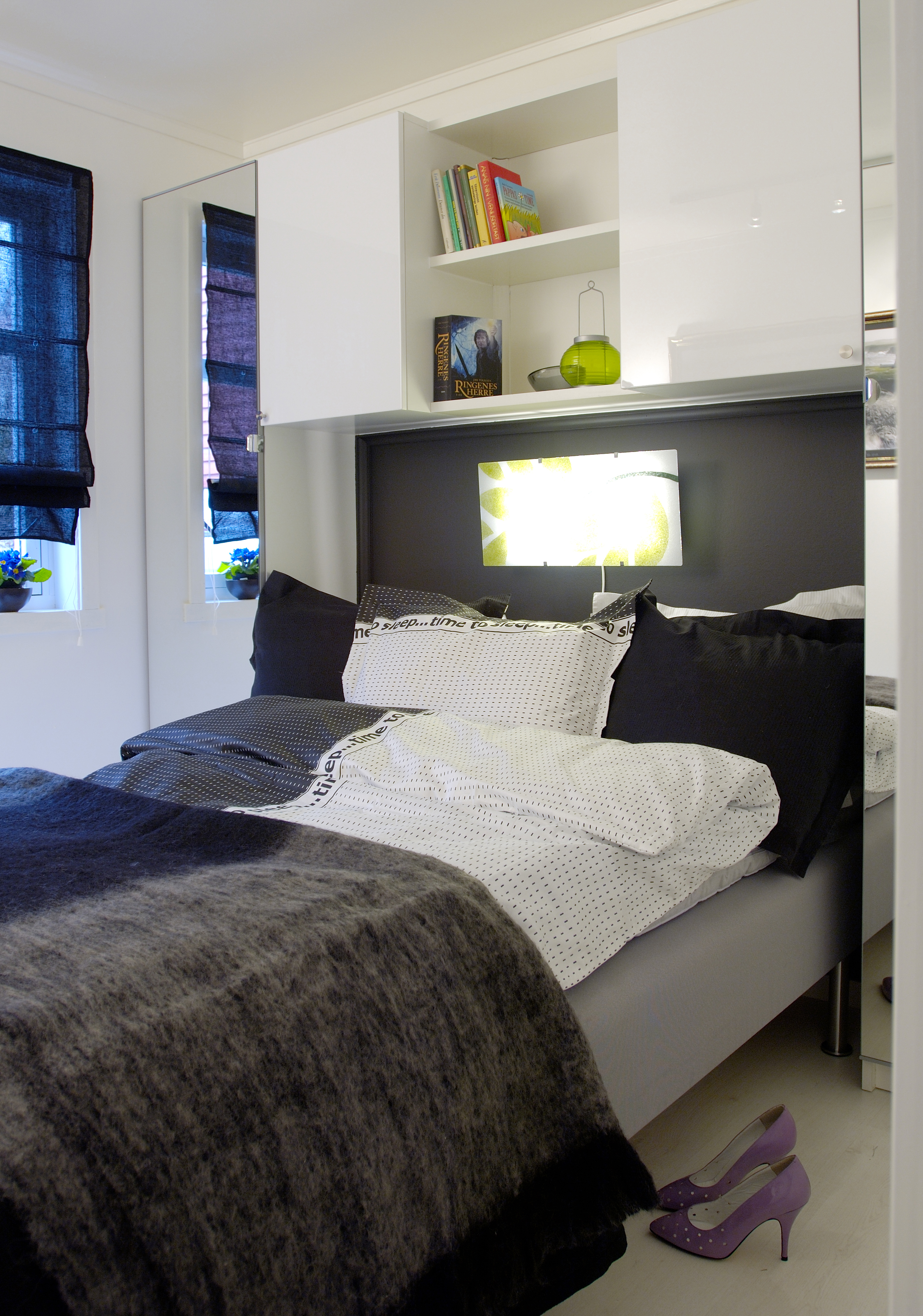 Veggen mellom skap og seng er malt mørk grå - det gir en illusjon av et hodegjerde. Under sengen er plassen utnyttet til sengeskuffer.