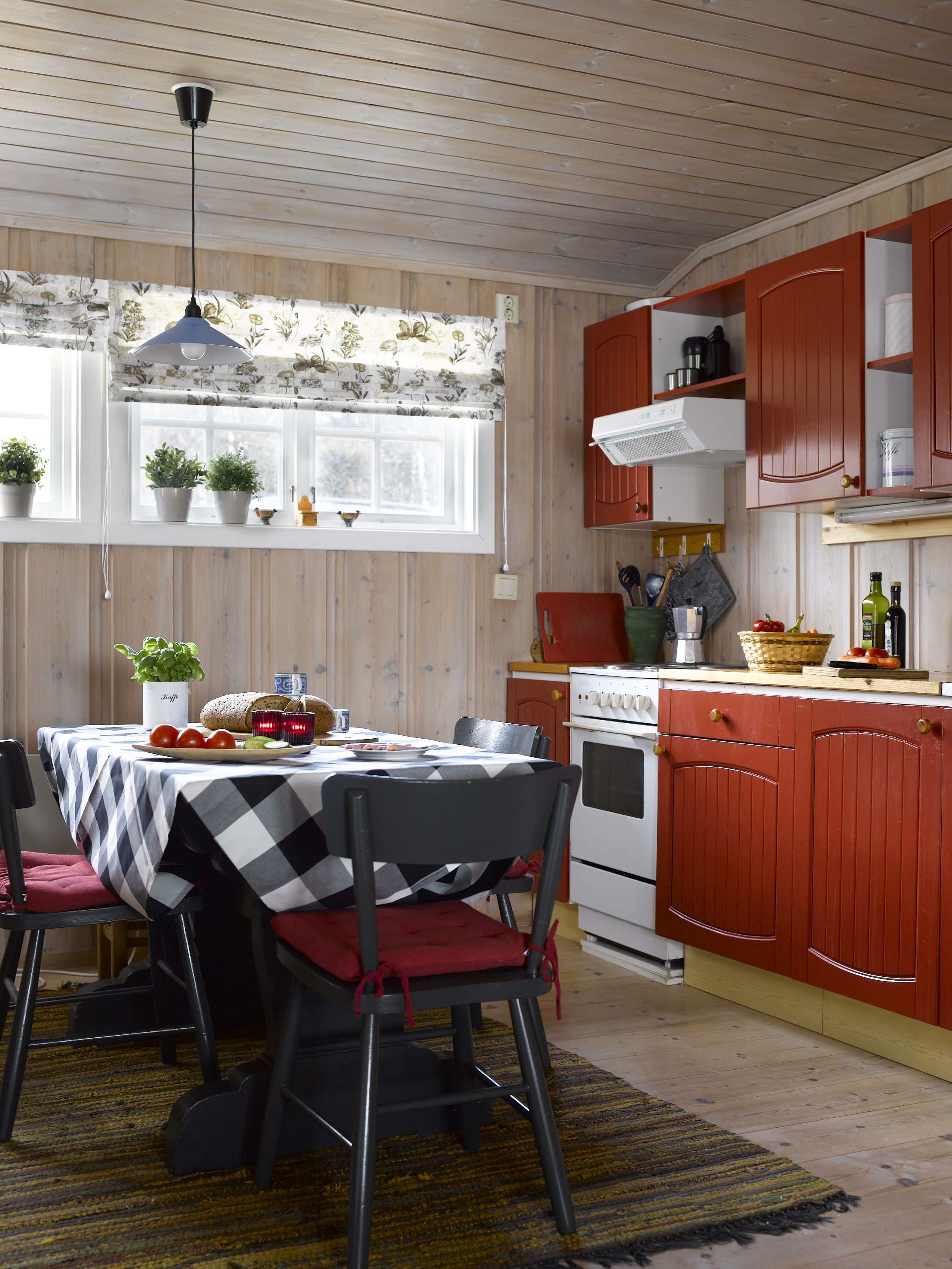 Det er ikke alltid man trenger å lete så lenge eller så hardt for å finne inspirasjon til en farge. Den varme, kraftfulle rødfargen som er brukt her har nemlig sitt utspring i tallerkendekoren. Den falt familien for, og dermed var det avgjort. Så enkelt kan det altså gjøres! Kjøkkeninnredning, skatoll og tallerkenhylle er malt i samme farge, som vi finner igjen i teppene i hytta.